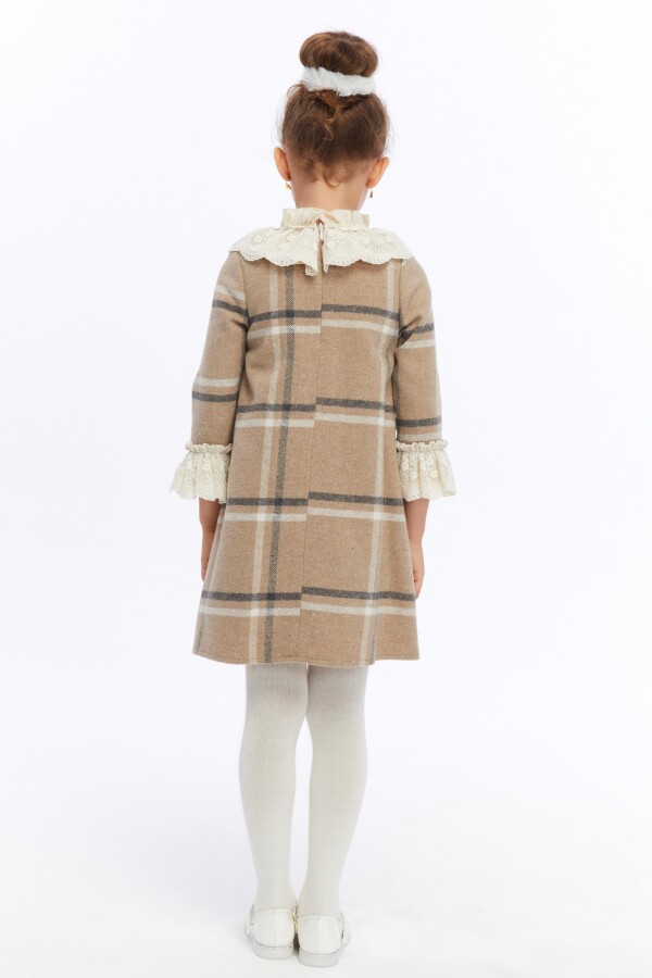 Bu şık kız çocuk elbisesi, kış ayları için ideal bir seçimdir. Uzun kollu ve diz hizasında midi boyda olan elbise, kahverengi ve bej tonlarında ekose desenlere sahiptir. Elbisenin en dikkat çekici detayları, önünde ve kol uçlarında bulunan zarif krem dantel fırfırlar ve süslü düğmeleridir. Sıfır yaka tasarımıyla klasik ve zarif bir görünüm sunar. Günlük veya özel davetlerde rahatlıkla tercih edilebilir.