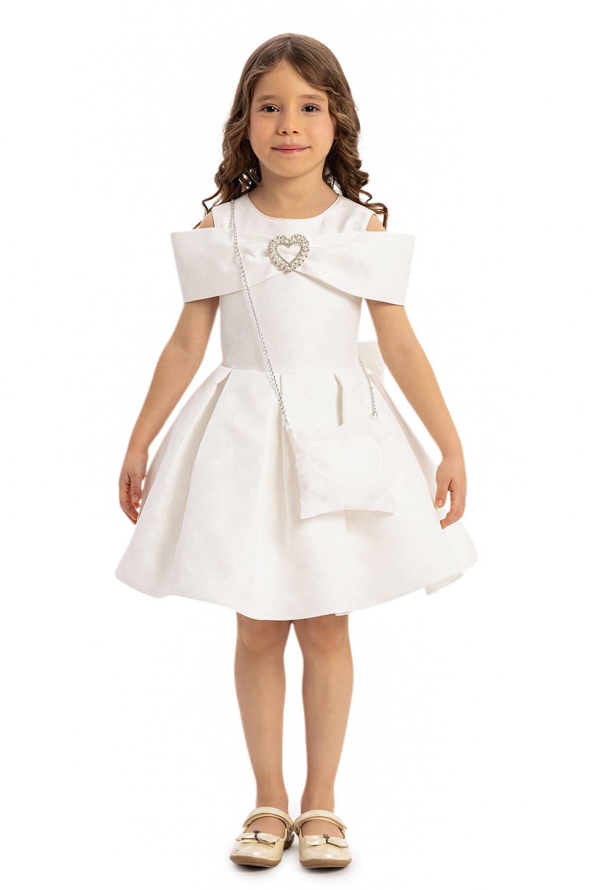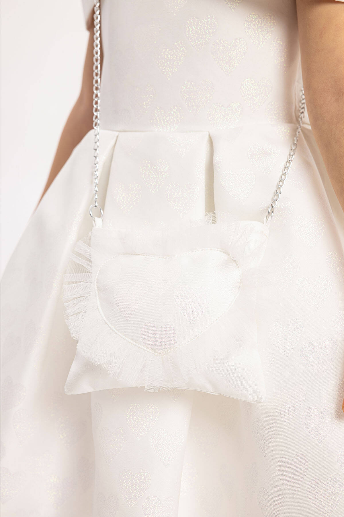 This elegant girls' dress is a perfect choice for special occasions. Its white fabric adorned with heart patterns offers a charming look, while the wide neckline and flared skirt draw attention. The accompanying small bag adds a touch of style.