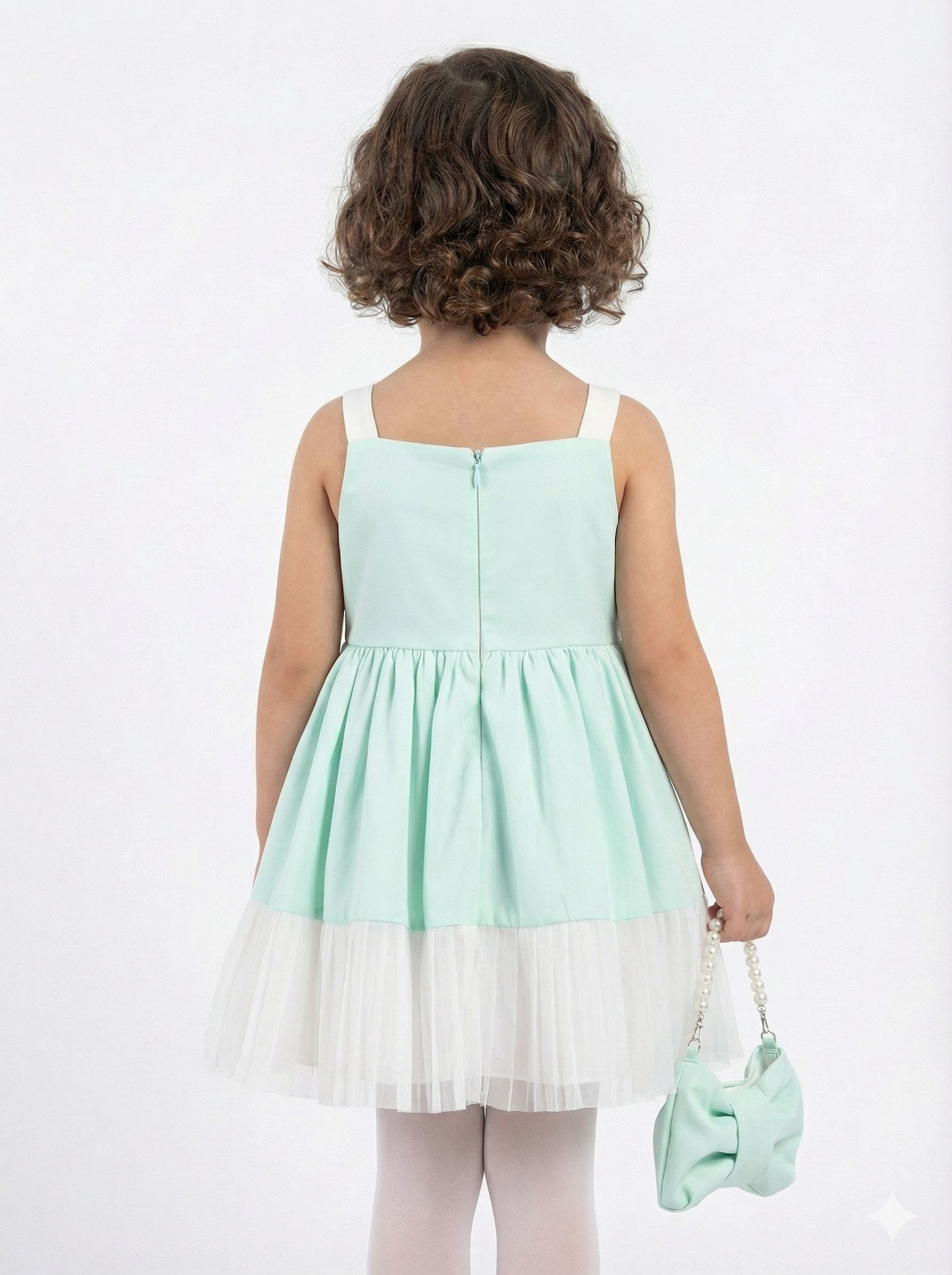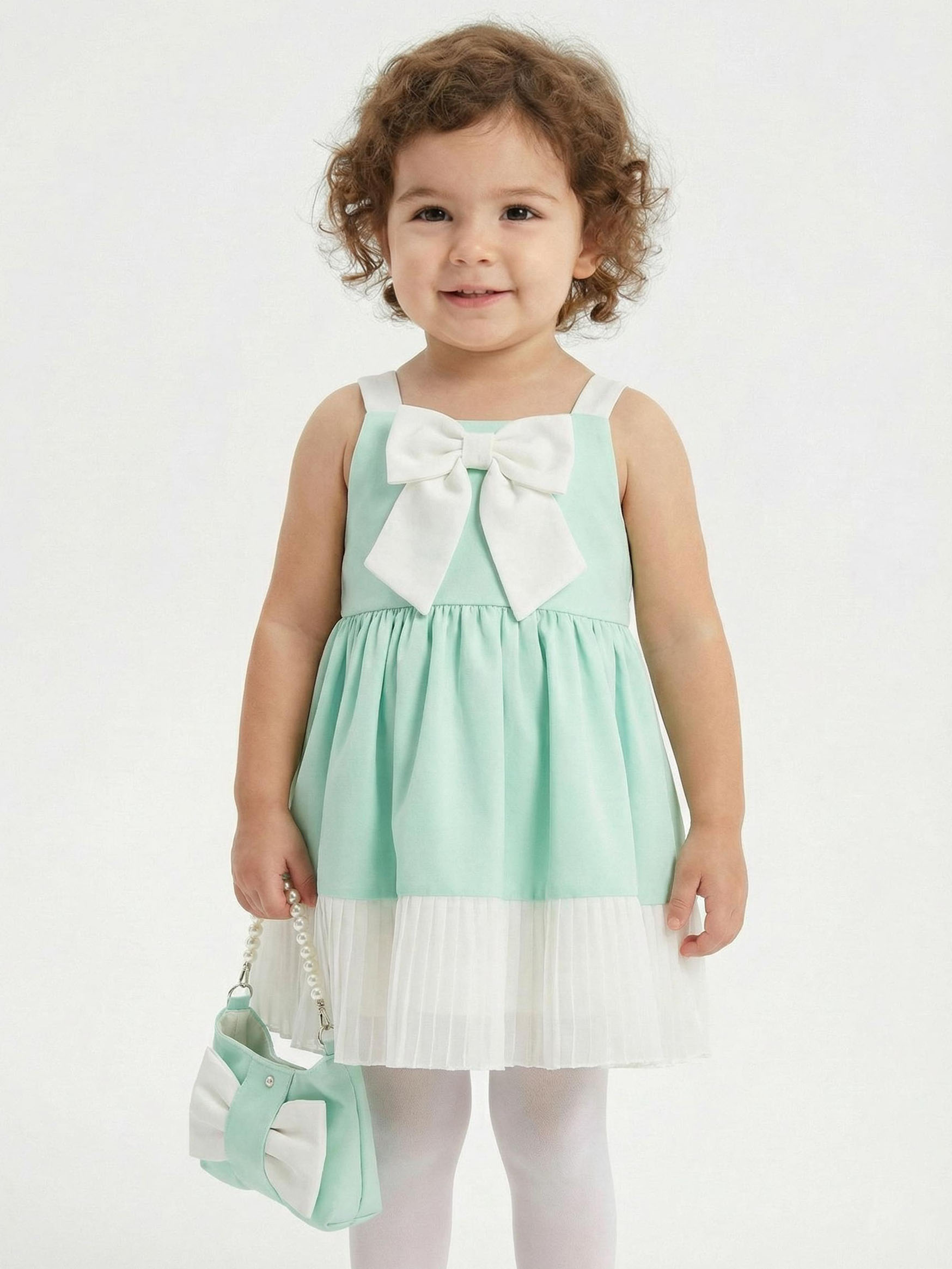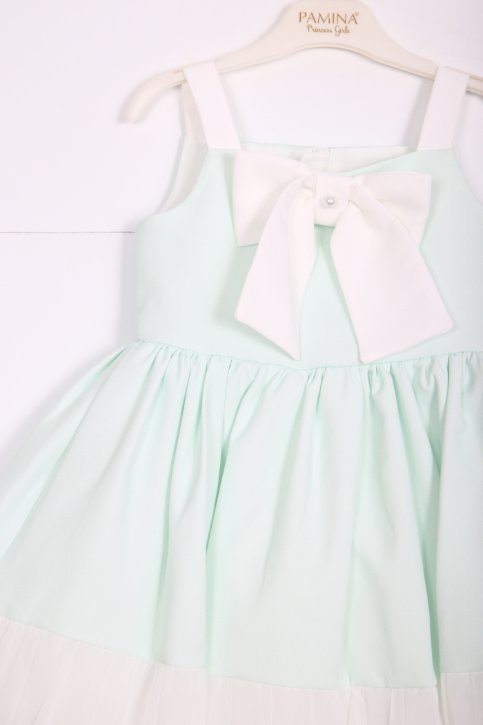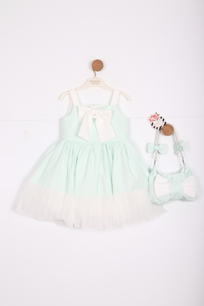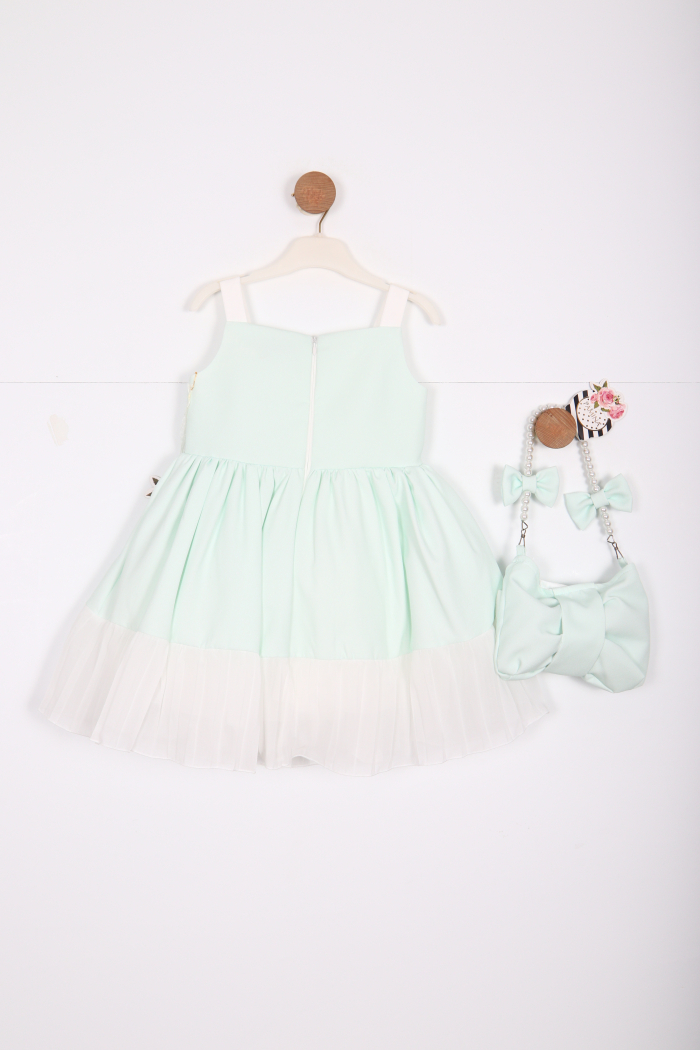 Bu şirin kıyafet, yaz aylarının neşesini yansıtan mint yeşili tonu ile kız çocuklar için mükemmel bir seçimdir. Sade ama şık tasarımı, hem günlük hem de özel günlerde giyilebilir. Üzerindeki büyük beyaz kurdele, elbisenin zarif görünümüne katkıda bulunur.