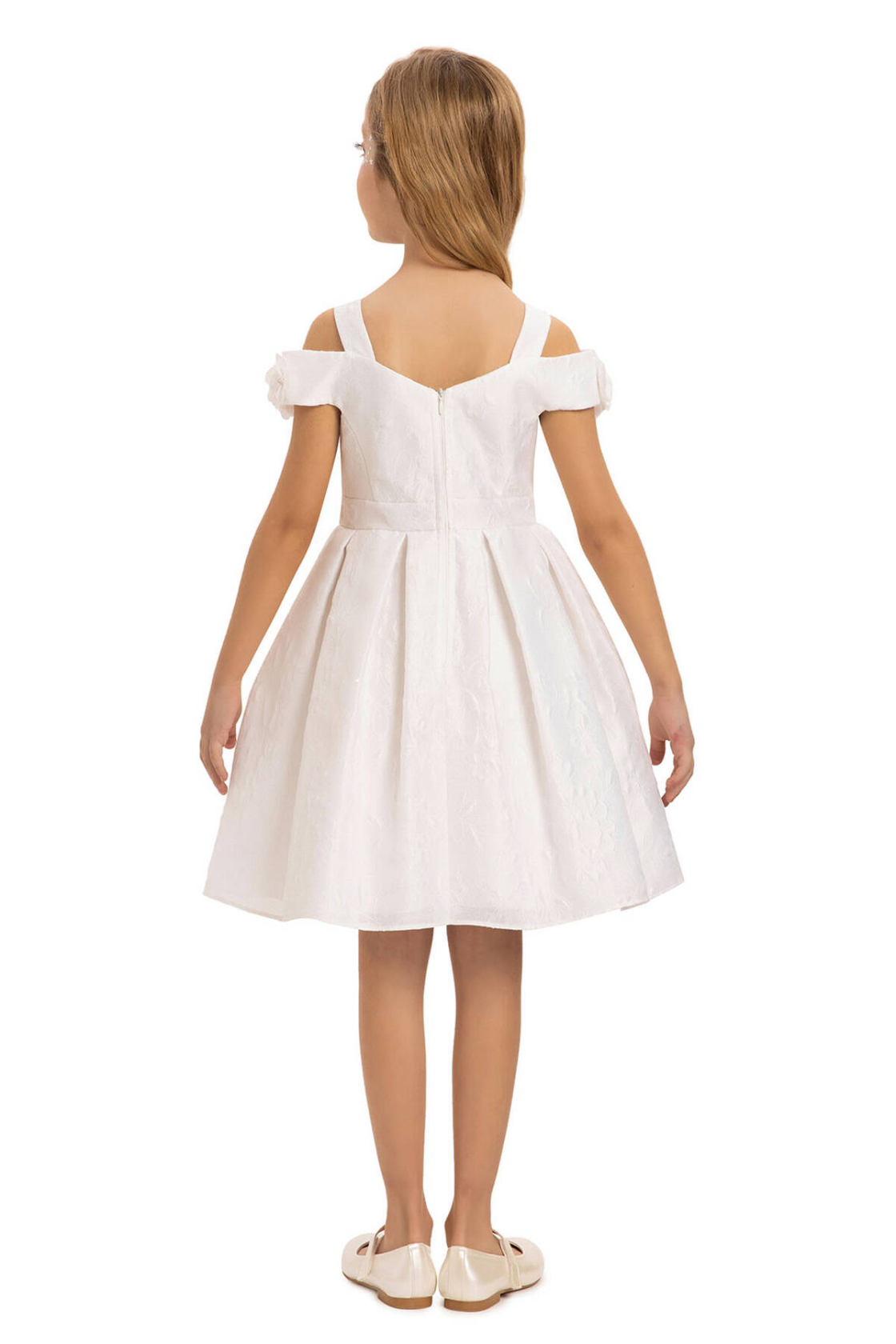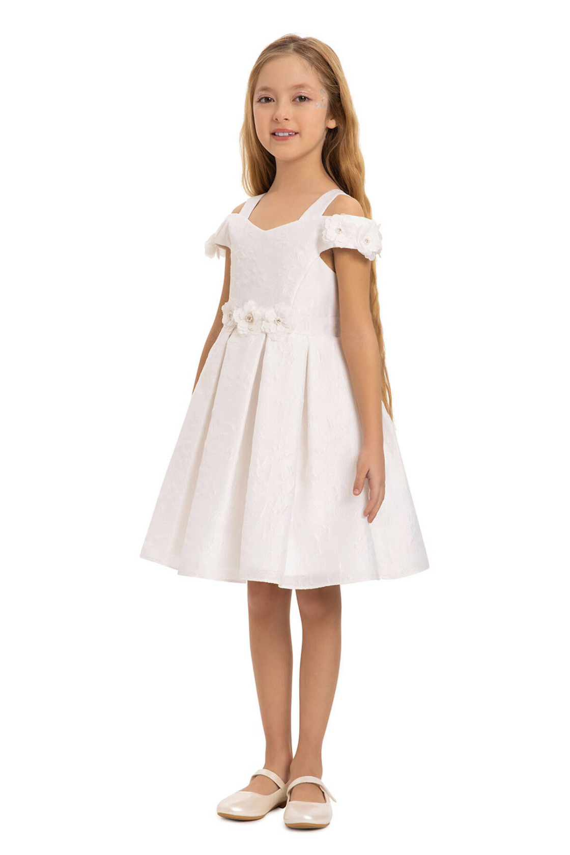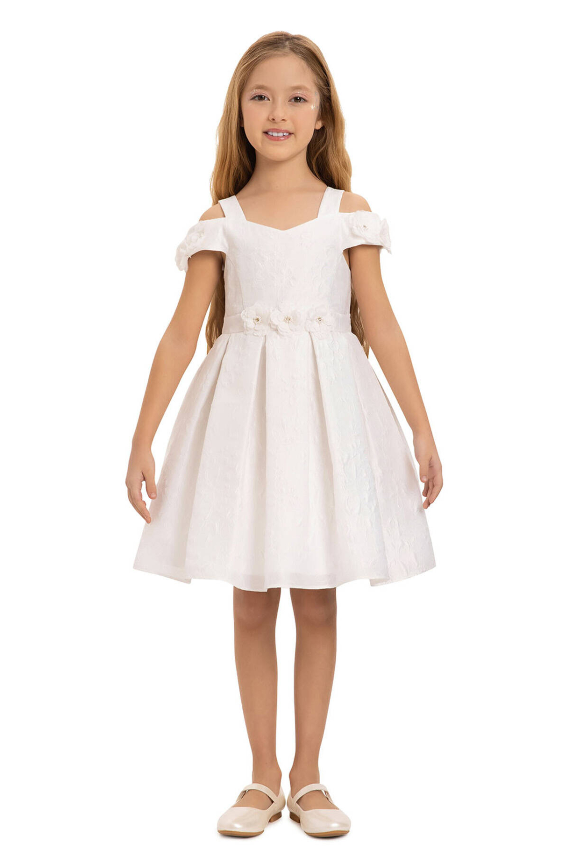 Bu şık kız çocuk elbisesi, özel günler ve davetler için mükemmel bir tercihtir. Pudra renginde, zarif çiçek işlemeleri ile süslenmiş olan elbise, omuzları açık ve askılı tasarımıyla dikkat çekiyor. Kumaşında hafif kabartmalı doku bulunan elbise, bele oturan ve pileli etek detayıyla zarif bir duruş sergiliyor.