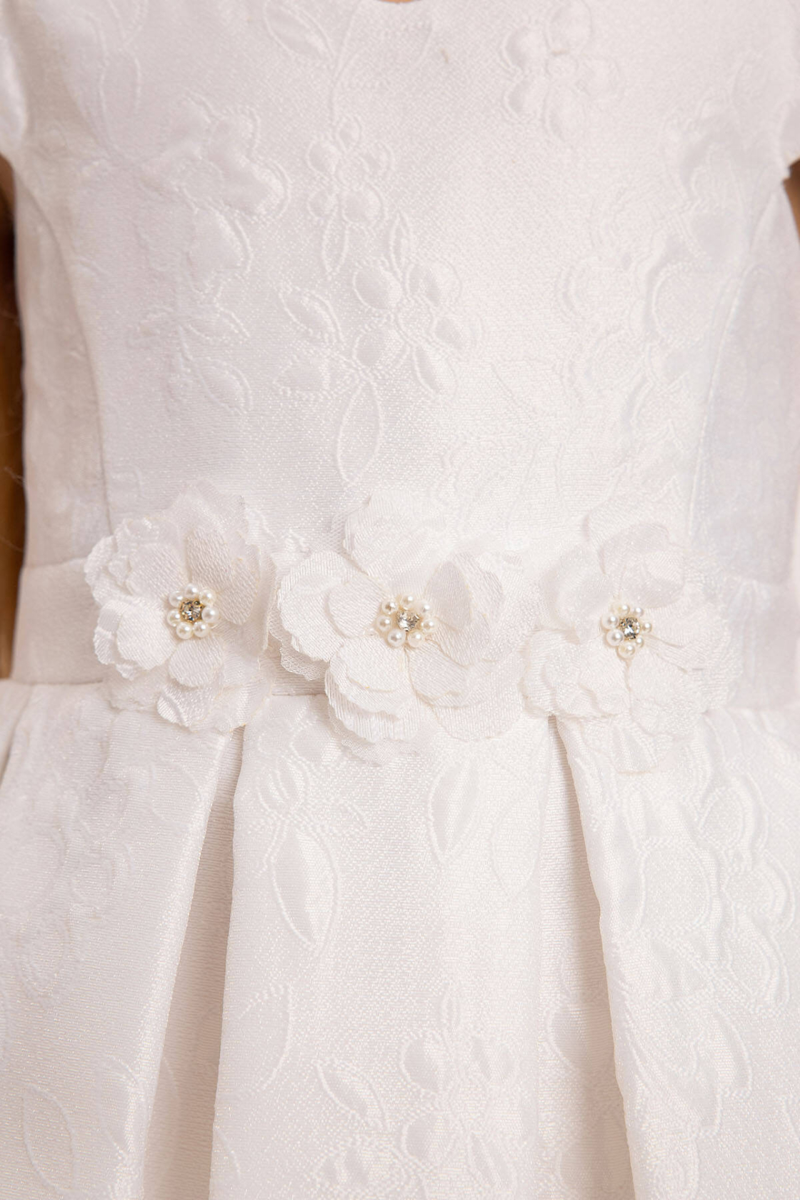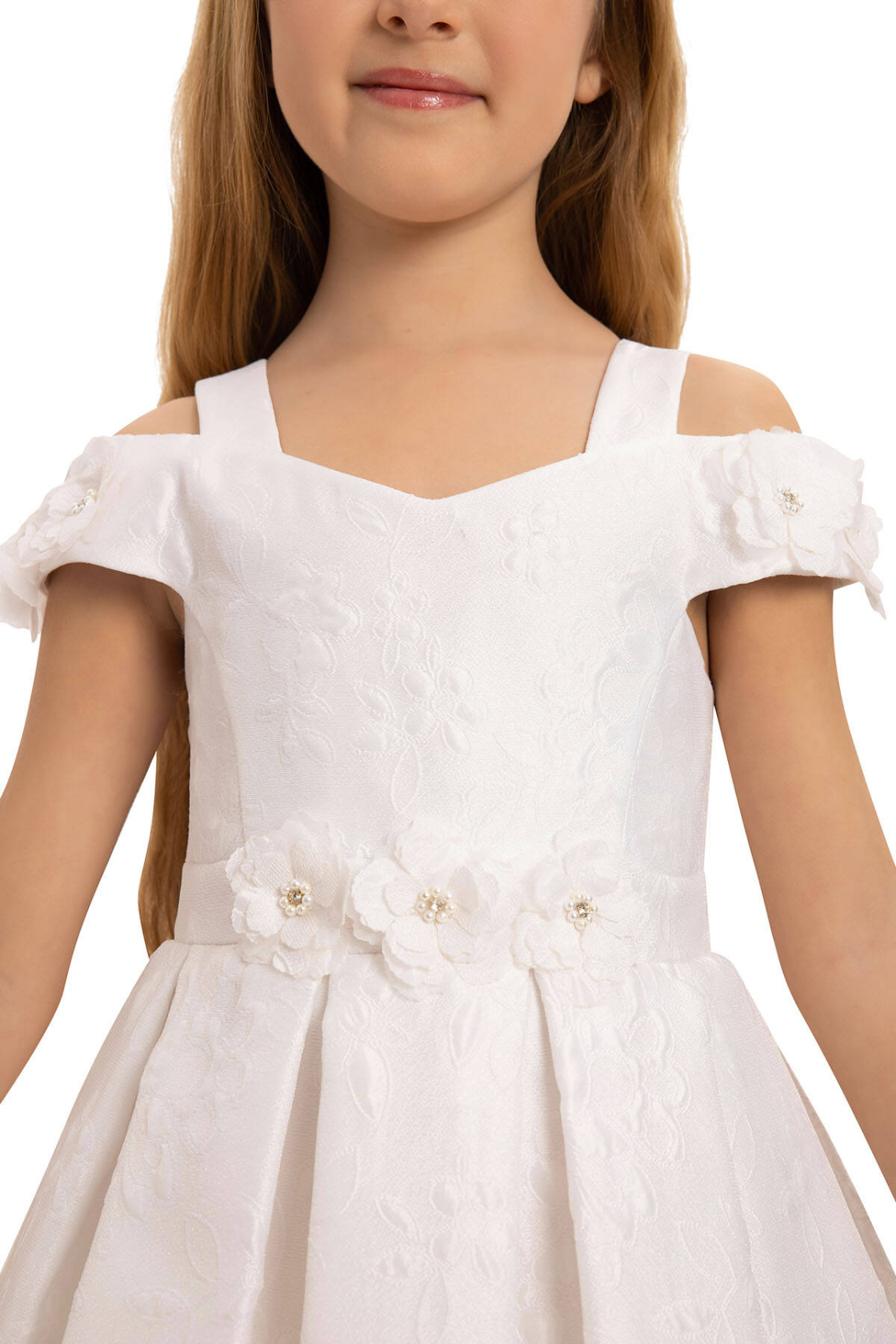 - Omuzlarda ve belde inci detaylı 3D çiçek süslemeleri
