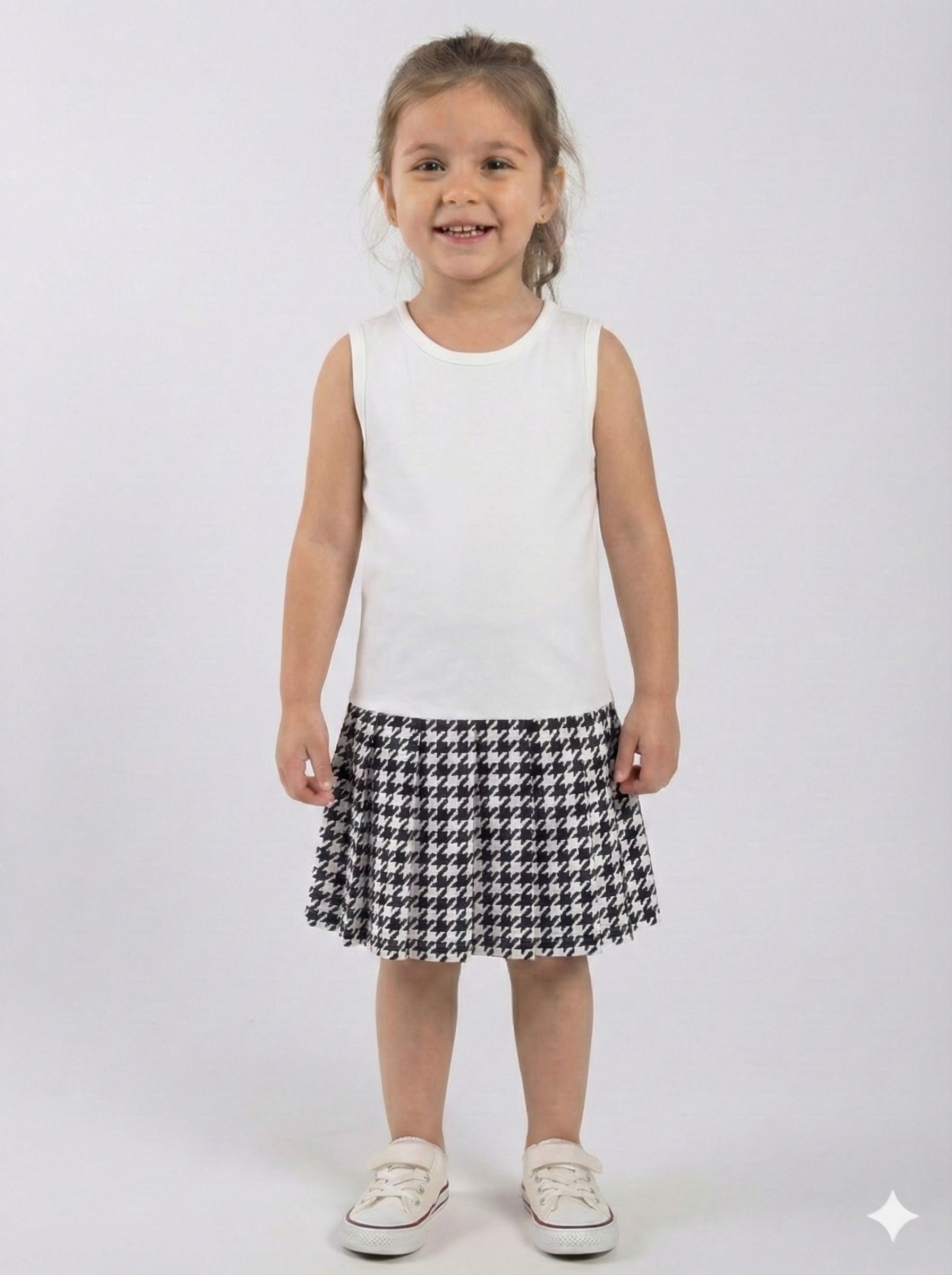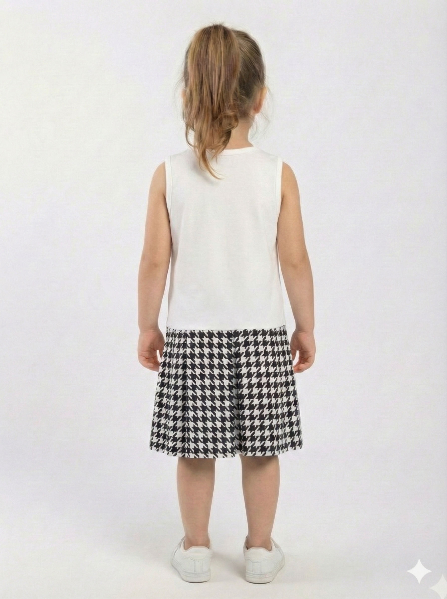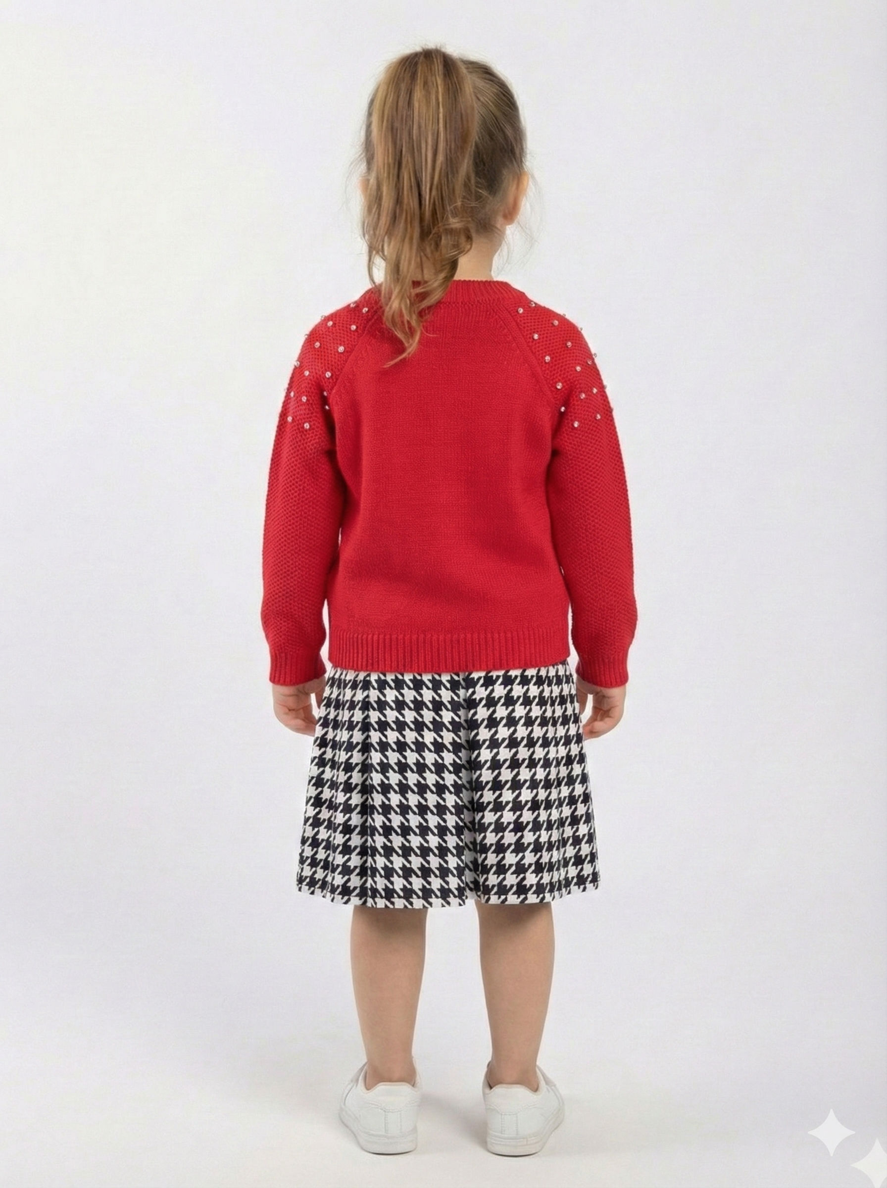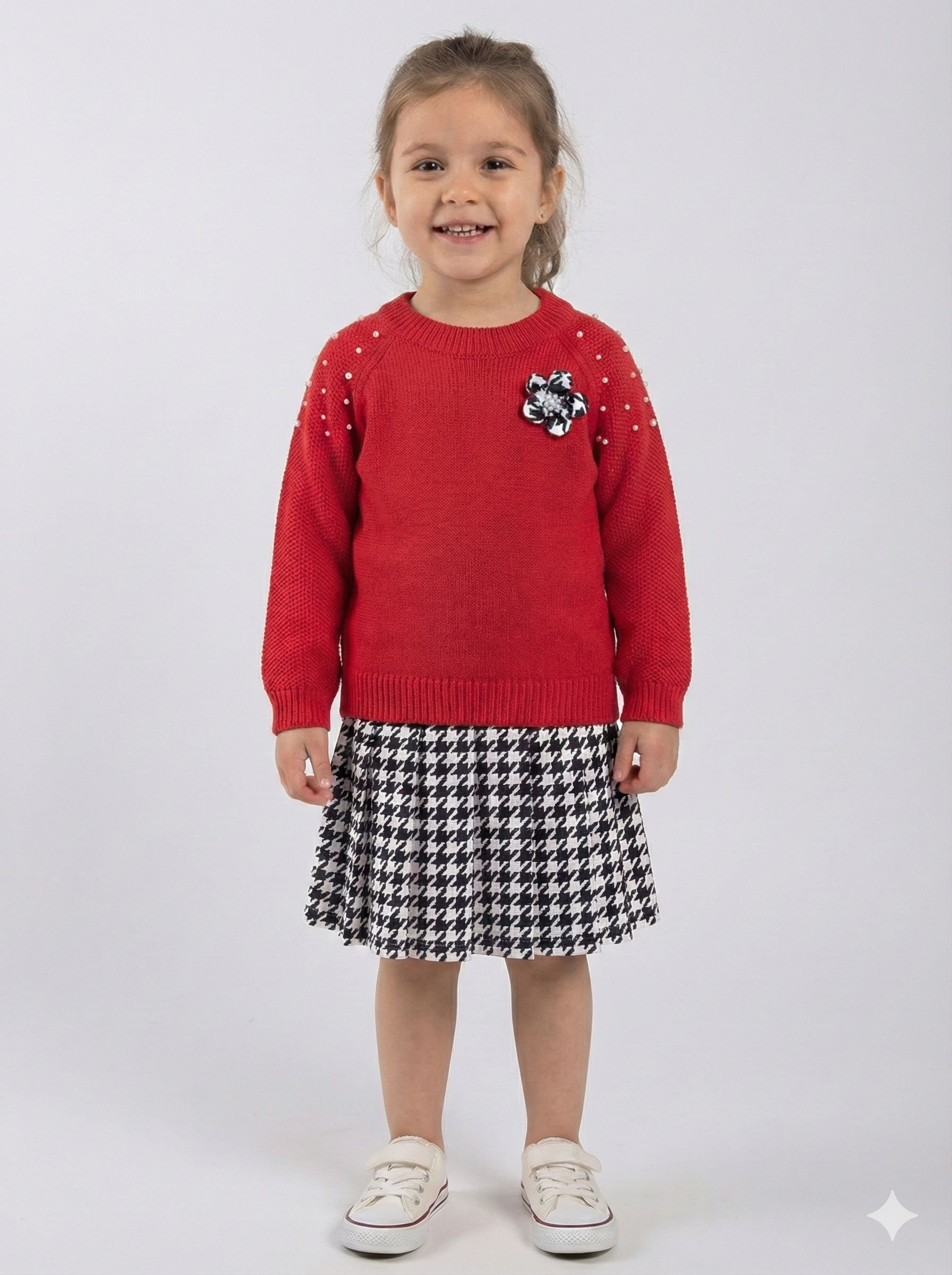 Bu kız çocuk elbisesi, kış aylarında sıcak tutacak şık ve rahat bir seçenek sunar. Üst kısmı kırmızı renkte, uzun kollu ve yuvarlak yaka tasarıma sahip yumuşak bir triko kazaktan oluşur. Omuz ve kollarda minik inci detayları ile süslenmiş, dikkat çekici bir görünüm sağlar. Kazak üzerinde siyah-beyaz desenli küçük bir çiçek aksesuarı yer alır. Alt kısmı ise klasik kazayağı desenli, pileli midi boy etekten oluşur. Kombin, rahat beyaz spor ayakkabılarla tamamlanmıştır.