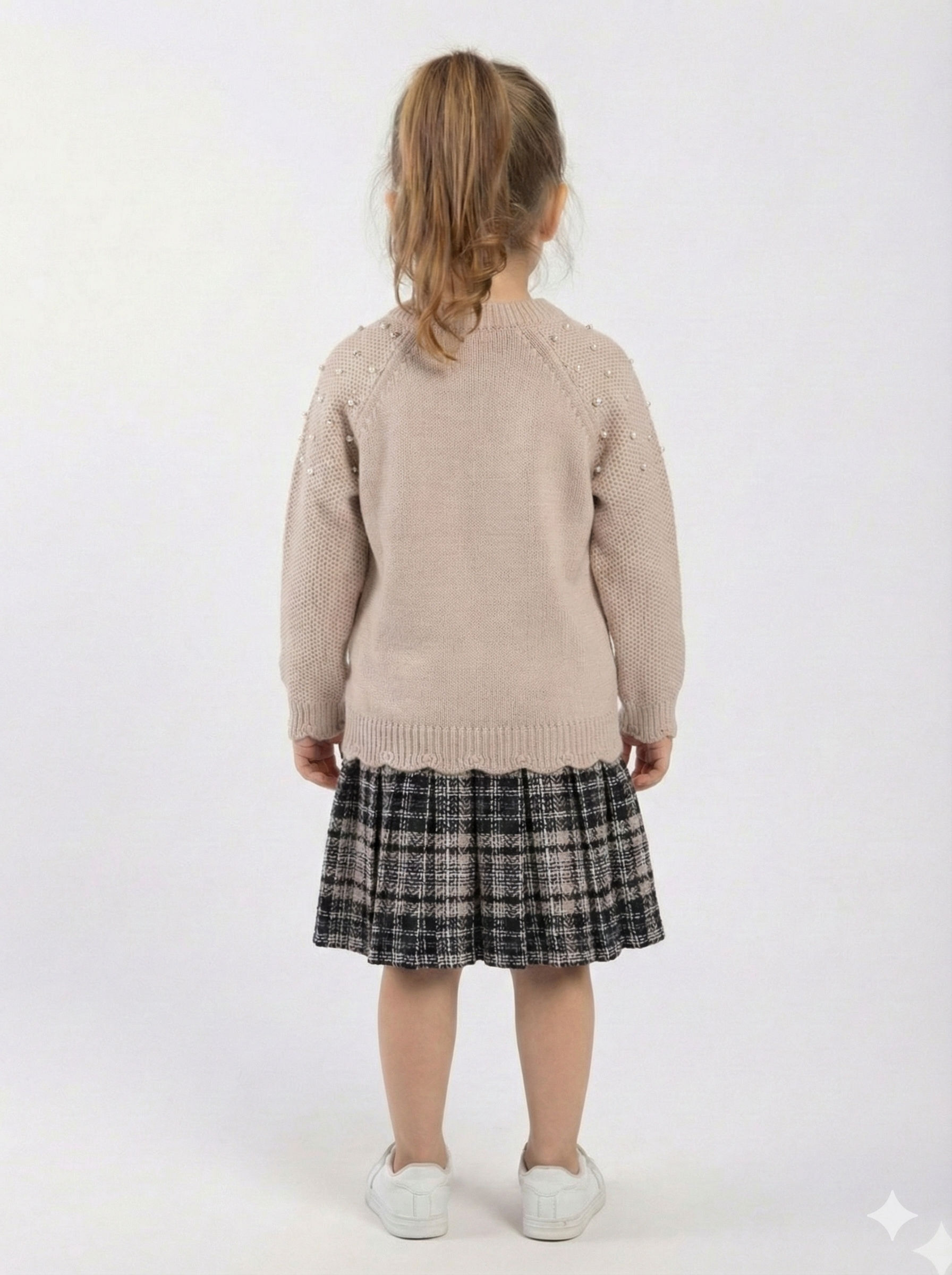 Bu şık kız çocuk elbisesi, bej rengi triko kazak ve ekose desenli etek birleşiminden oluşan iki parçalı bir tasarıma sahiptir. Kazak, uzun kollu olup omuz ve kollarında inci süslemeleriyle zarif bir detay sunar. Sıfır yaka yapısıyla rahat bir kullanım sağlar. Etek midi boyda, pileli ve klasik ekose deseniyle kış kombinlerine uygun sıcak ve şık bir görünüm sunar. Günlük ve özel davetlerde rahatlıkla tercih edilebilecek bu set, 9-14 yaş aralığındaki çocuklar için idealdir.