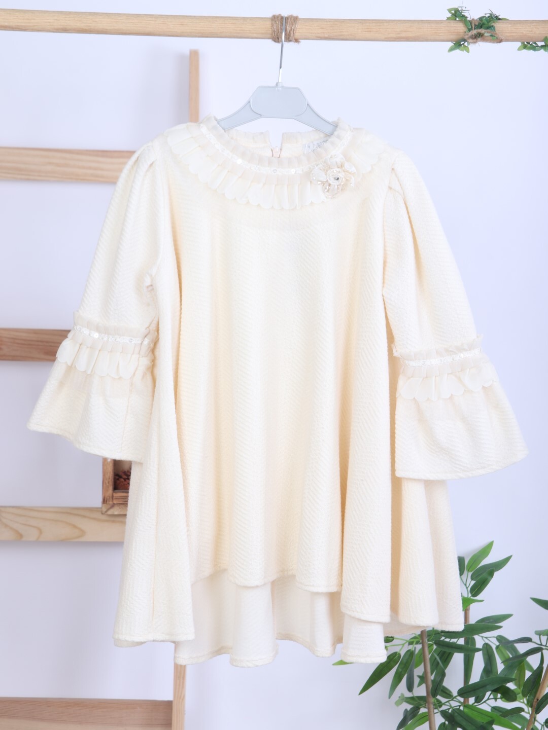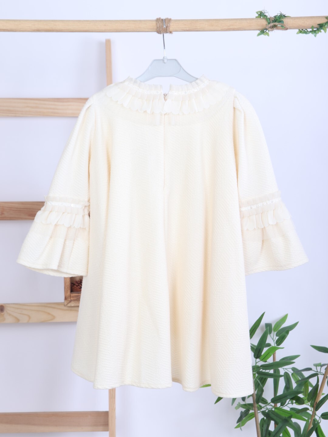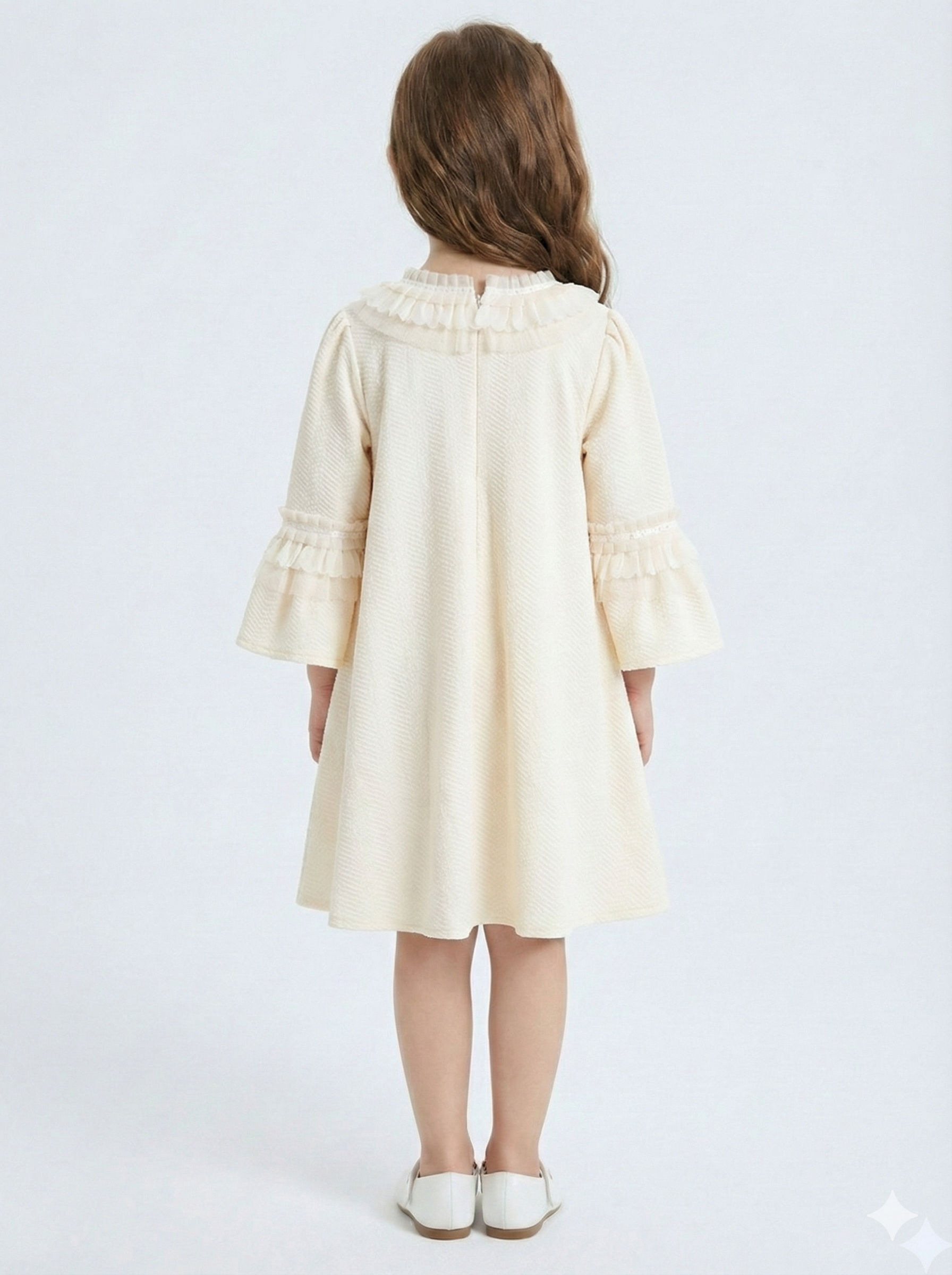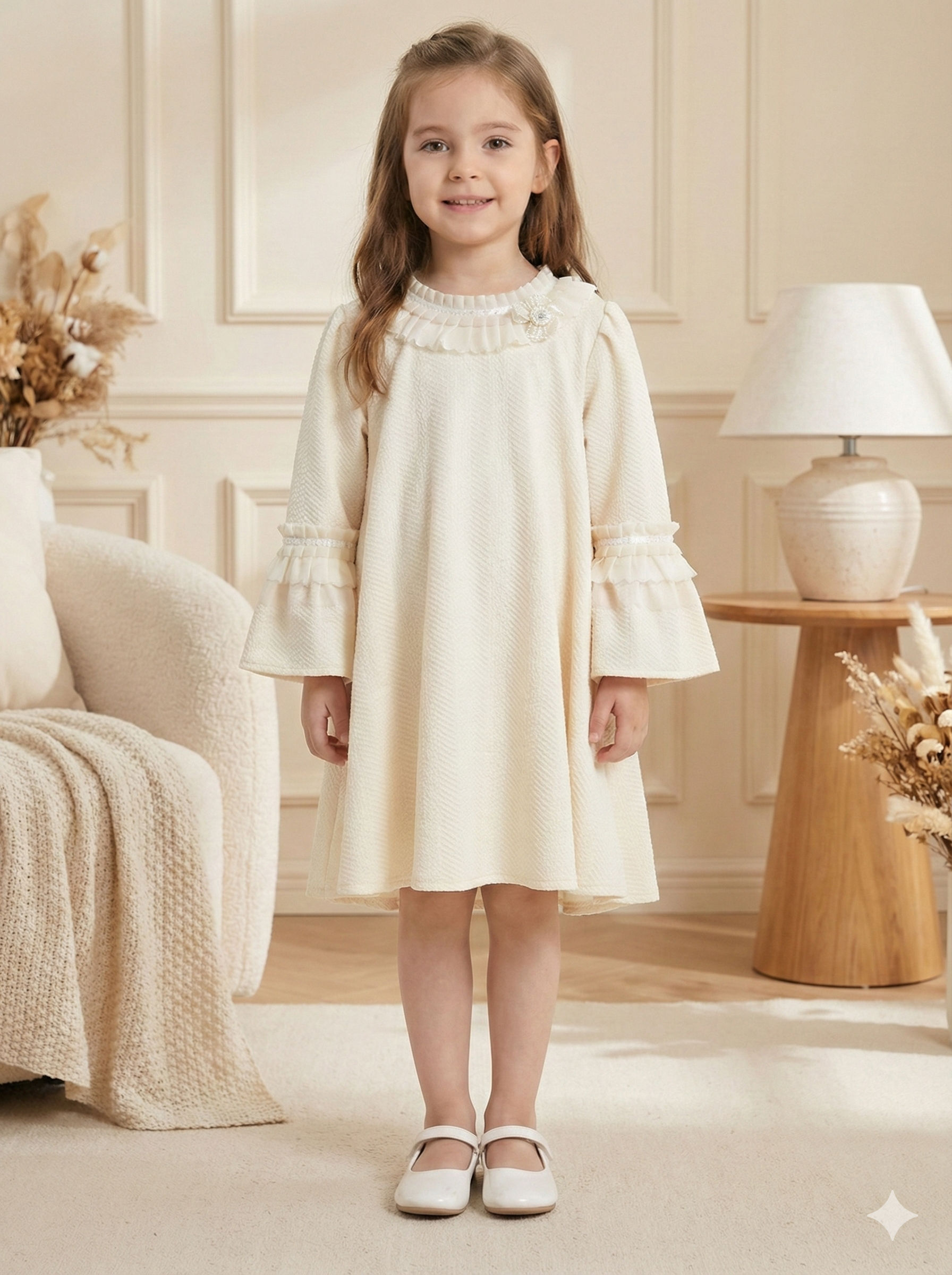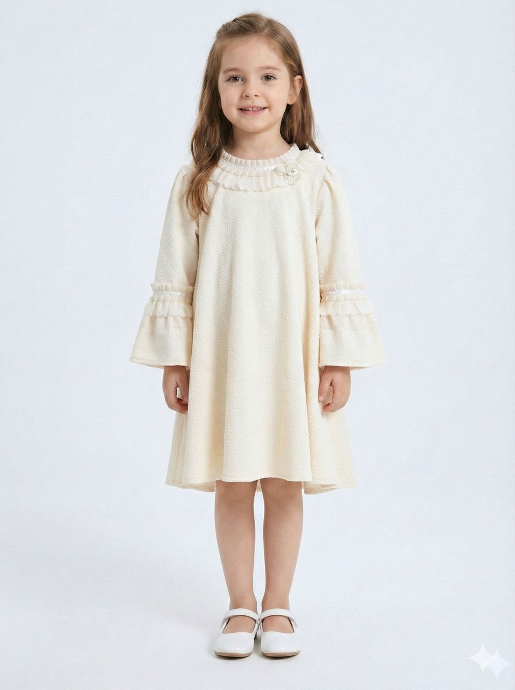 İspanyol Kollu Fırfırlı Yakalı Kız Çocuk Krem Elbise 4-10 Yaş 4405 Ekru