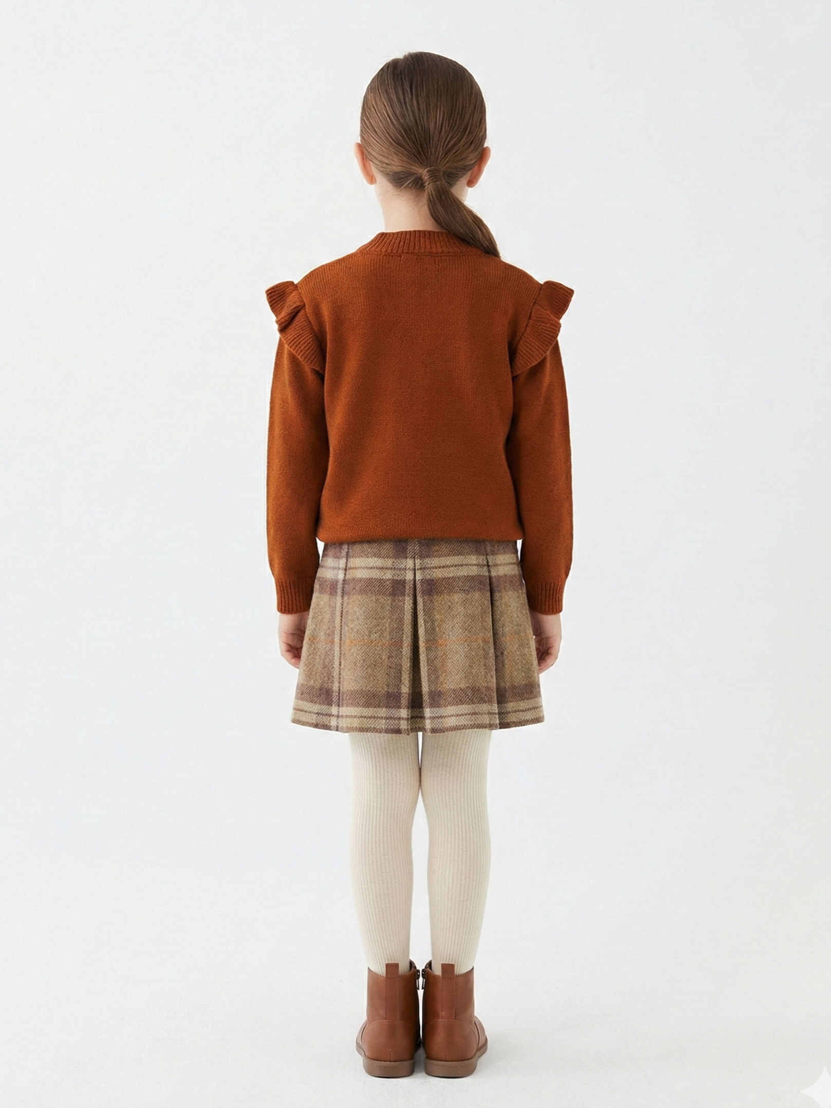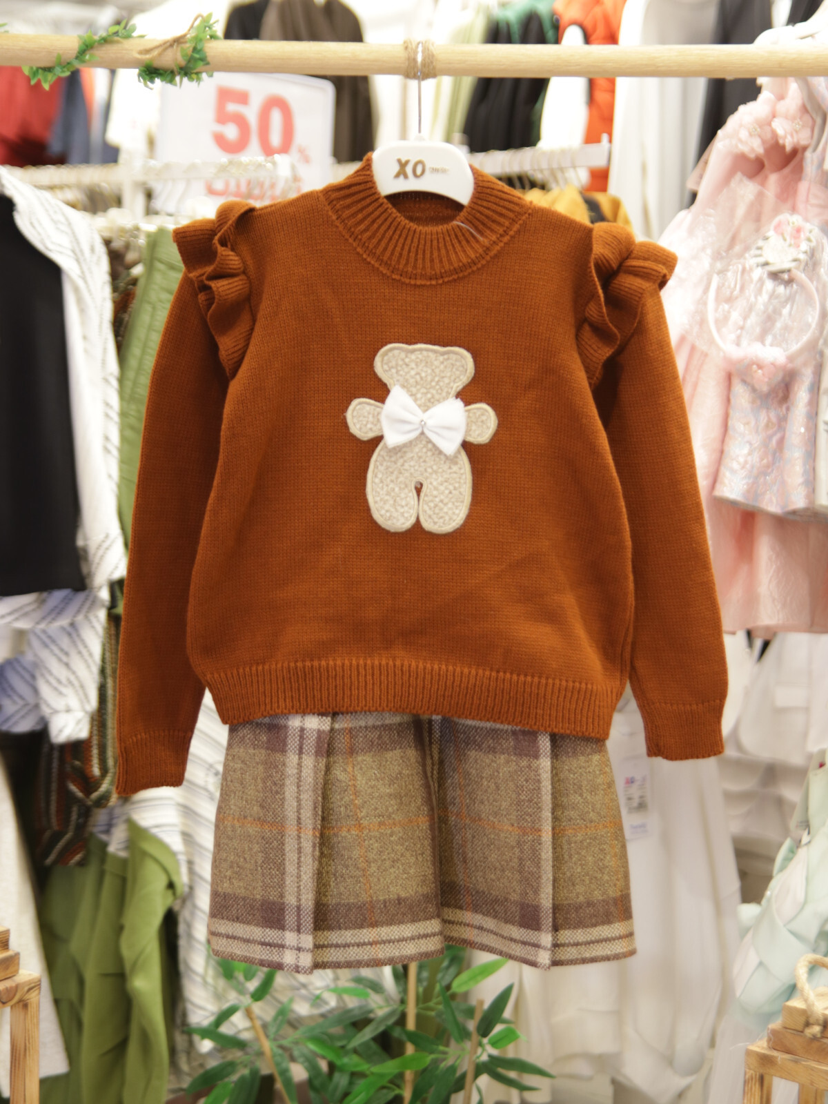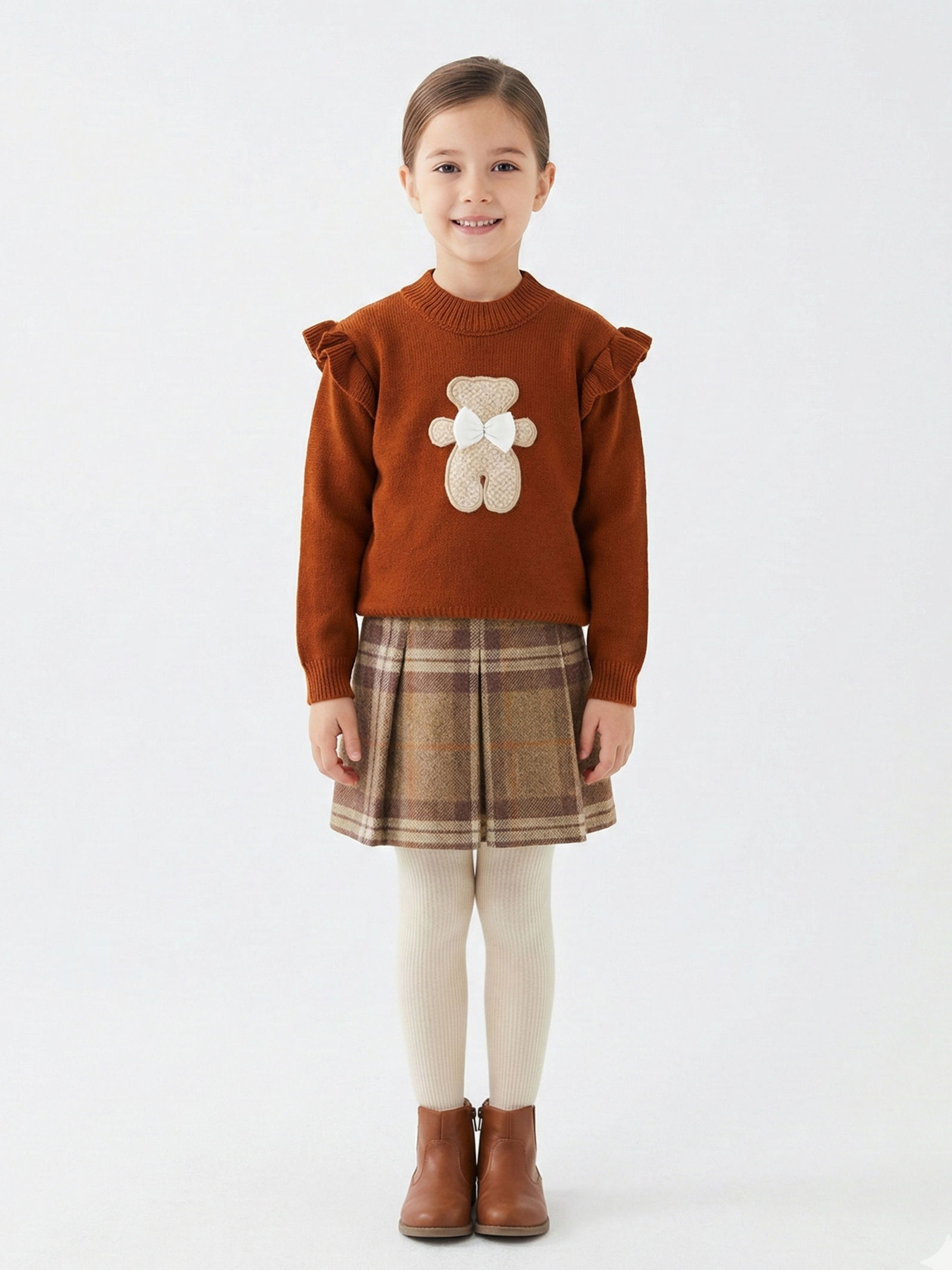 تقدم هذه الطقم الشتوي للبنات مظهرًا دافئًا وأنيقًا. يتميز الكنزة بلون الطين وأكمام طويلة وياقة دائرية مع تفاصيل كشكش على الأكتاف، وزخرفة دب محبوك لطيف مزين بفراشة على الأمام. تتضمن المجموعة تنورة قصيرة بطيات بنقشة مربعات بلون البيج والبني. تستكمل الإطلالة بالجوارب القطنية المربوطة وكاحل بني من الجلد الصناعي. مناسبة للاستخدام اليومي والمناسبات الخاصة.