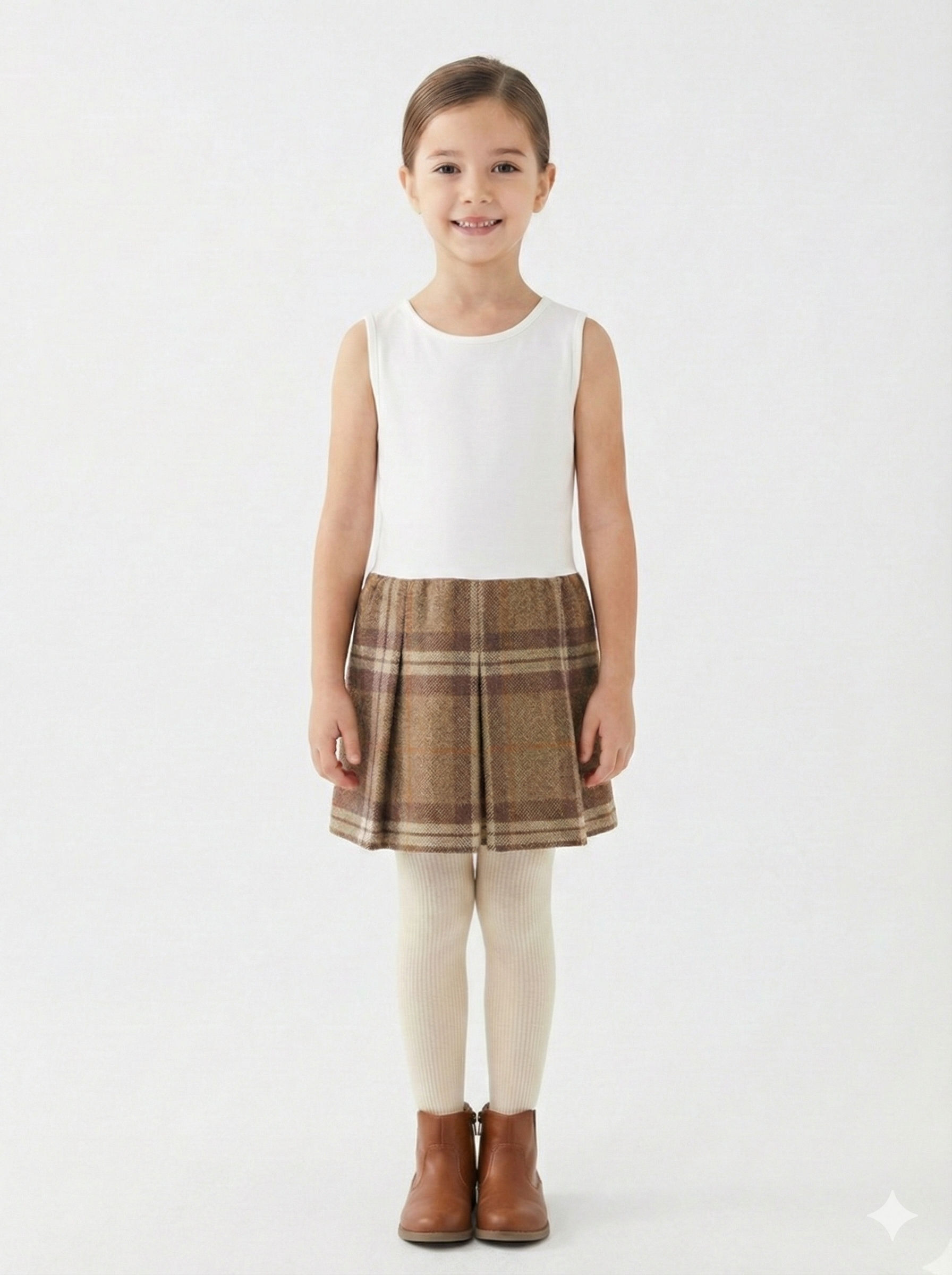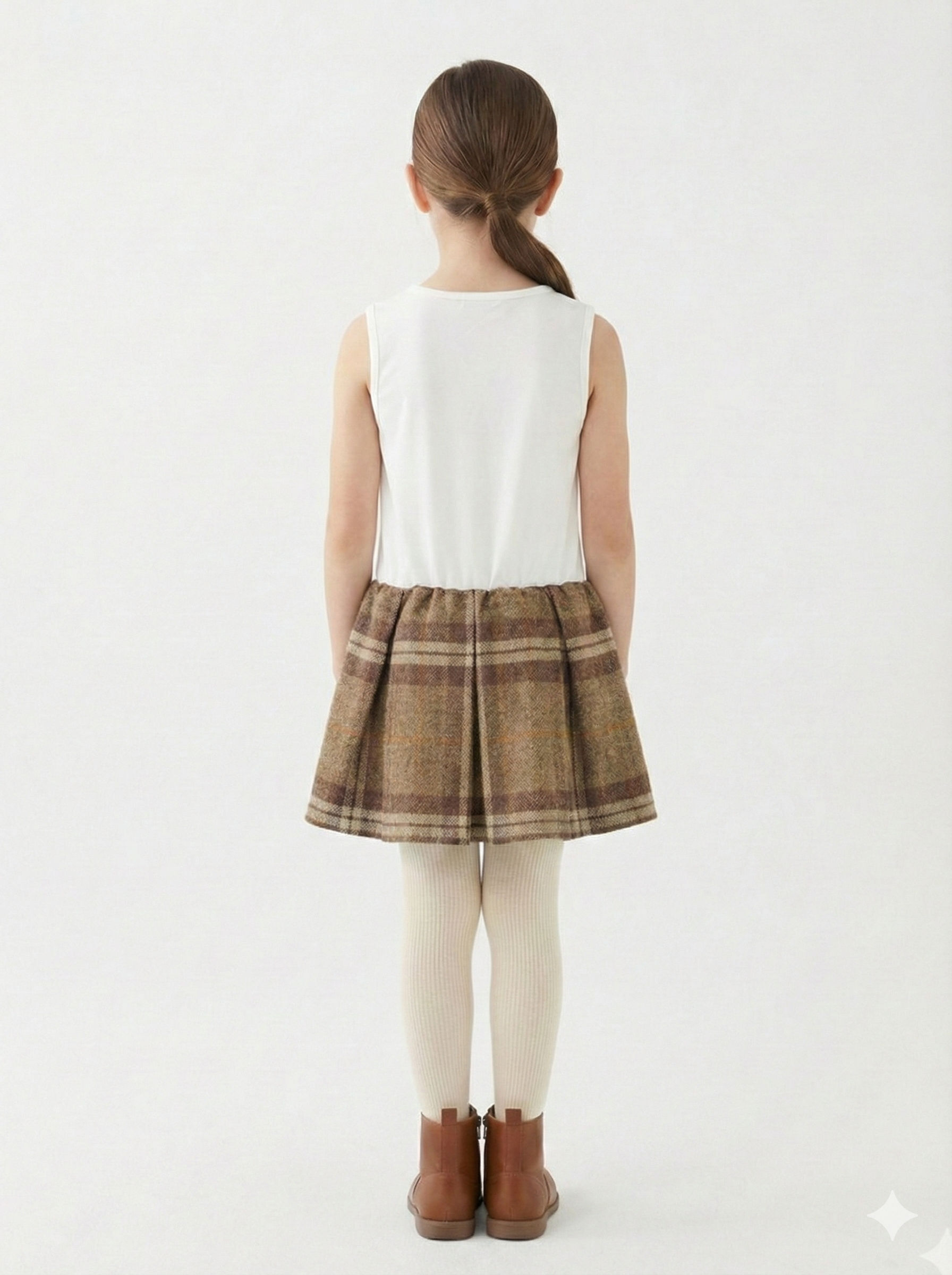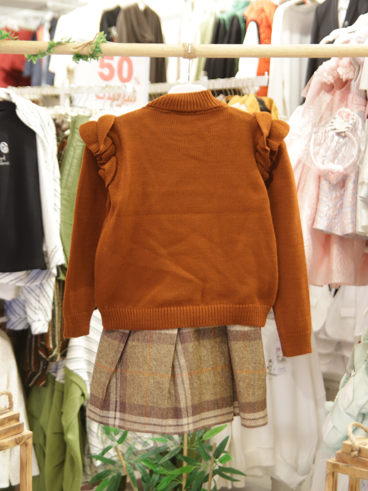 تقدم هذه الطقم الشتوي للبنات مظهرًا دافئًا وأنيقًا. يتميز الكنزة بلون الطين وأكمام طويلة وياقة دائرية مع تفاصيل كشكش على الأكتاف، وزخرفة دب محبوك لطيف مزين بفراشة على الأمام. تتضمن المجموعة تنورة قصيرة بطيات بنقشة مربعات بلون البيج والبني. تستكمل الإطلالة بالجوارب القطنية المربوطة وكاحل بني من الجلد الصناعي. مناسبة للاستخدام اليومي والمناسبات الخاصة.