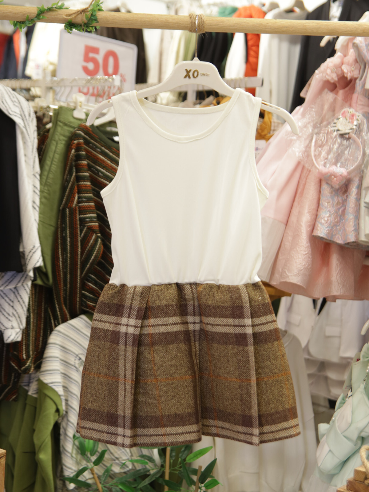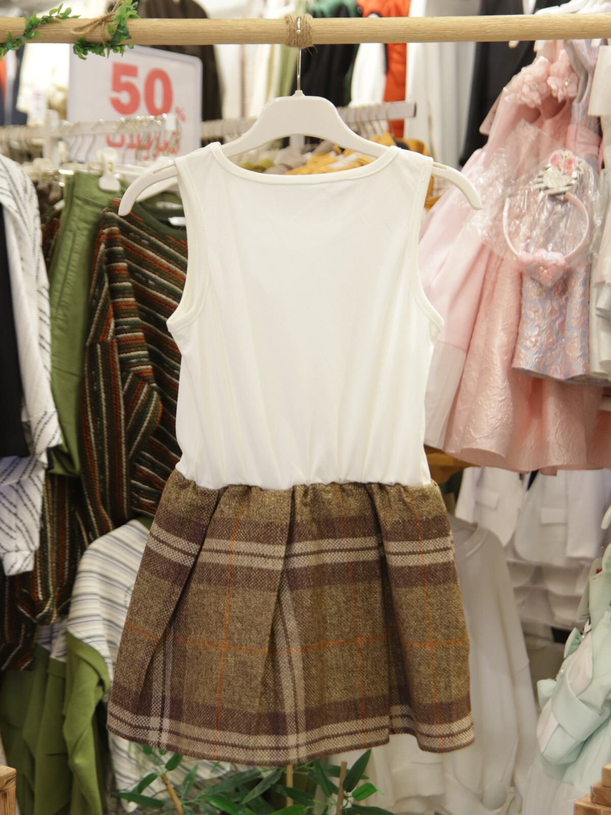 - التنورة: قصيرة، بنقشة مربعات، بطيات