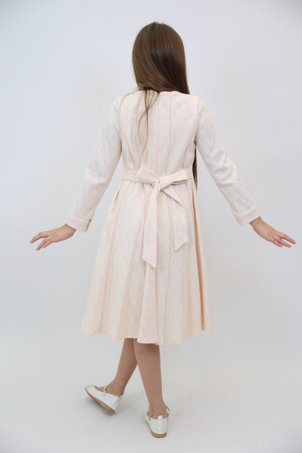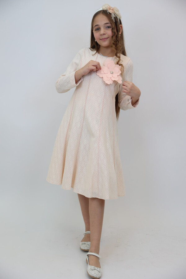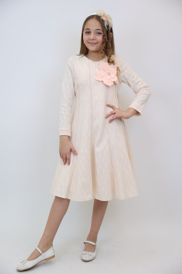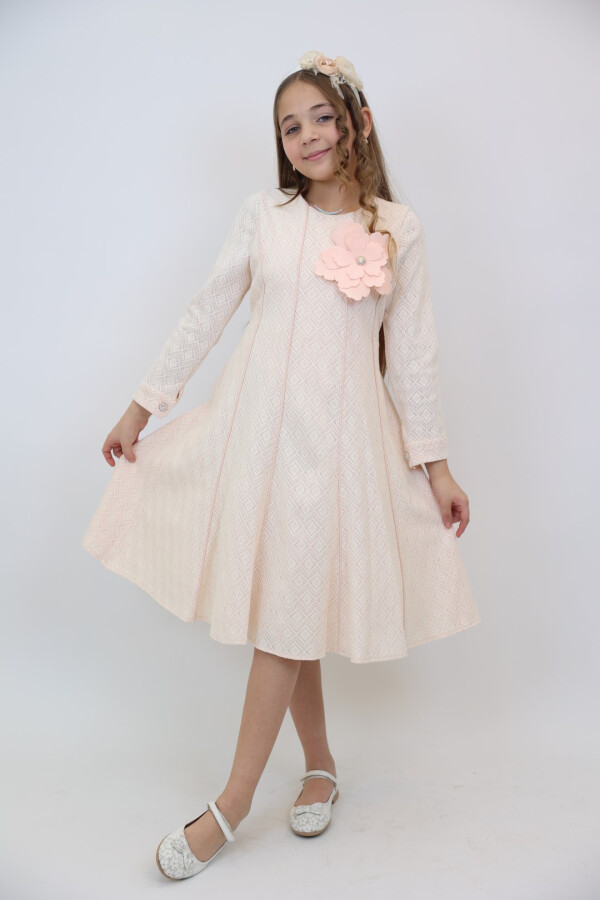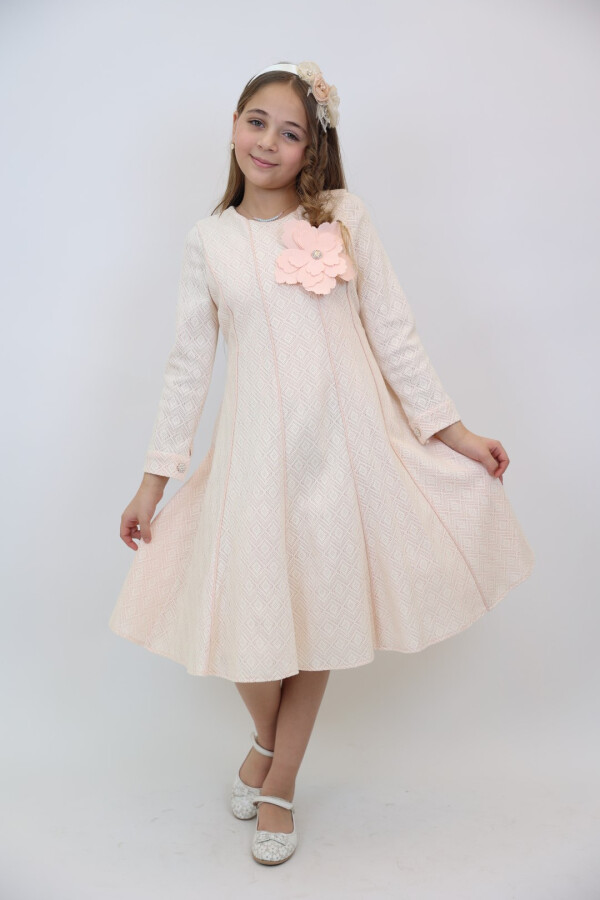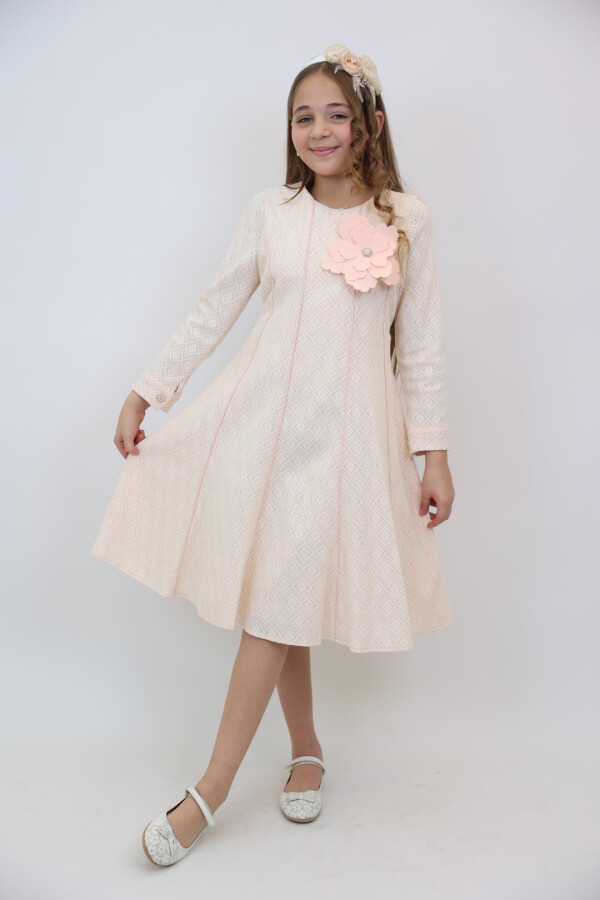 Bu sevimli somon rengi kız çocuk elbisesi, zarif kesimi ve şık detaylarıyla dikkat çekiyor. Uzun kollu yapısı ve V yaka tasarımı ile hem rahat hem de şık bir görünüm sunuyor. Elbisenin ön kısmında yer alan büyük çiçek aksesuarı, ona ekstra bir sevimlilik katıyor. Midi boyu, her türlü etkinlikte rahatlıkla giyilebilmesi için idealdir.