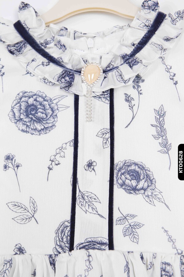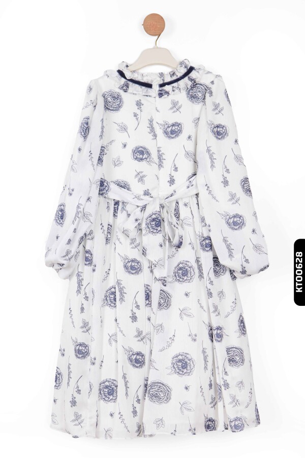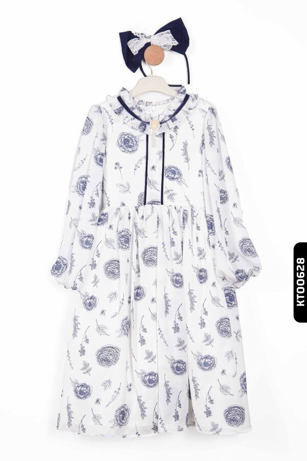 Bu şık kız çocuk elbisesi, zarif ve rahat tasarımıyla özel günler için ideal bir seçimdir. Beyaz zemin üzerine çizgisel lacivert çiçek desenleriyle süslenmiş, uzun kollu ve midi boyda bir elbisedir. Fırfırlı yakası ve yakadaki inci detay, elbiseye sofistike bir hava katmaktadır. Beldeki ince kuşak sayesinde elbise vücuda oturur ve hoş bir siluet oluşturur. Ayrıca, elbisenin yanında uyumlu bir lacivert ve dantel fiyonk aksesuarı bulunmaktadır.