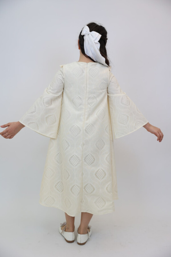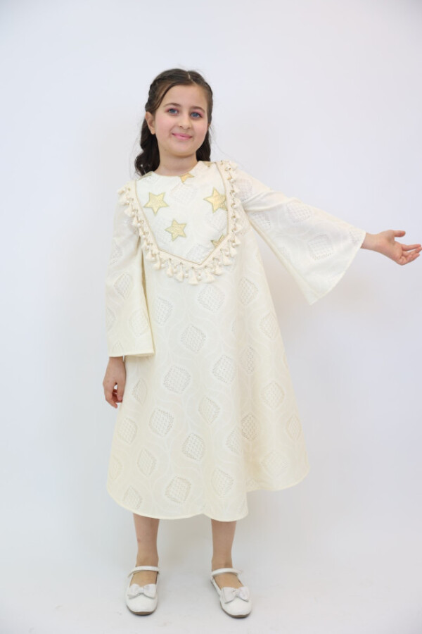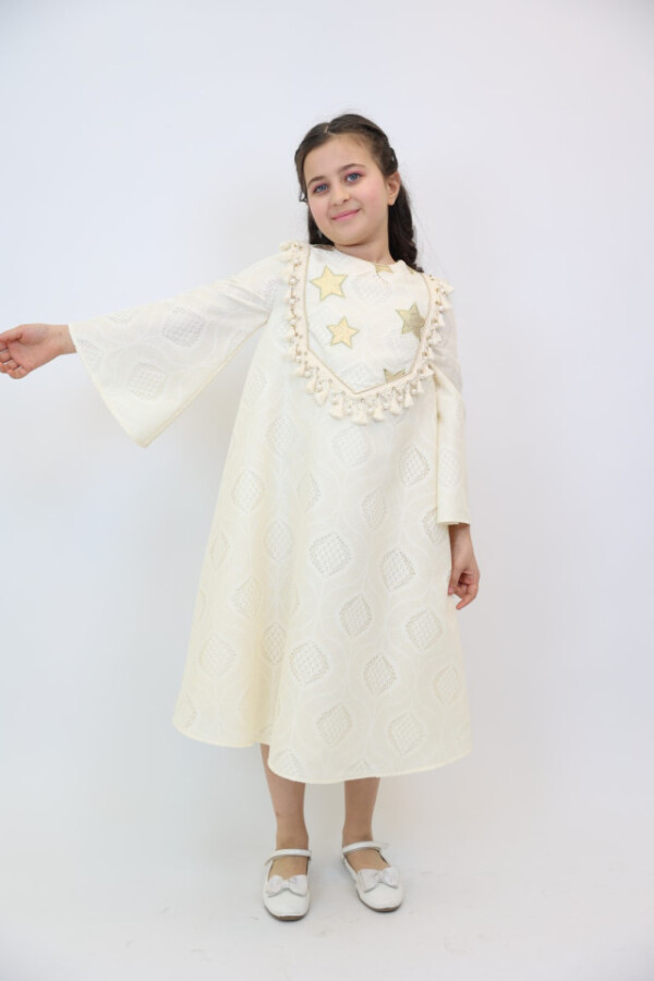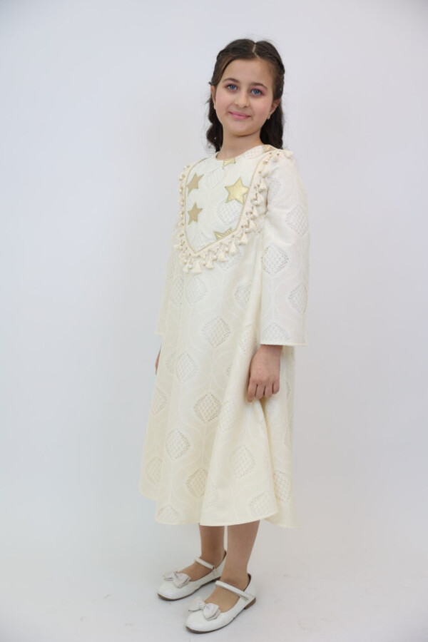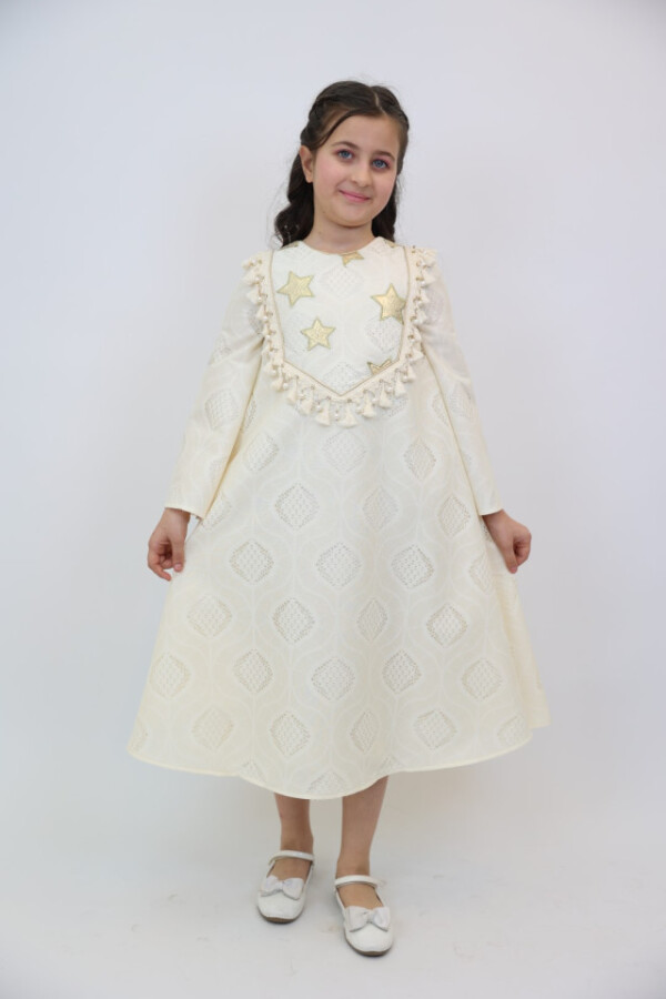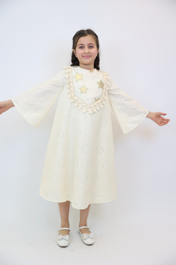 Bu şık elbise, kız çocukları için özel günlerde mükemmel bir seçimdir. Ekru rengiyle zarafetini ve şıklığını bir arada sunar. Elbisenin üst kısmında yer alan altın yıldız detayları, onun göz alıcı görünümünü tamamlar. Rahat ve ferah uzun kollarıyla çocukların hareket özgürlüğünü desteklerken, midi boyu da şıklık katmaktadır.