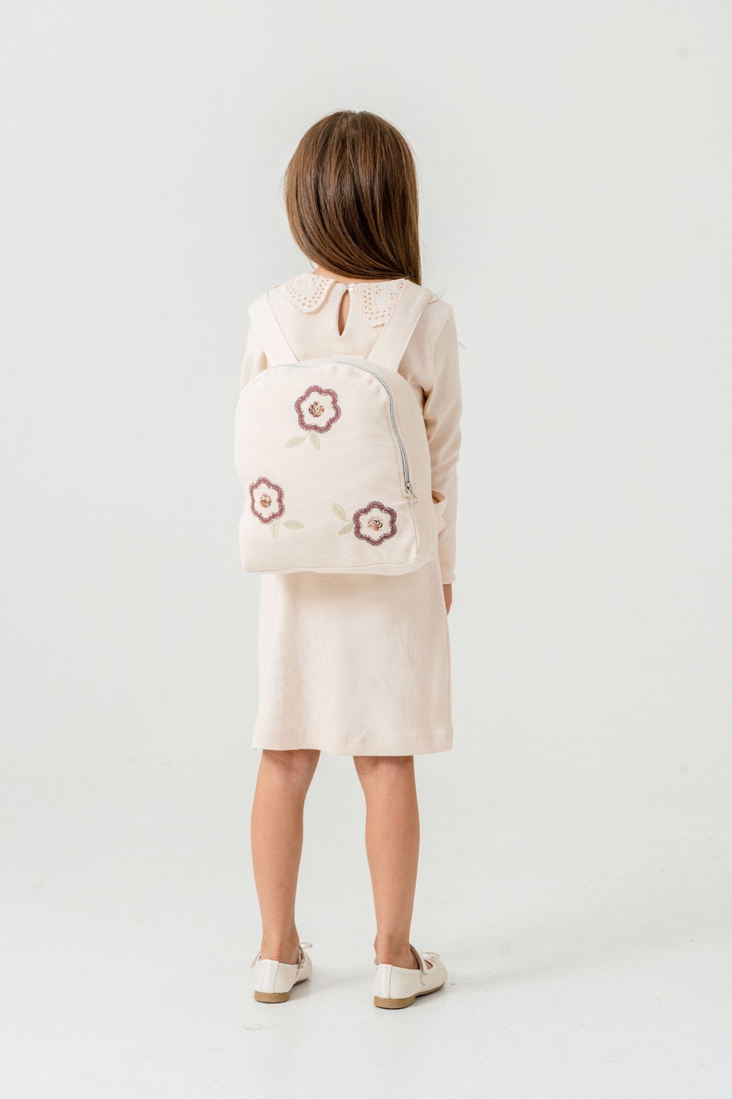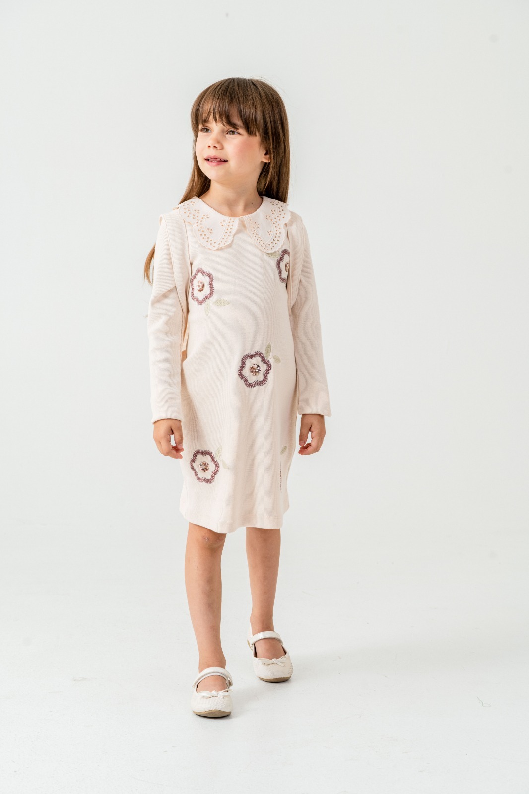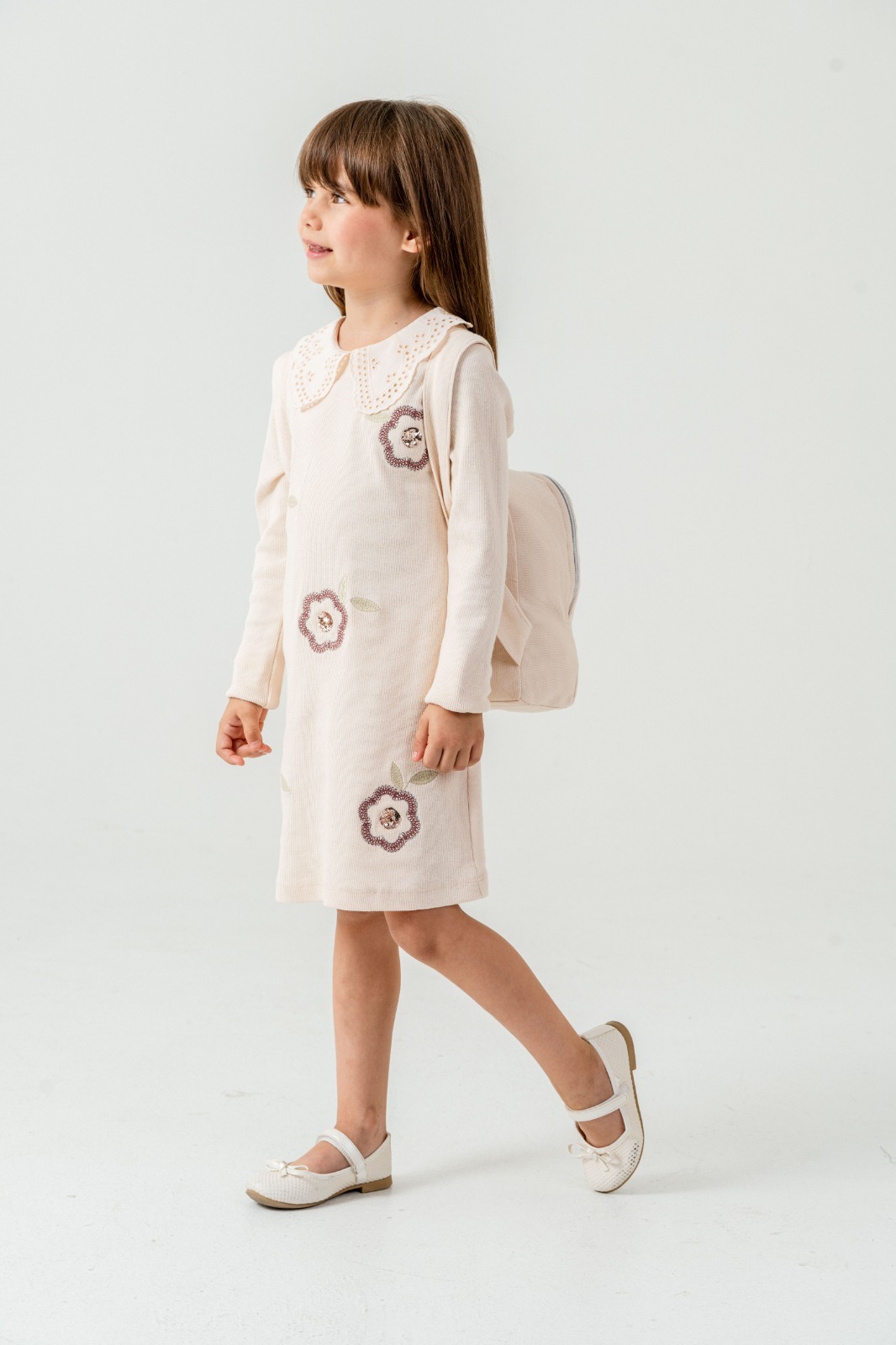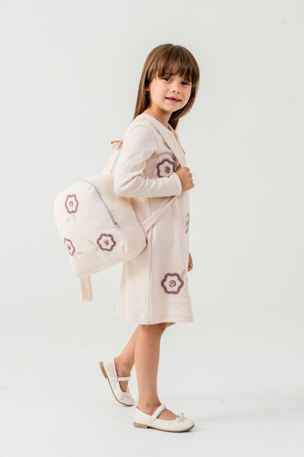 Bu kız çocuk elbisesi, zarif ve şık detaylarıyla dikkat çekiyor. Uzun kollu ve midi boydaki elbise, kapüşonsuz olup, ön yüzünde ve sırtında çiçek işlemeleri bulunuyor. Sıfır yaka, fırfırlı ve hassas işçilikle süslenmiş. Elbiseye uyumlu aynı desende, fermuarlı küçük bir sırt çantası da ürünle birlikte sunuluyor. Yumuşak dokusu ve sade bej rengiyle kış aylarında rahat kullanım sağlıyor.