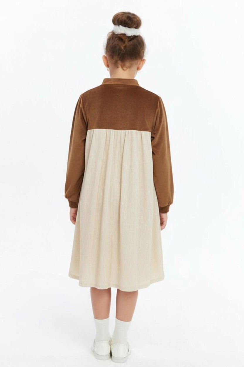 Bu kız çocuk elbisesi, zarif ve rahat tasarımıyla kış sezonu için idealdir. Elbisenin üst kısmı kahverengi, alt kısmı ise bej renkte olup, yumuşak ve dokulu kumaştan yapılmıştır. Uzun kollu ve bisiklet yaka yapısı sayesinde soğuk havalarda ekstra koruma sağlar. Göğüs kısmındaki şık fiyonk detayı elbiseye hoş bir dokunuş katarken, midi boy uzunluğu günlük kullanım için oldukça uygundur.