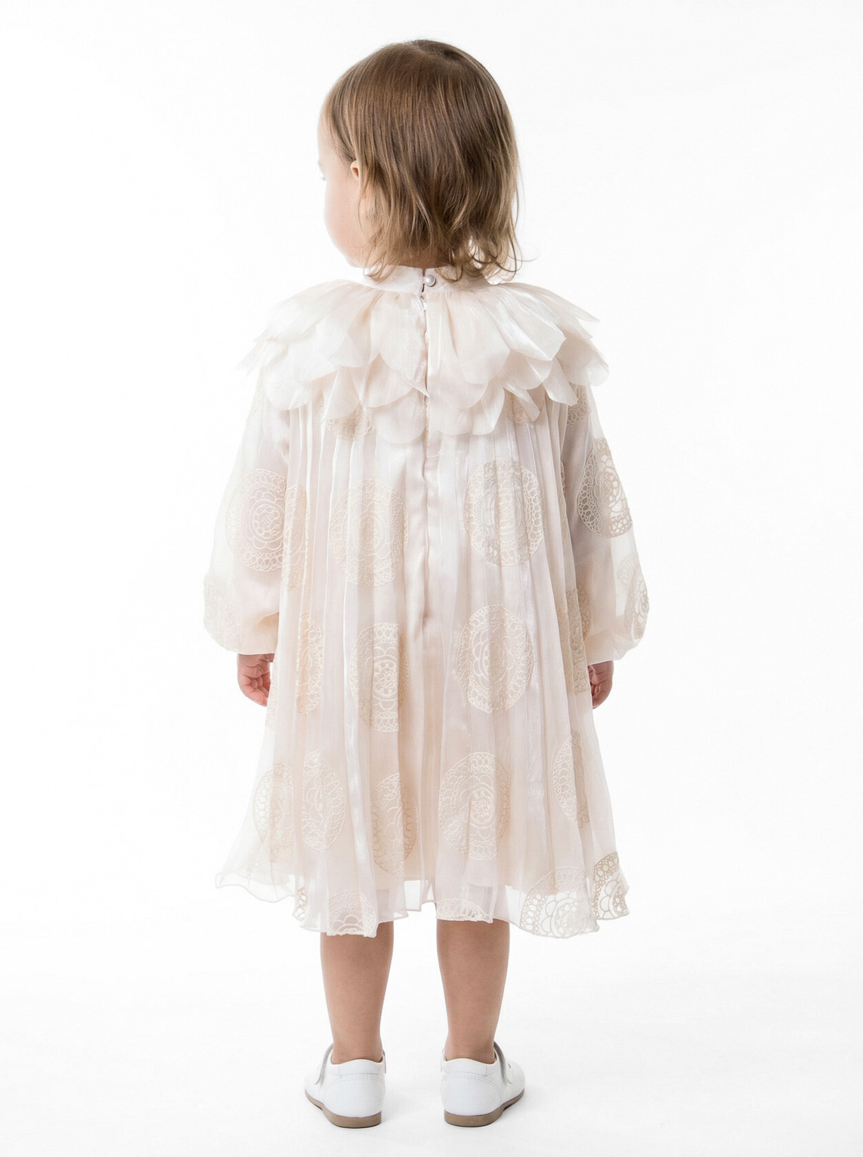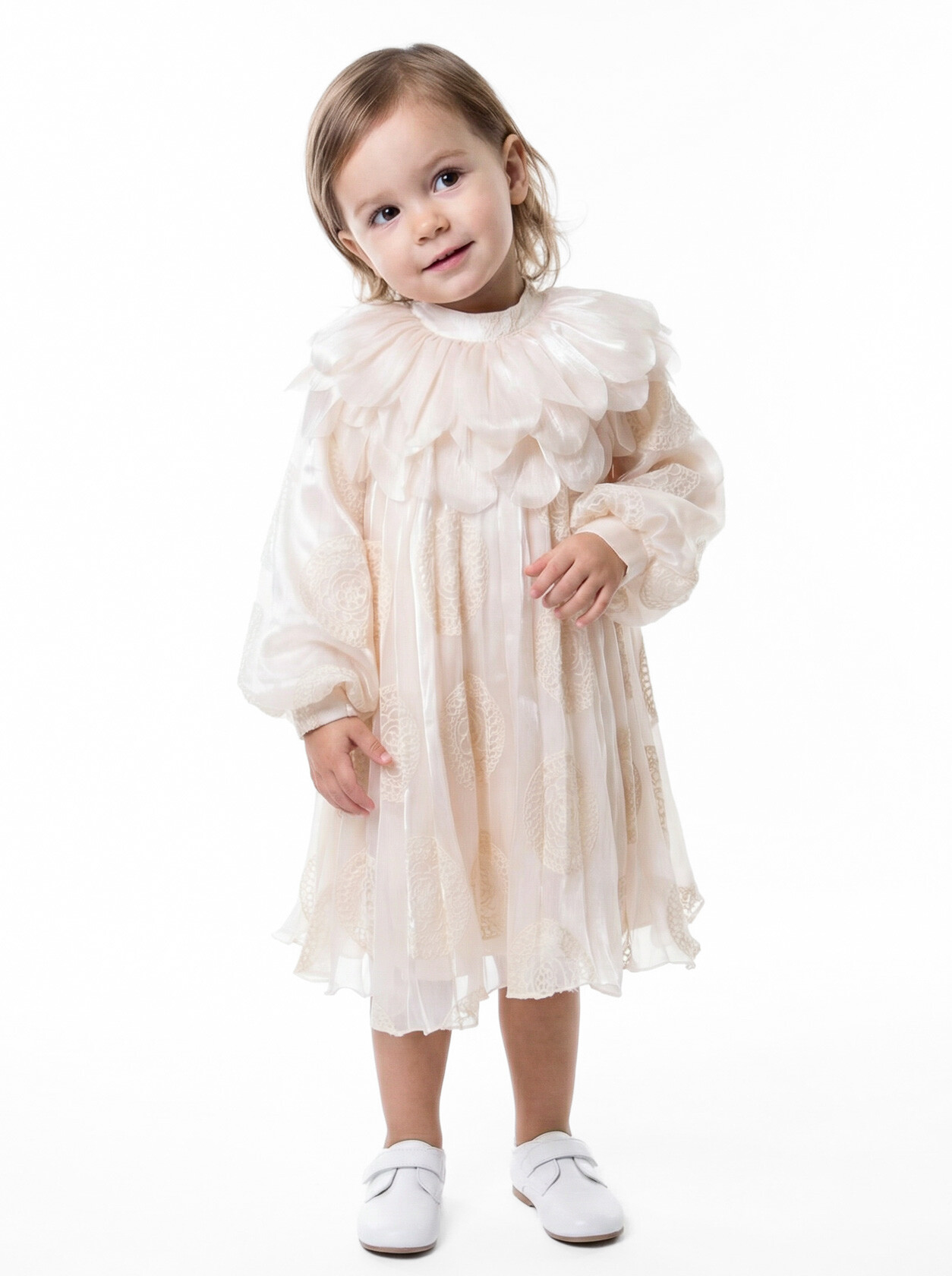 Bu şık kız çocuk elbisesi, bahar sezonunun zarif bir parçasıdır. Ekru rengi ve dikkat çekici desenleri ile her ortamda göz alıcı bir görünüm sunar.