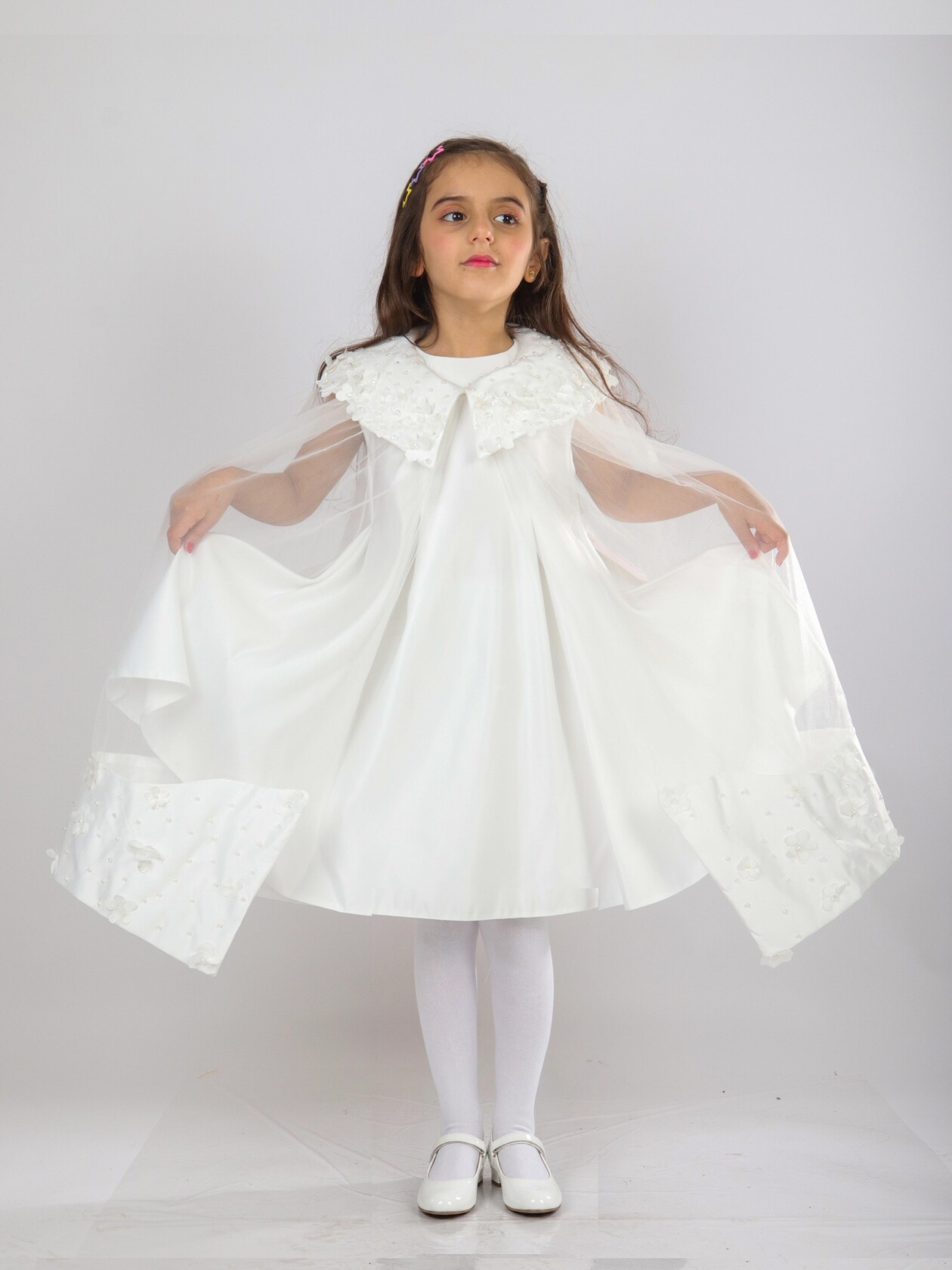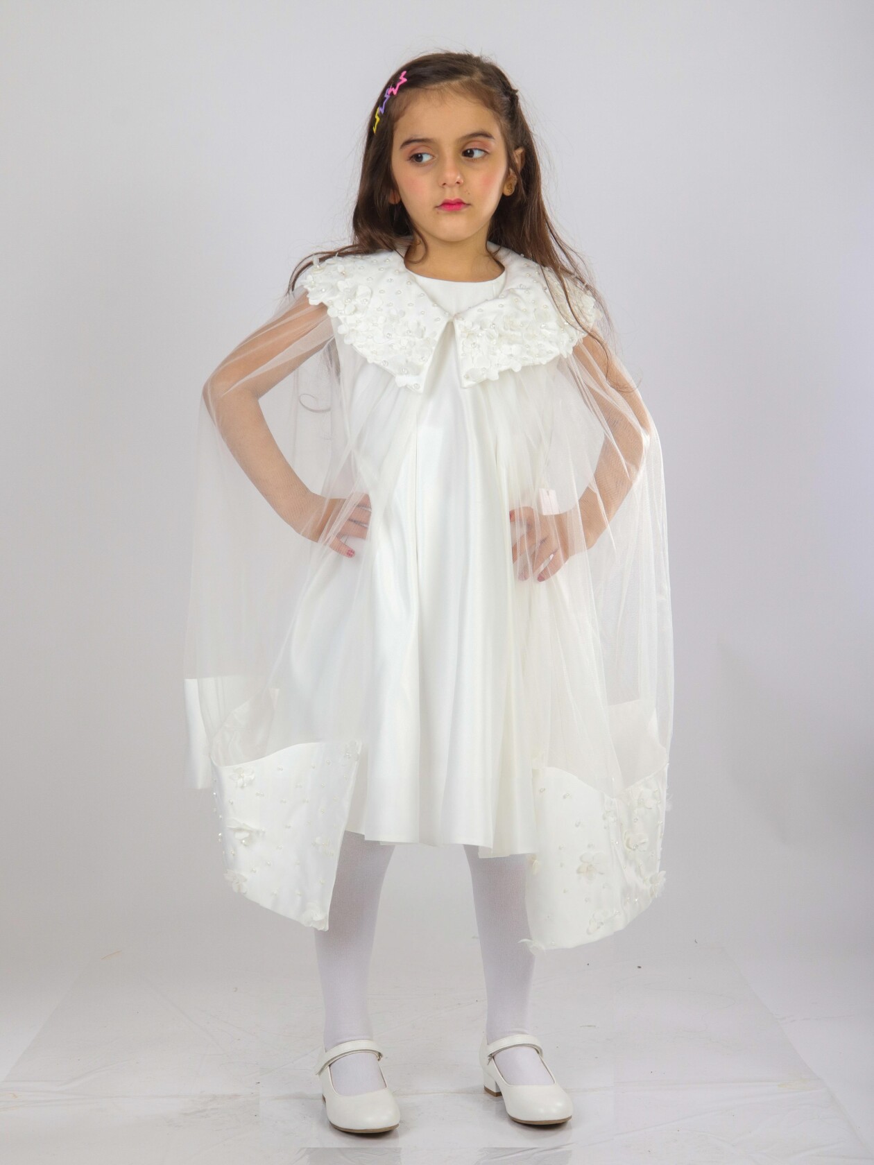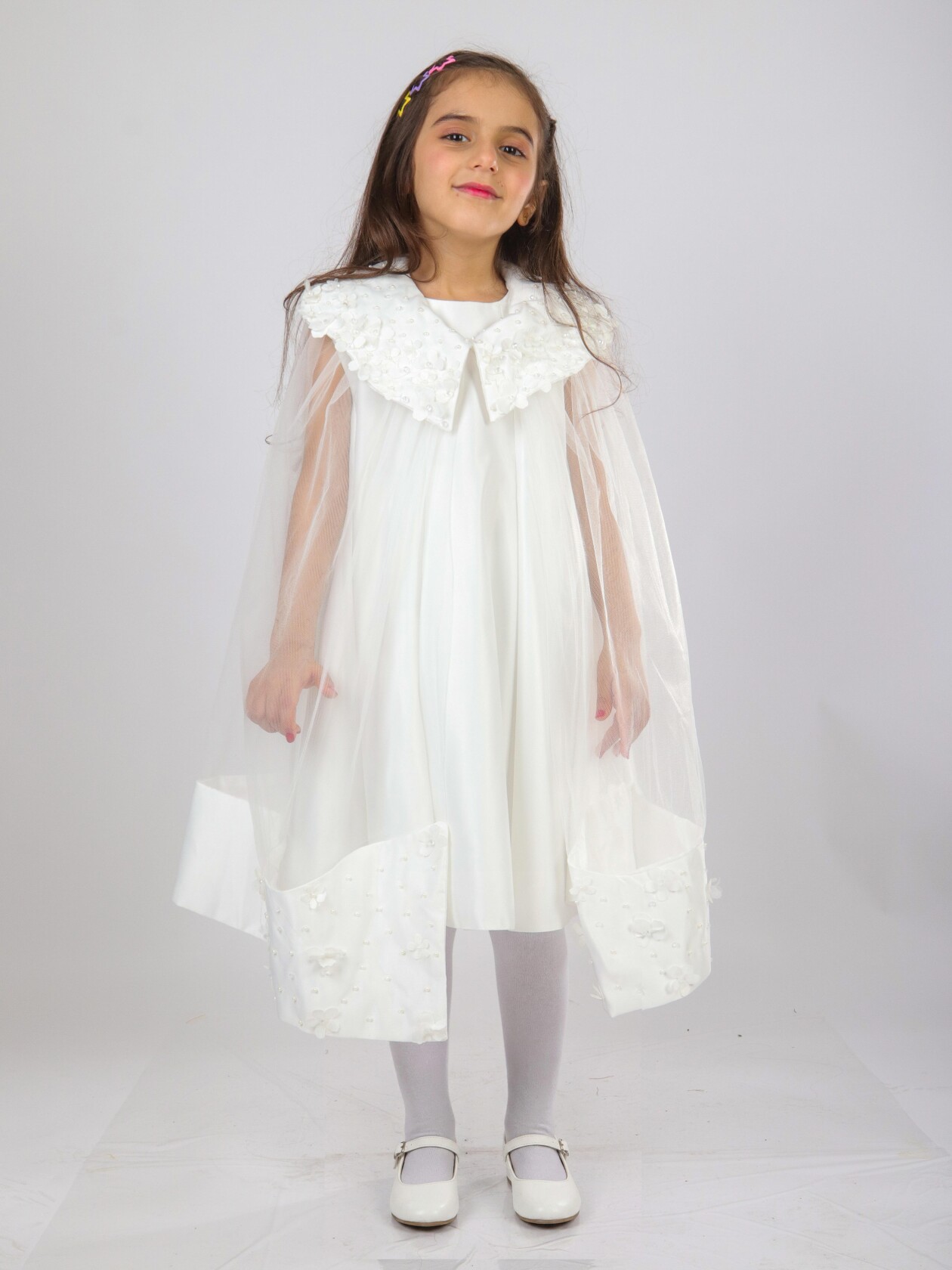 Bu zarif kız çocuk elbisesi, beyaz renkte olup özel günler için tasarlanmıştır. Uzun ve bol kesimiyle rahat bir kullanım sunar. Elbisenin en dikkat çekici özelliği, tül kumaştan yapılmış uzun pelerin kol detaylarıdır. Pelerinin alt kısmında ve yakasında inciler ve küçük çiçek aplikeleri bulunur. Kolsuz yapısıyla yaz ve bahar ayları için idealdir. Yuvarlak bisiklet yaka tasarımı sade ve şık bir görünüm yaratır. Arkadan fermuarlı olup kolay giyilip çıkarılabilir.