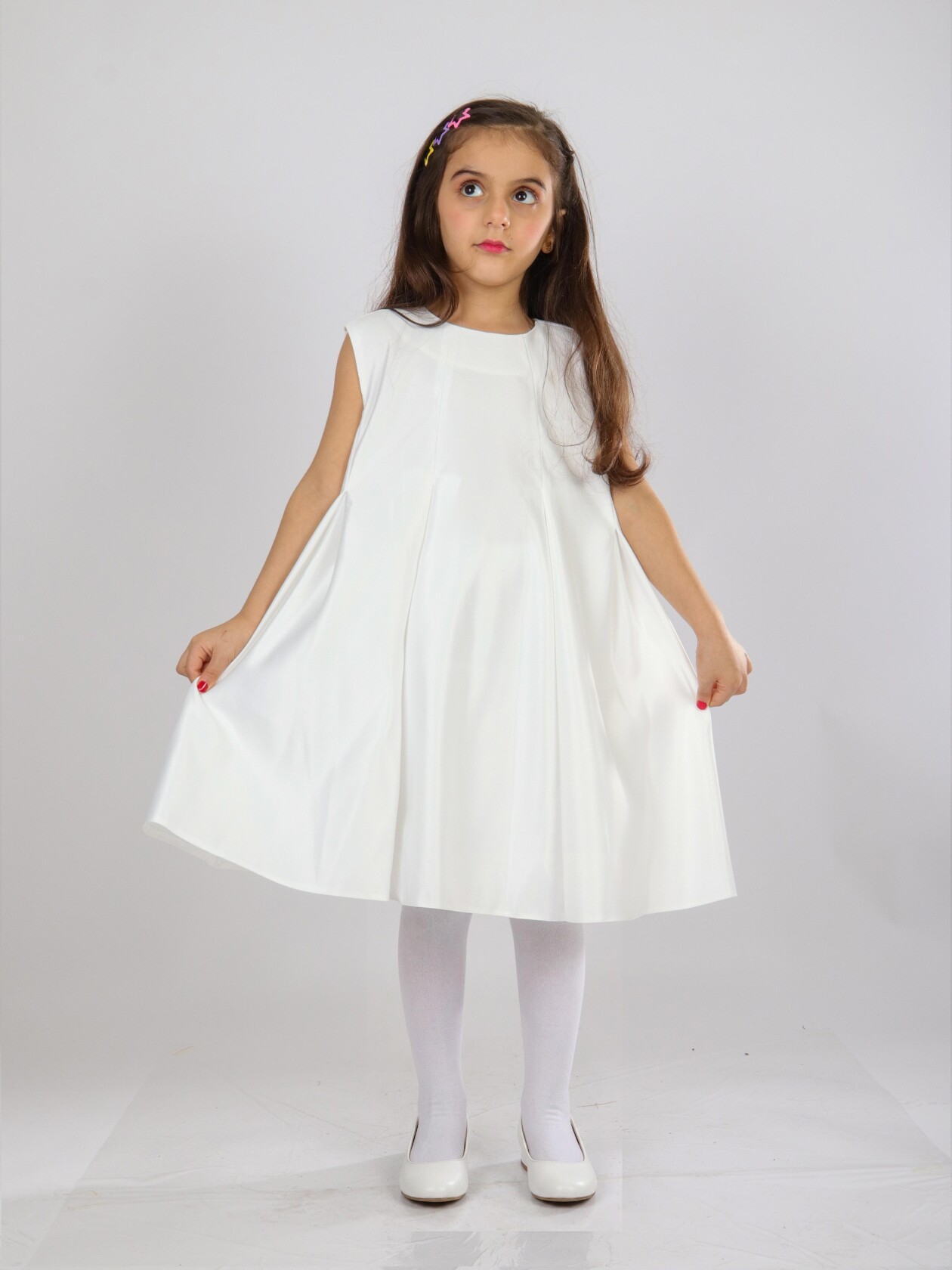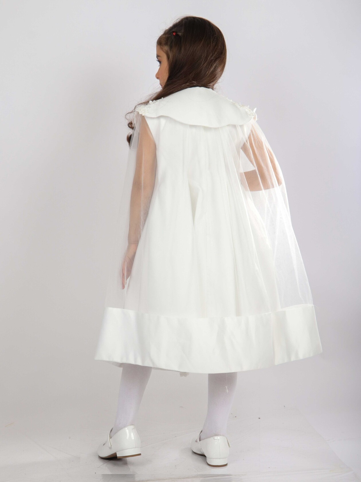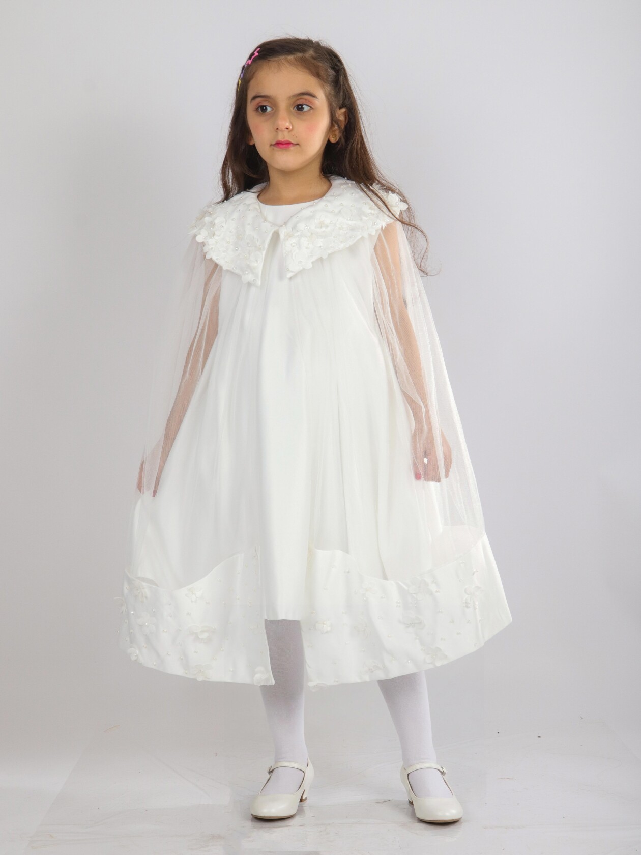 Bu zarif kız çocuk elbisesi, beyaz renkte olup özel günler için tasarlanmıştır. Uzun ve bol kesimiyle rahat bir kullanım sunar. Elbisenin en dikkat çekici özelliği, tül kumaştan yapılmış uzun pelerin kol detaylarıdır. Pelerinin alt kısmında ve yakasında inciler ve küçük çiçek aplikeleri bulunur. Kolsuz yapısıyla yaz ve bahar ayları için idealdir. Yuvarlak bisiklet yaka tasarımı sade ve şık bir görünüm yaratır. Arkadan fermuarlı olup kolay giyilip çıkarılabilir.