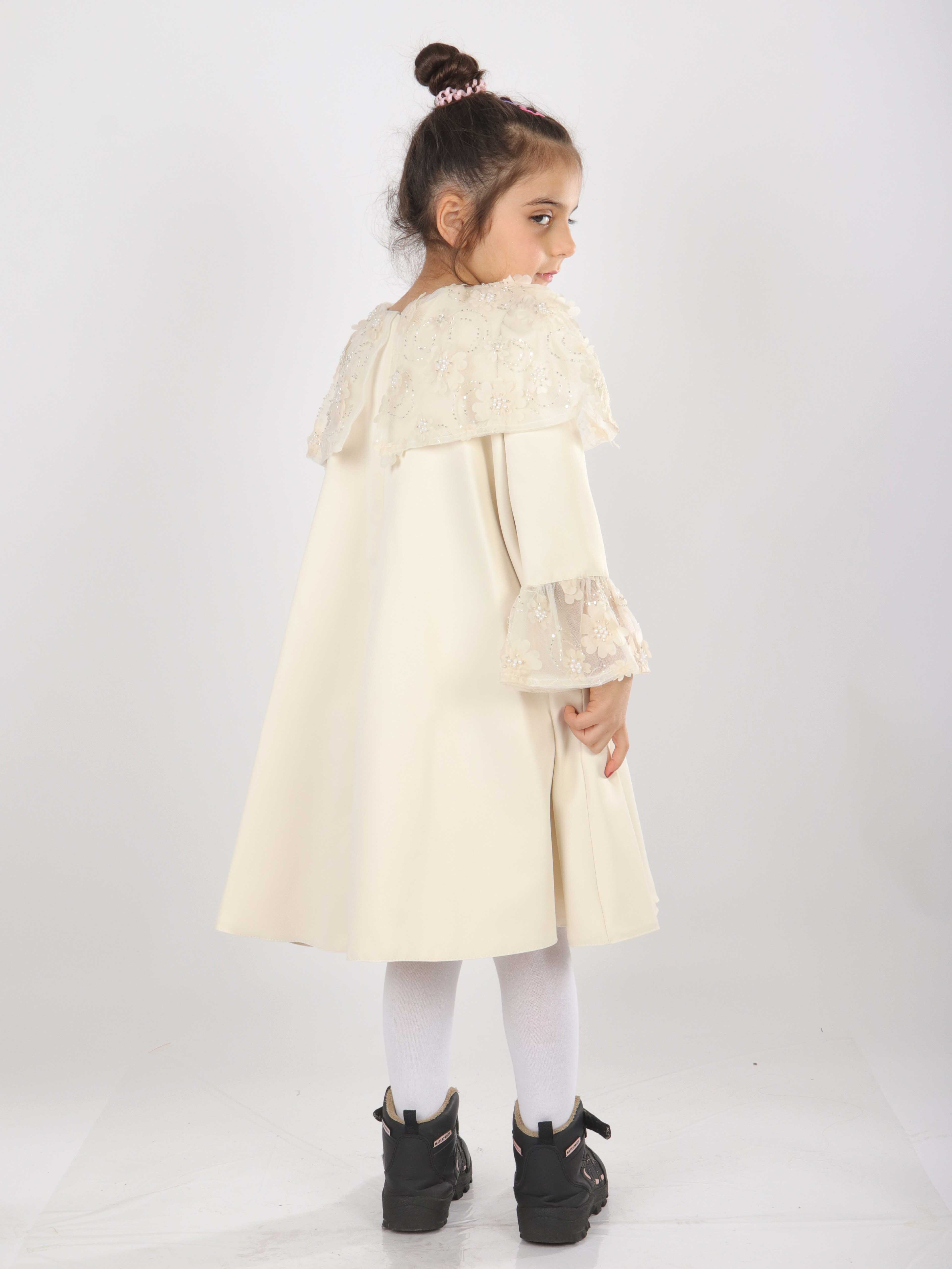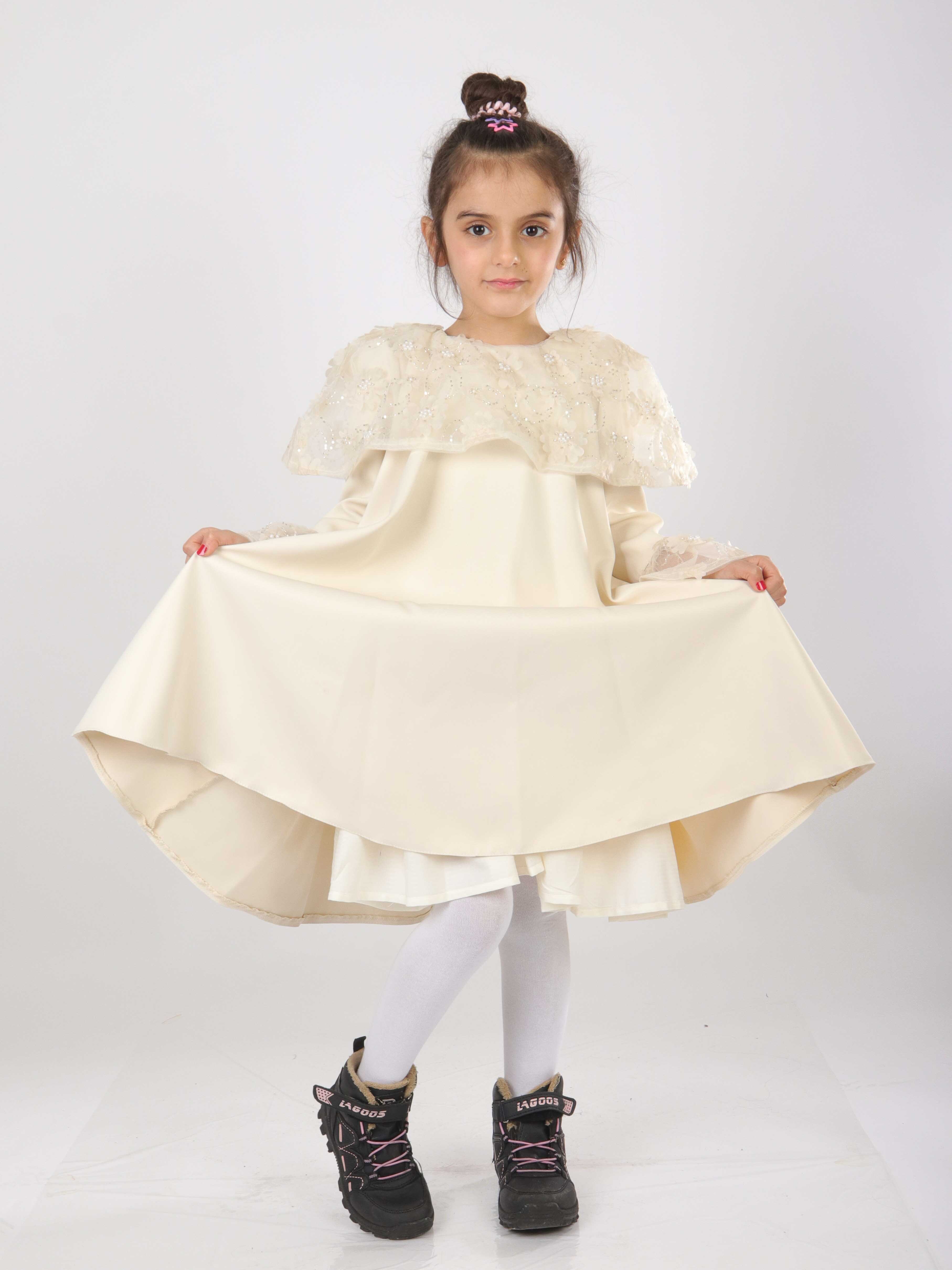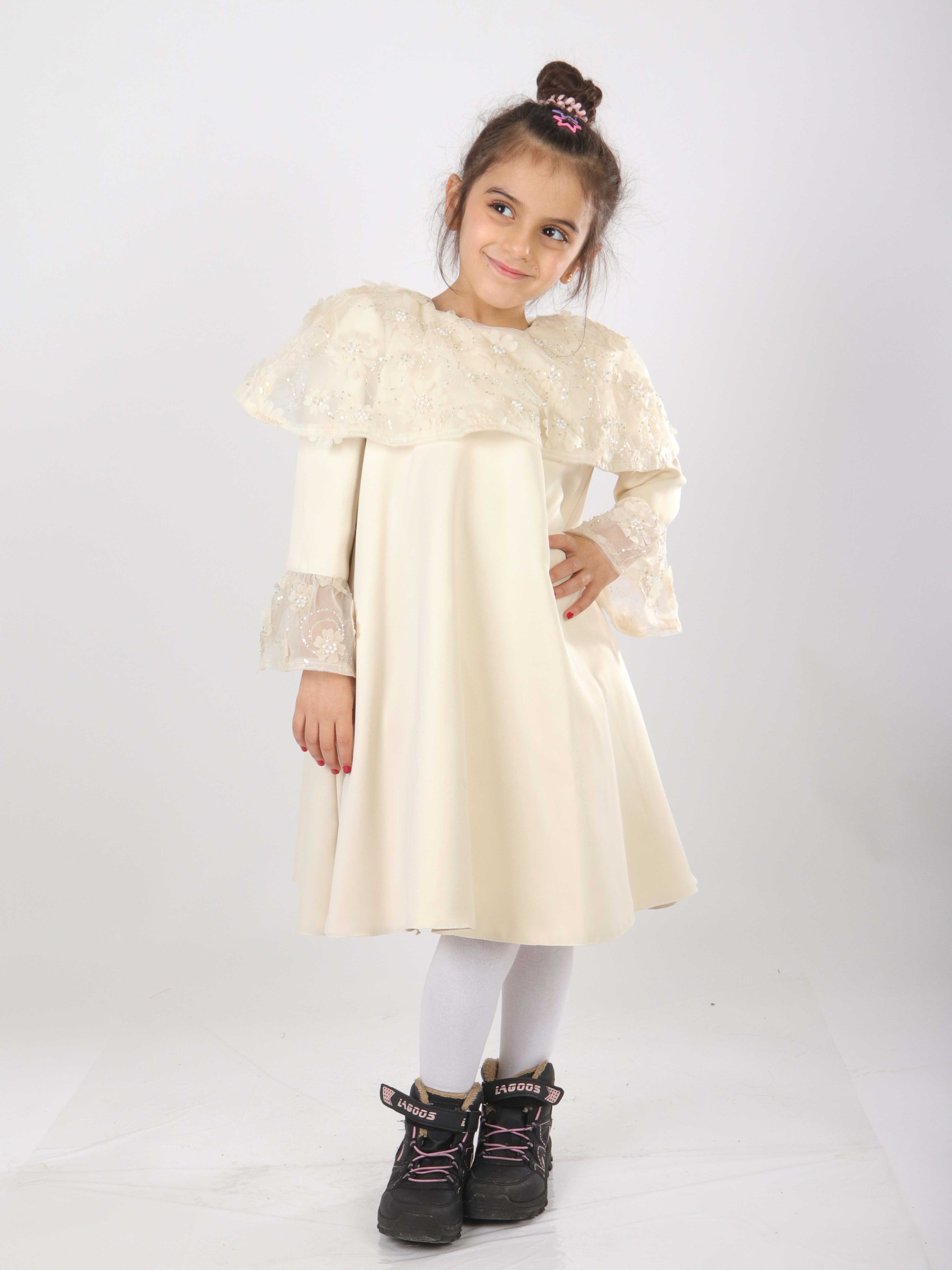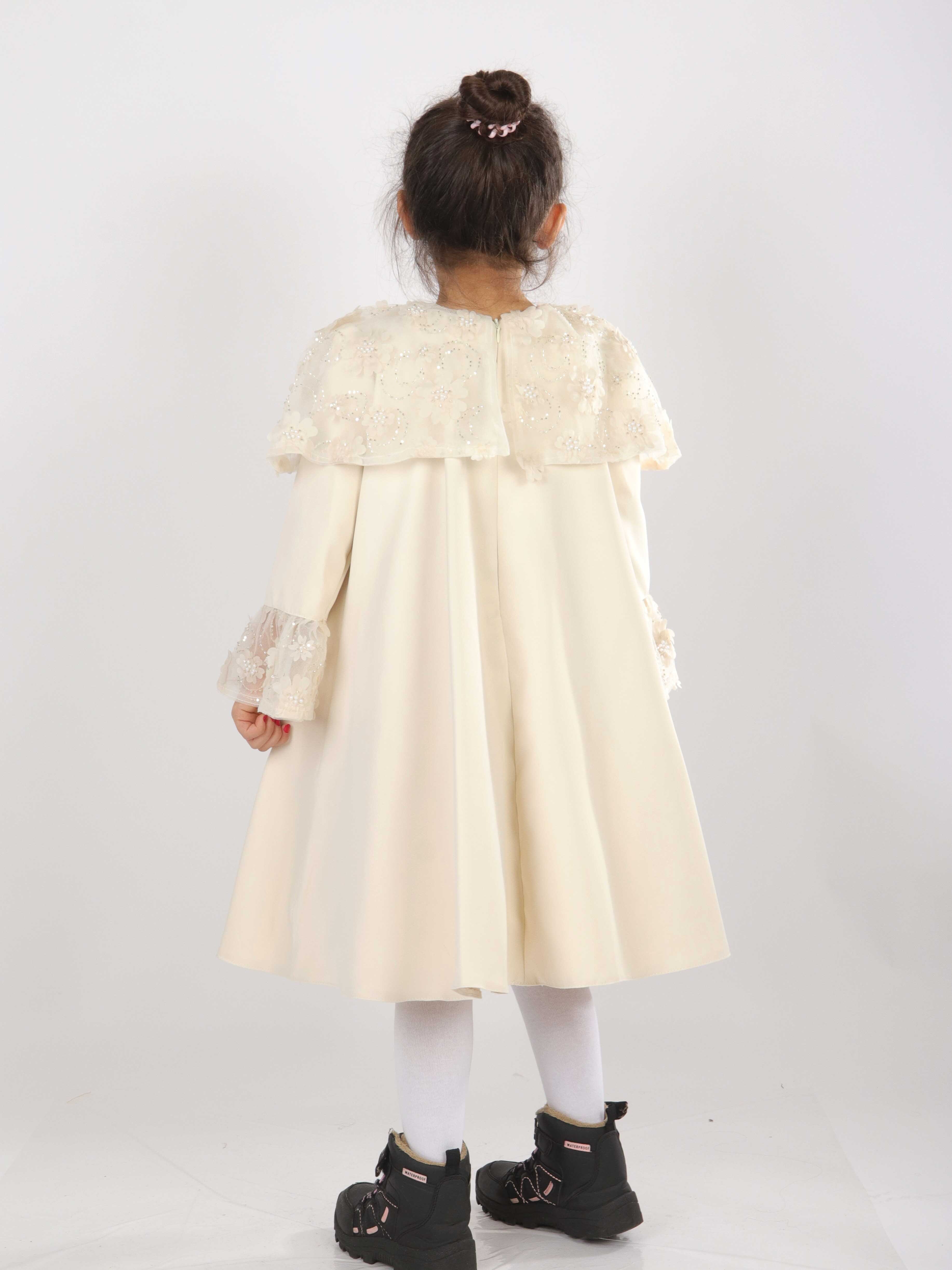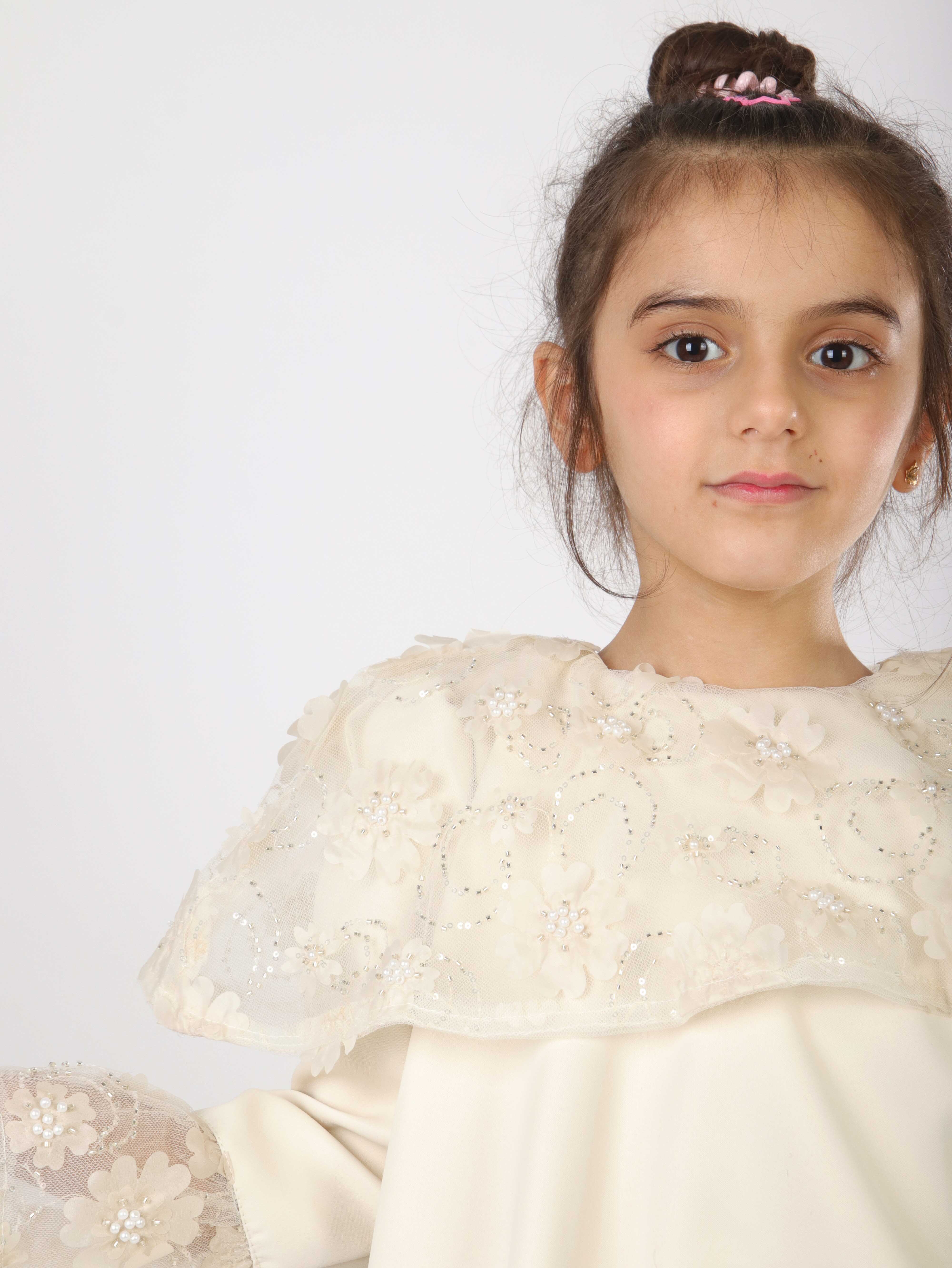 هذه الفستان البناتي تصميمه أنيق وراقي، مثالي للمناسبات الخاصة. لونه وردي ناعم، بطول متوسط وأكمام طويلة. يحتوي على تفاصيل من التول مزينة بتطريزات الأزهار واللؤلؤ على الكتفين وأطراف الأكمام، مما يضيف لمسة رقيقة وجميلة. الفستان بدون غطاء للرأس أو سحاب، مما يعطي مظهرًا بسيطًا وجذابًا. يتميز بياقة دائرية مريحة تناسب الأطفال.