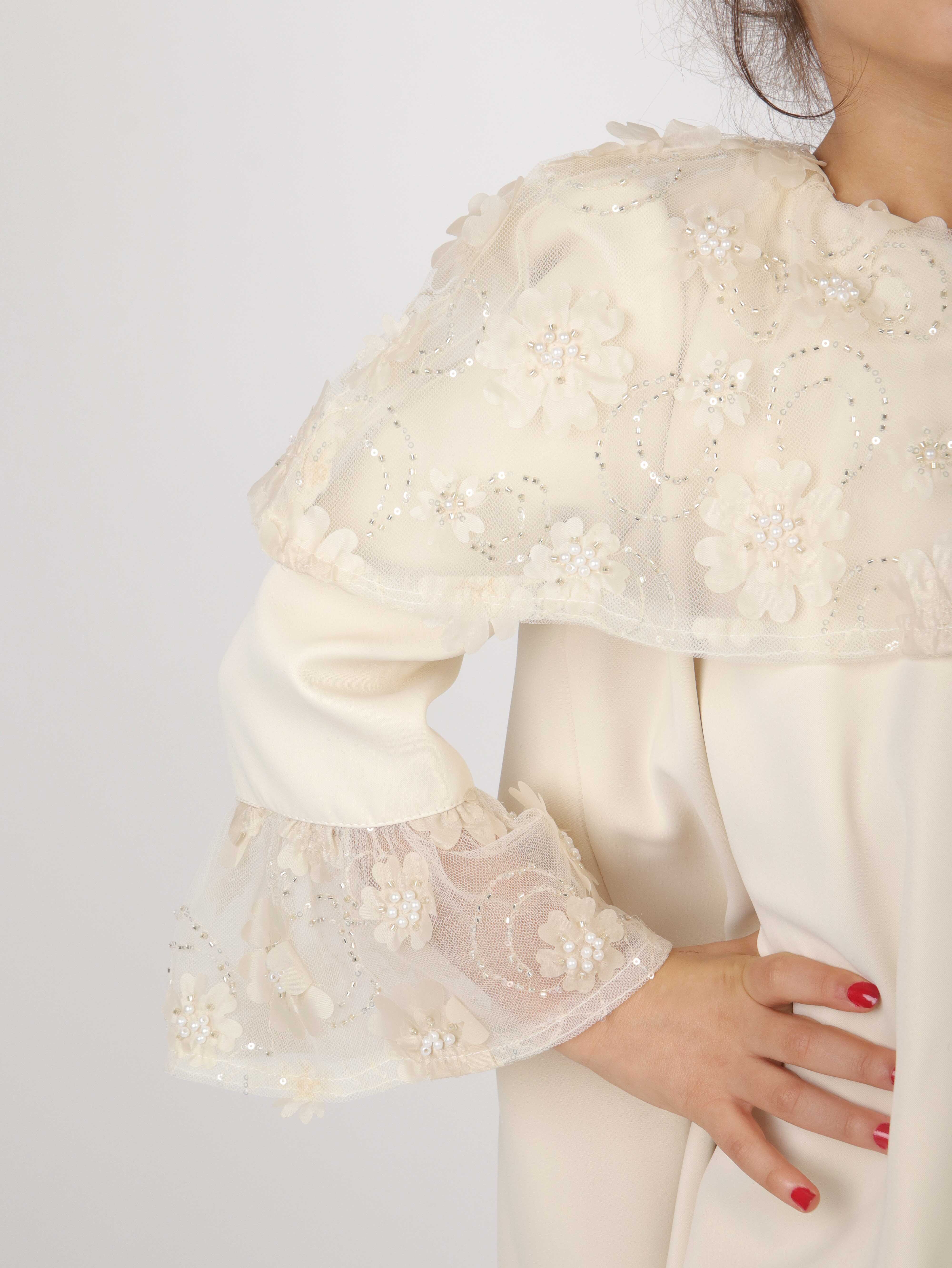 - تفاصيل تول مزينة بالأزهار على الكتفين والأكمام