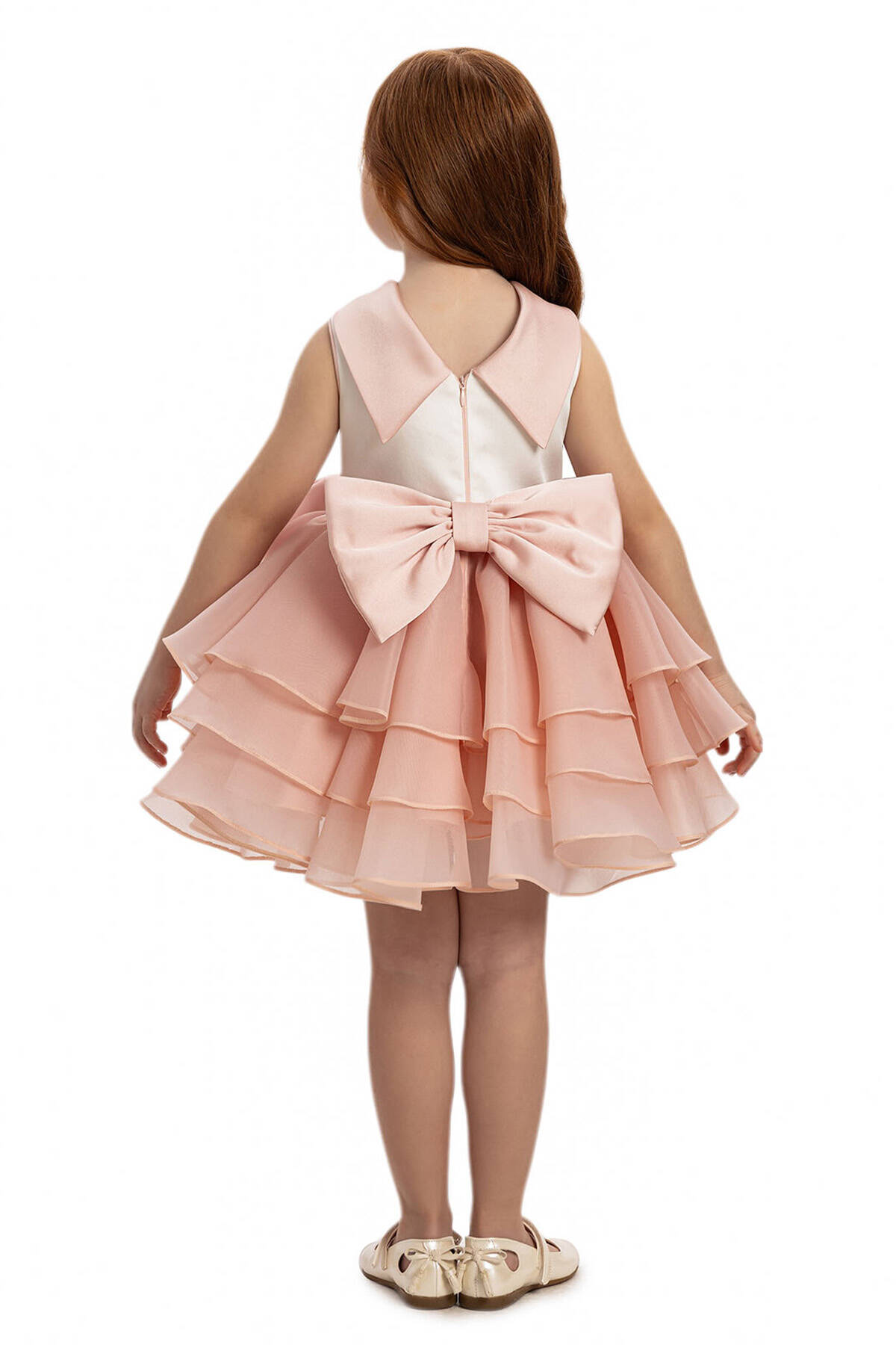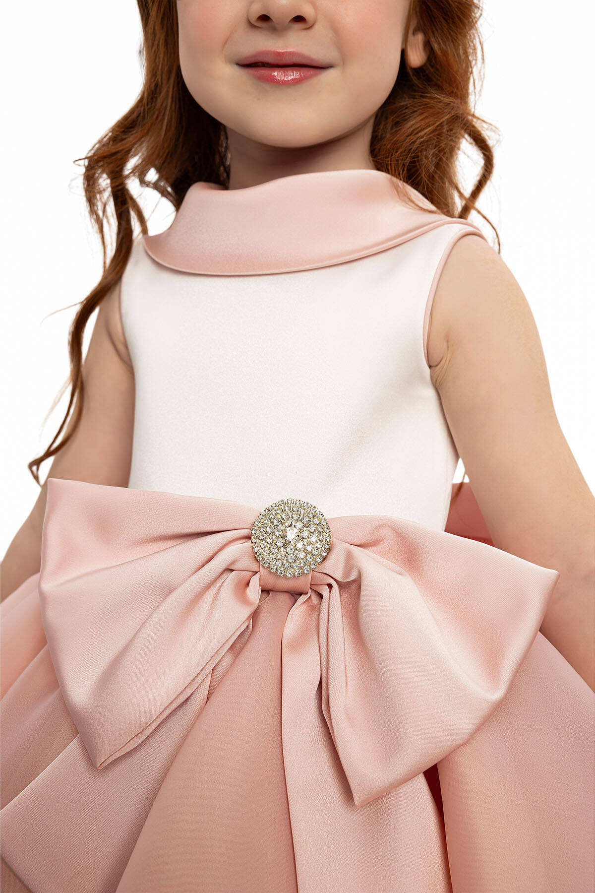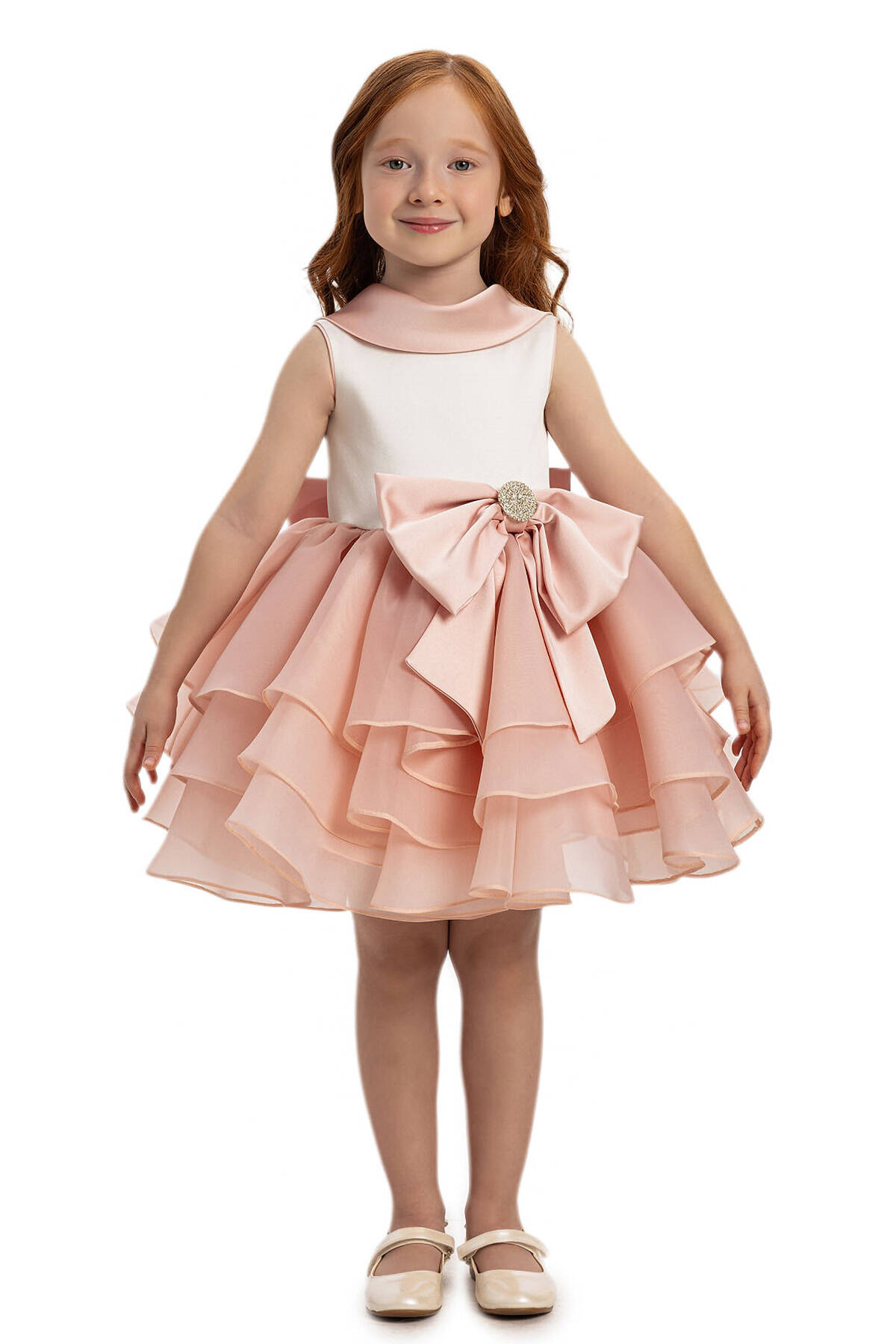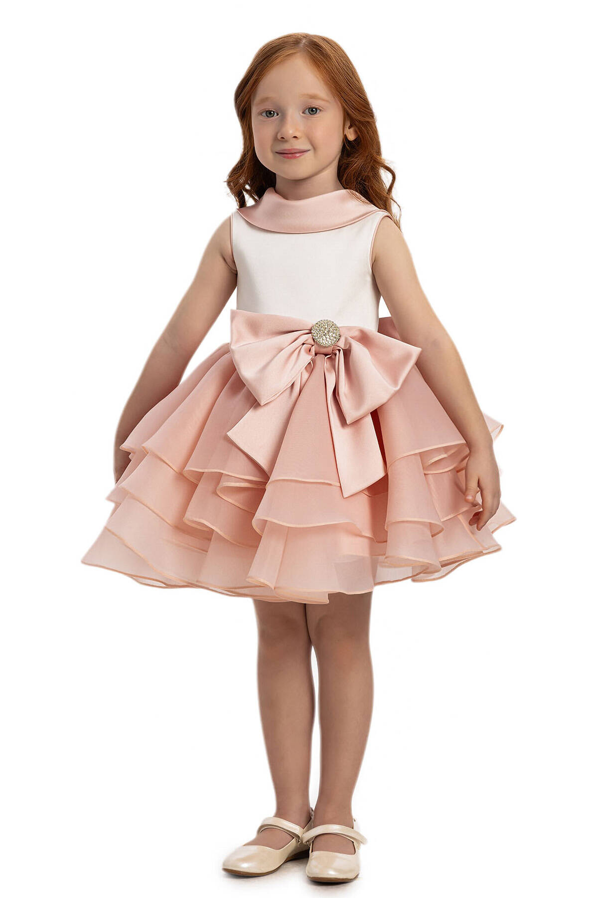 هذه الفستان الأنيق للبنات مصمم للمناسبات الخاصة والحفلات. يتميز بتصميم بدون أكمام وياقة مستديرة لتوفير راحة أثناء الارتداء. التنورة مصنوعة من طبقات متعددة من قماش التول، مما يخلق مظهرًا حجمياً ومنتفخاً. يوجد في الخصر فيونكة كبيرة باللون الوردي مزينة بأحجار متلألئة تضيف لمسة من الأناقة والجاذبية. يحتوي الفستان على سحّاب مخفي في الخلف ويوجد في الخلف أيضًا فيونكة كبيرة. اللون وردي بودرة ناعم يمنح مظهراً رقيقًا وأنثويًا.