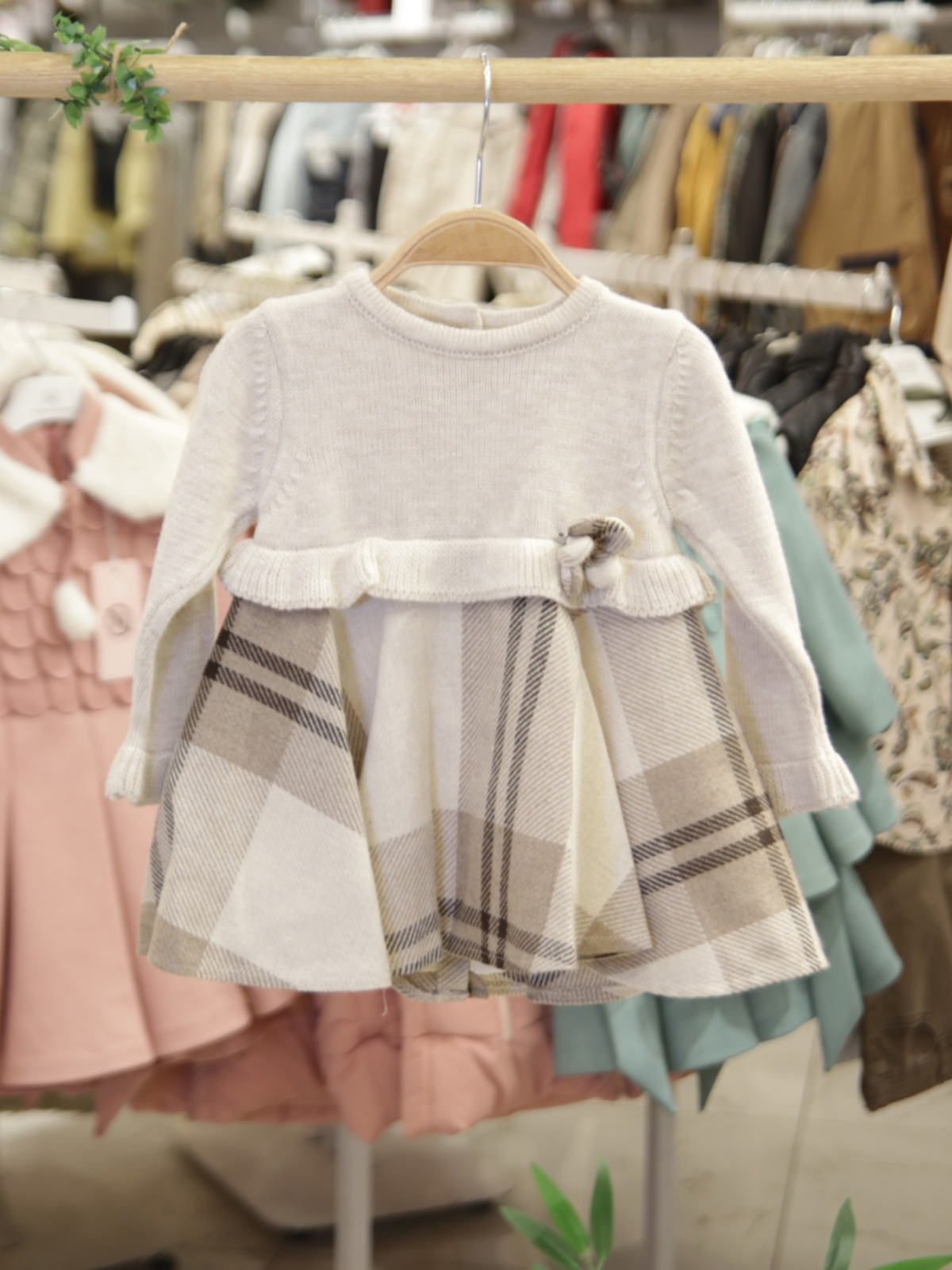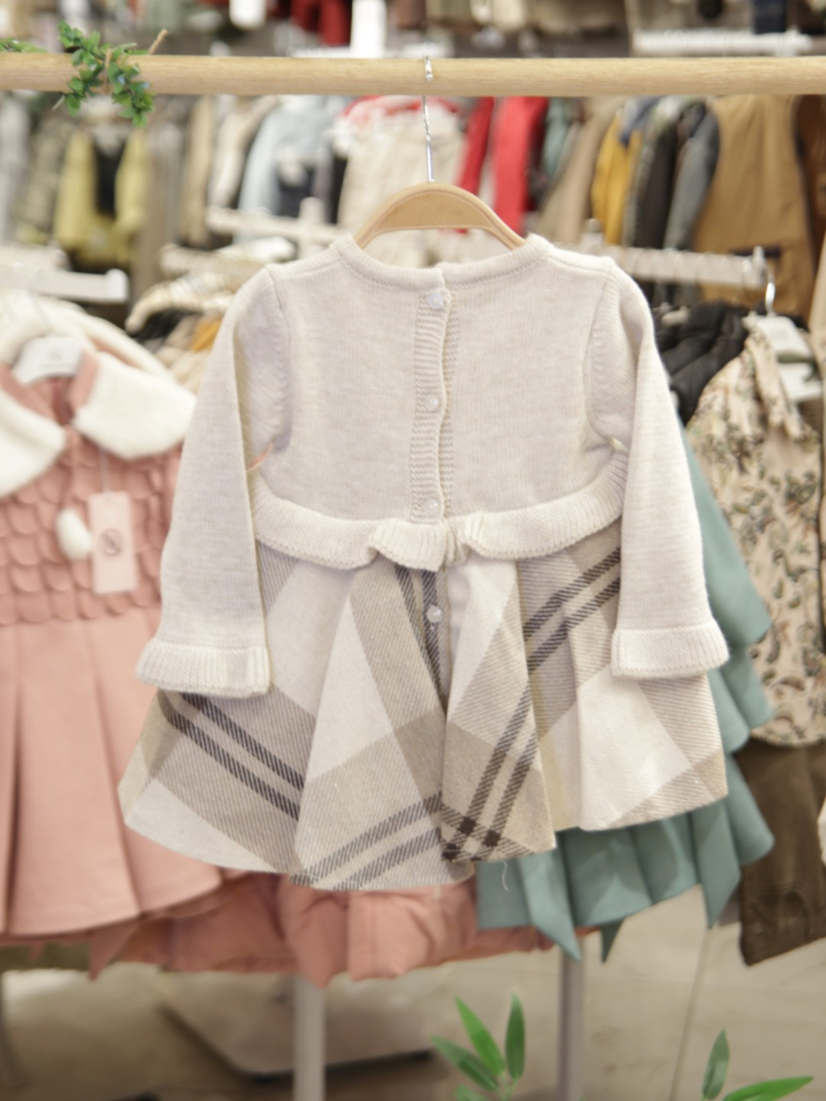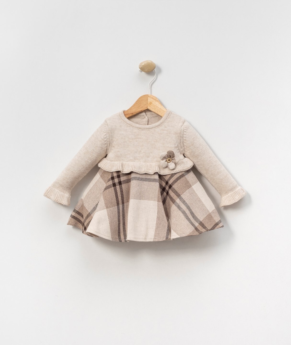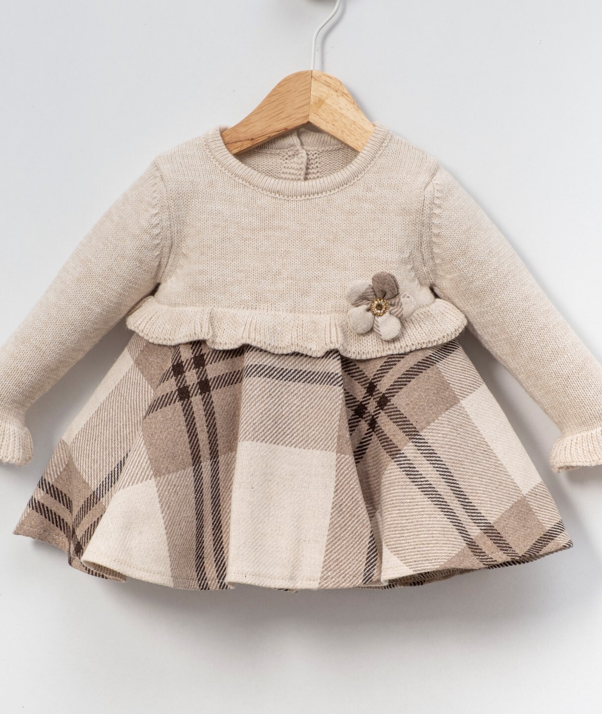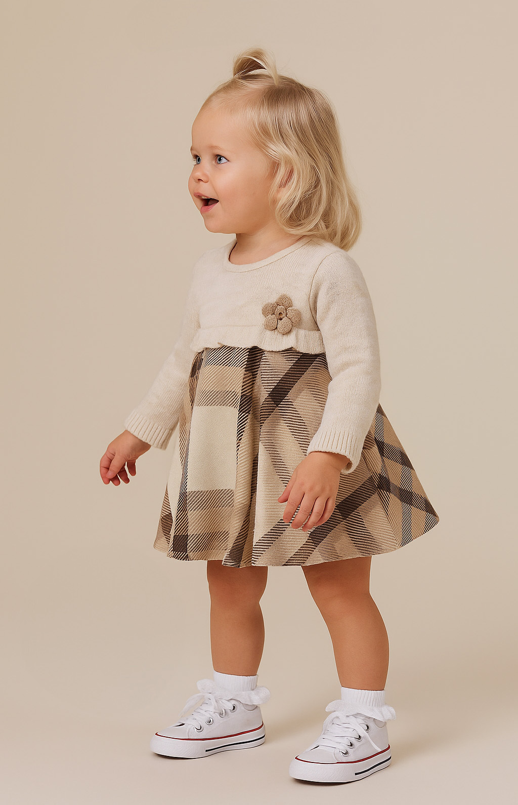 Bu zarif kız çocuk elbisesi, kış ayları için ideal bir tercih sunar. Üst kısmı yumuşak ve sıcak tutan bej tonlarında örme kumaştan yapılmıştır. Uzun kollu tasarımı sayesinde ekstra koruma sağlar. Elbisenin etek kısmı geniş ve midi uzunluğunda, bej ve kahverengi tonlarında büyük kareli desenlerle süslenmiştir. Bel hizasında şık bir fırfır detayı ve yanında sevimli bir çiçek aksesuarı yer alır. Yuvarlak bisiklet yaka, rahat bir kullanım sunar ve arka kısmında düğme detayı bulunmaktadır.