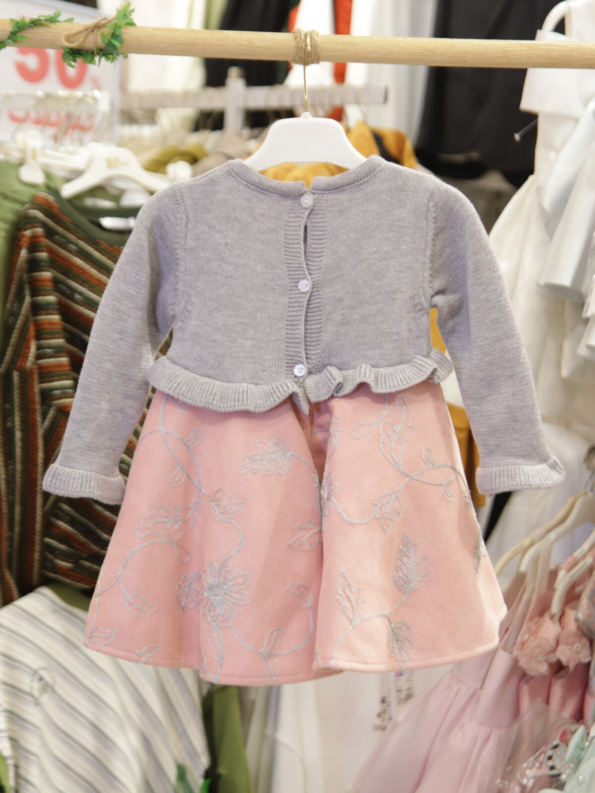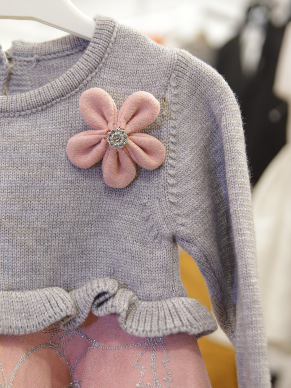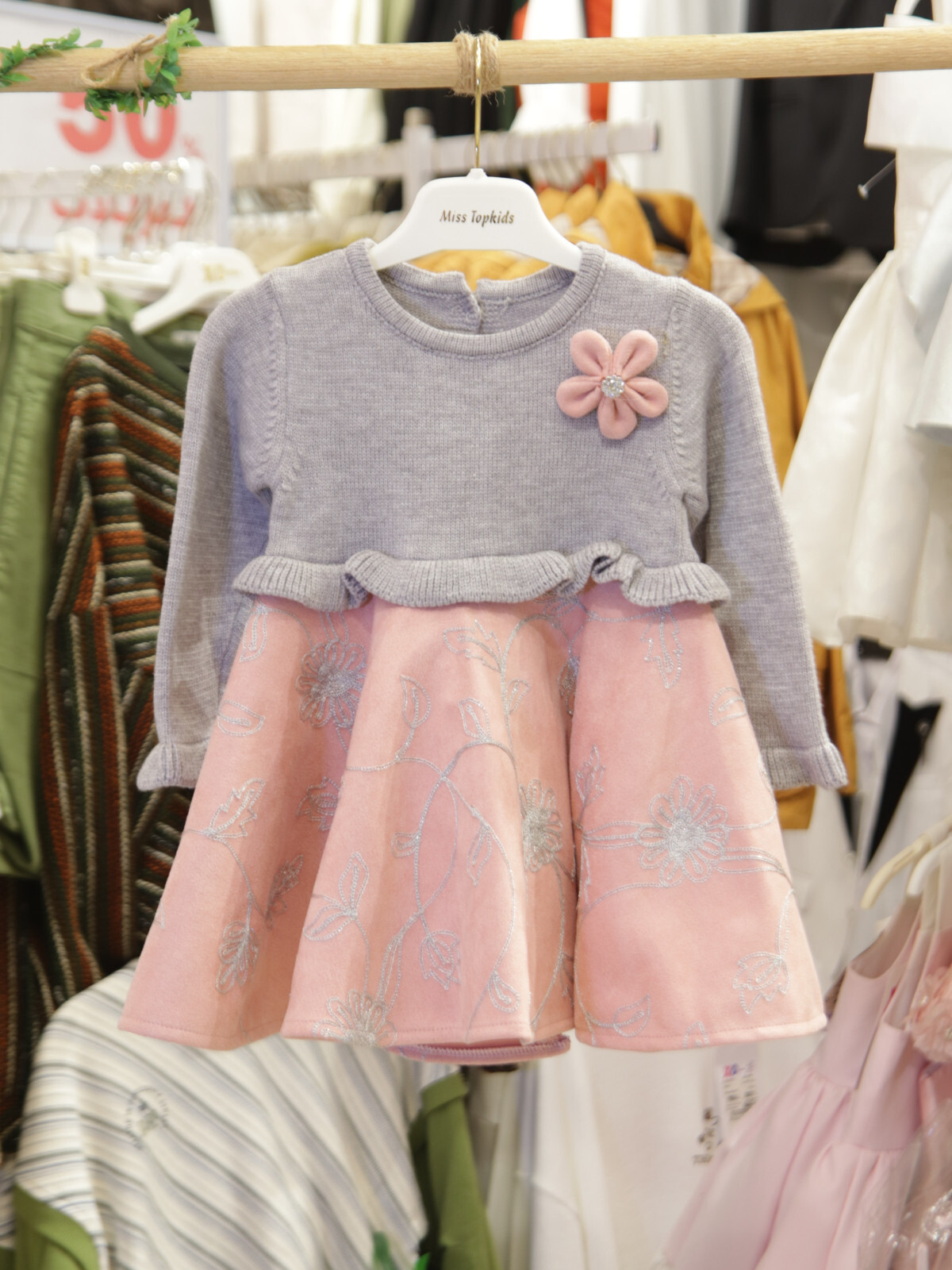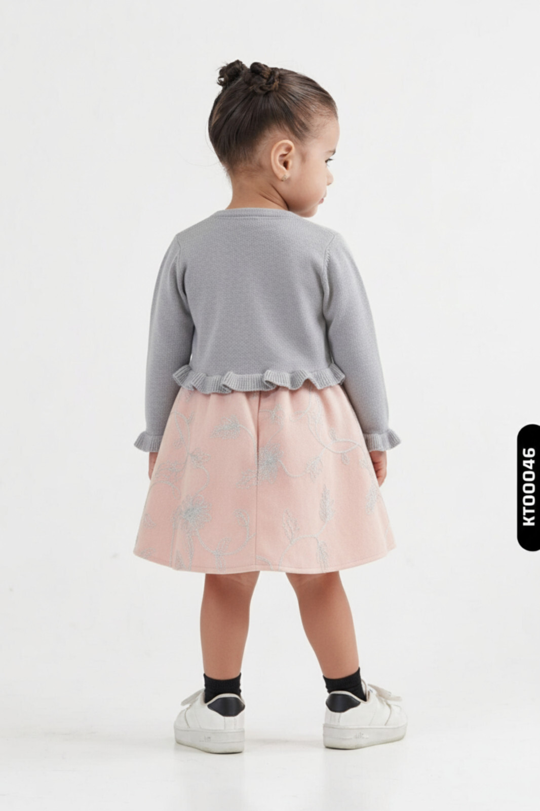 Şık ve rahat bir kız çocuk elbisesi arıyorsanız, bu model tam size göre. Üst kısmı gri renkte, uzun kollu ve sıfır yakalıdır. Bel hizasında fırfırlı detayla sevimli bir görünüm sunar. Etek kısmı ise pembe renkte, midi boyda ve gümüşi çiçek desenleriyle süslenmiştir. Elbisenin üzerinde pembe renkli, yumuşak kumaştan yapılmış zarif bir çiçek aplikesi bulunur. Kış sezonu için ideal, hem günlük hem özel anlarda kullanılabilir.