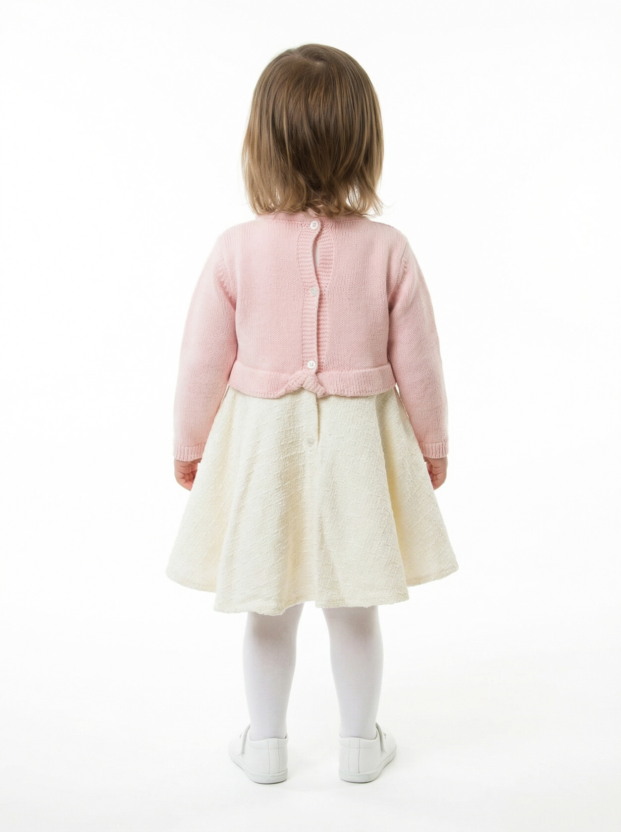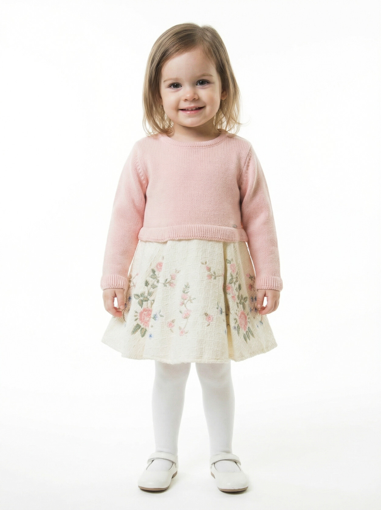 Bu şirin kız çocuk elbisesi, bahar sezonu için mükemmel bir seçimdir. Pembe üst kısmı ile zarif bir görünüm sunarken, çiçek desenli etek kısmı ile de neşeli bir hava katıyor.