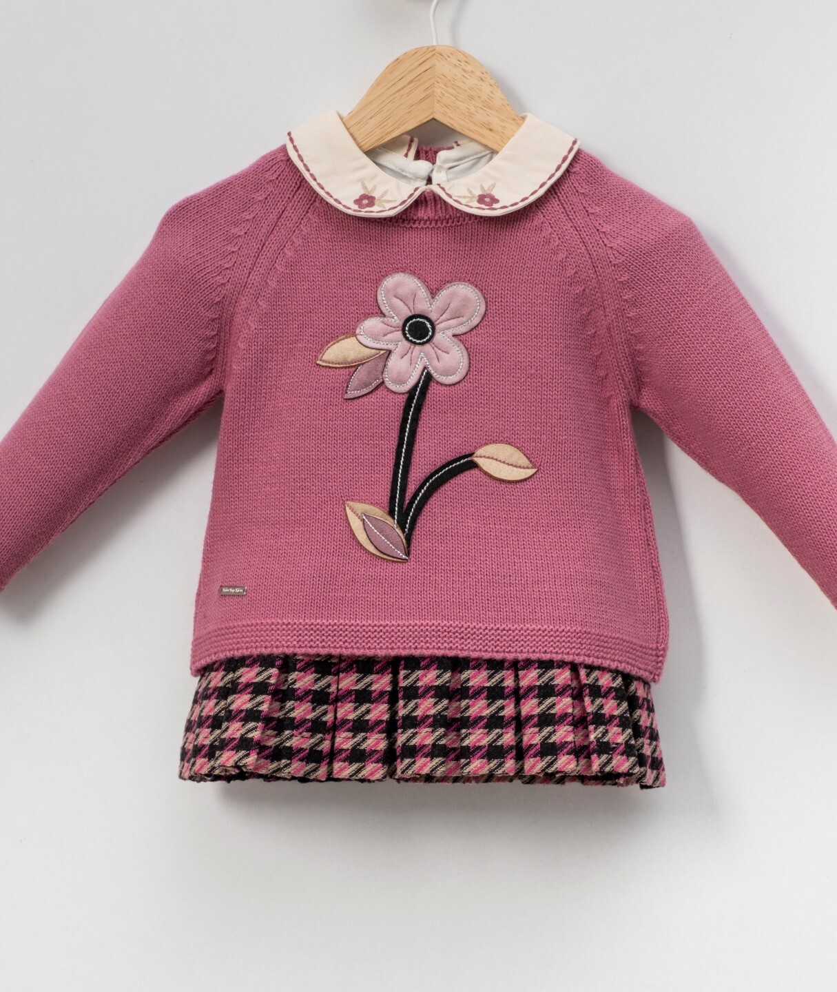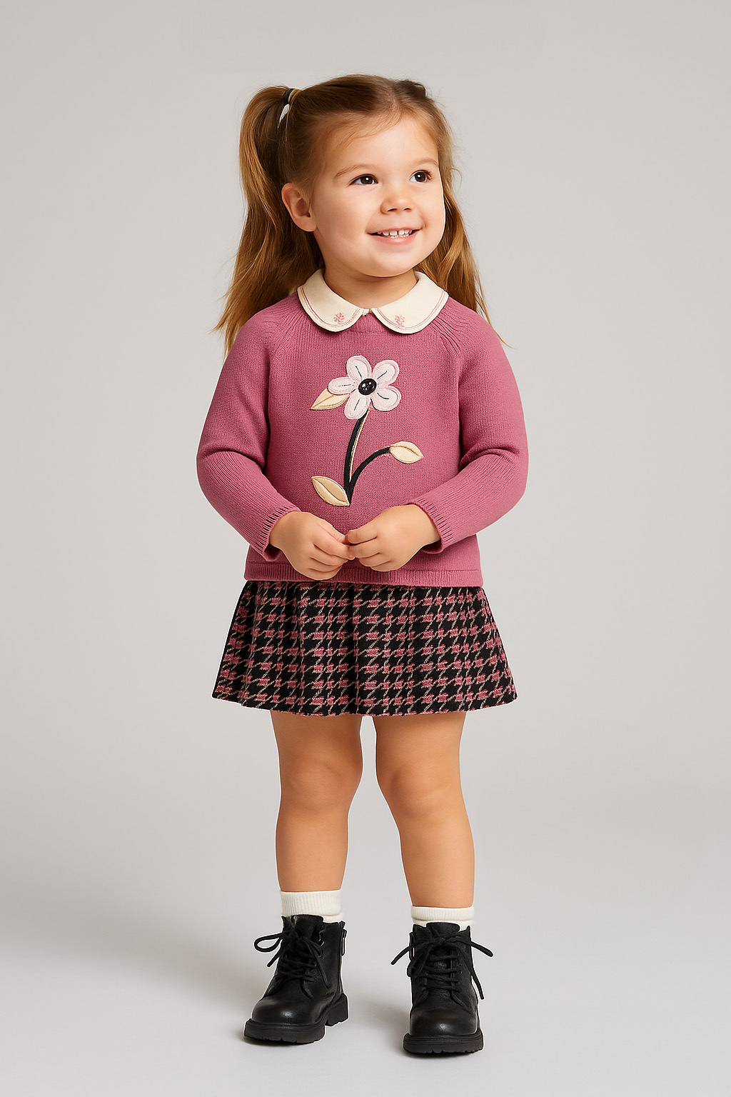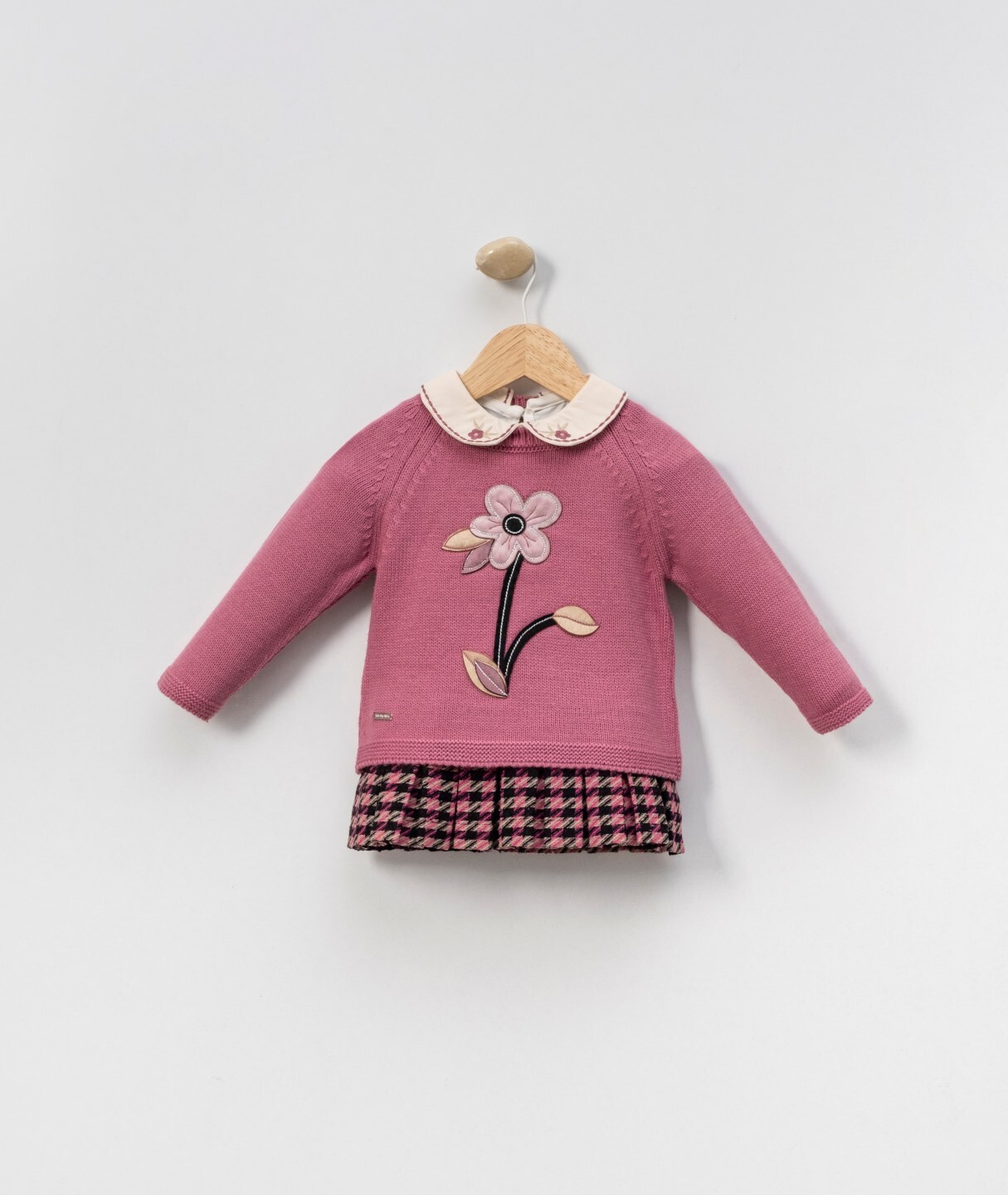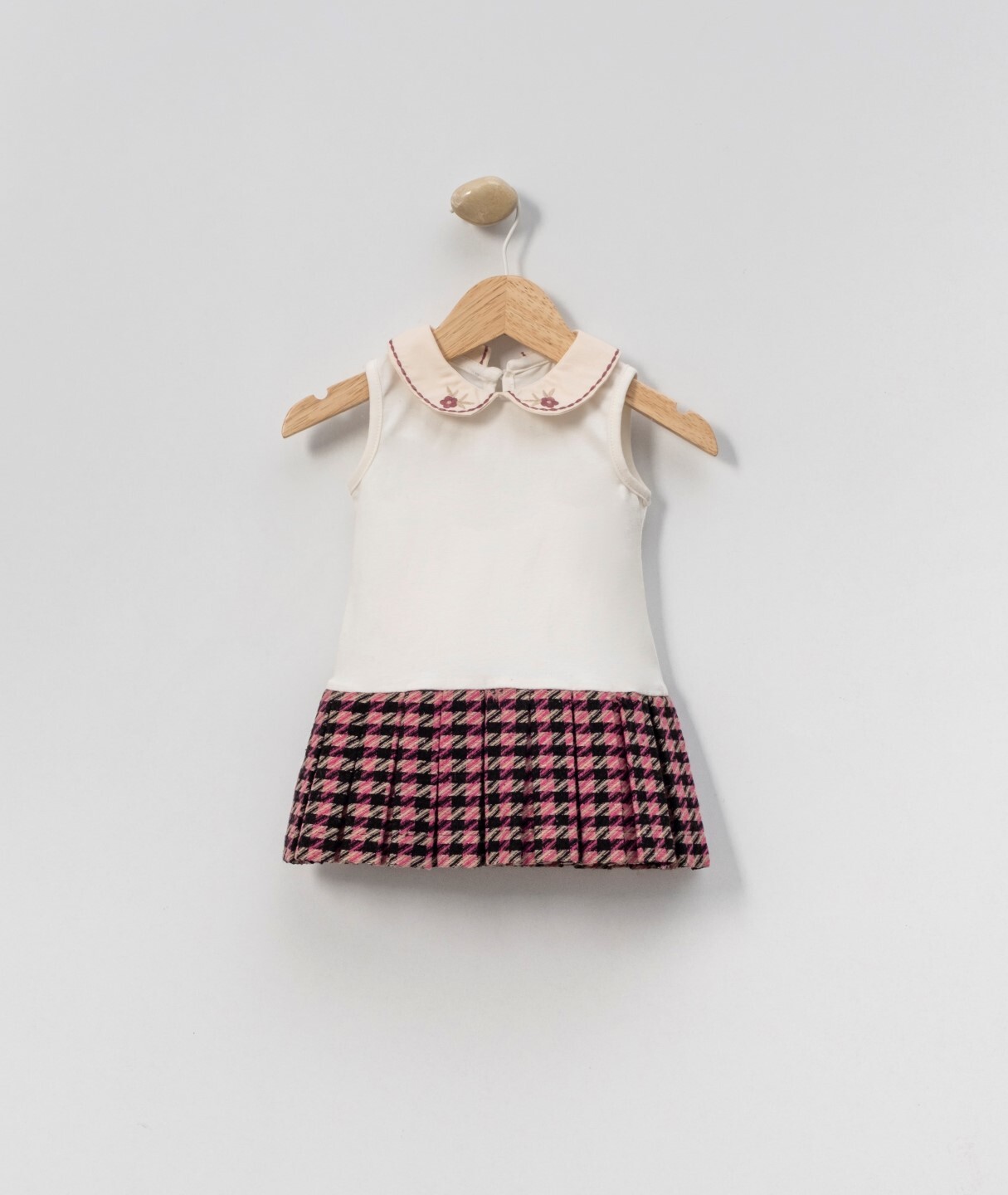 Bu kız çocuk elbisesi, kış sezonu için ideal sıcak ve şık bir tercihtir. Üst kısmı fuşya renkte, uzun kollu ve örgü kumaştan yapılmıştır. Önünde büyük, yumuşak dokulu çiçek aplikeleri bulunur. Krem rengi, çiçek işlemeli peter pan yakası zarif bir detay katmaktadır. Elbisenin etek kısmı ise pileli, pembe ve siyah kareli desenle tasarlanmış, rahat hareket imkanı sunar. Arkada gizli fermuar ile kolay giyilip çıkarılabilir.