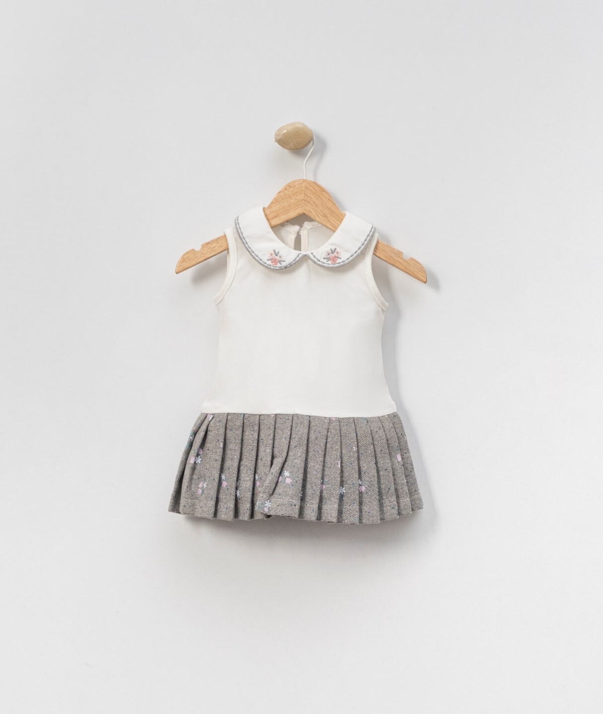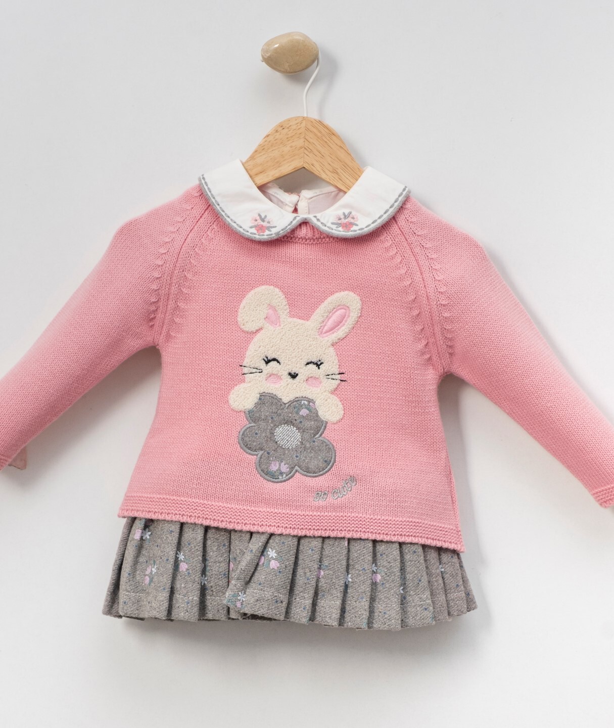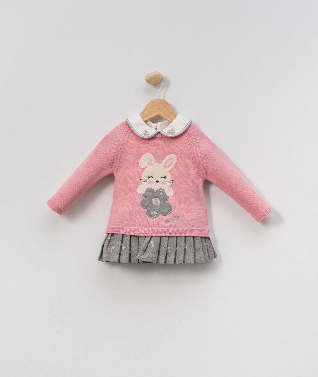 Bu kız çocuk elbisesi, şık ve sevimli tasarımıyla kış ayları için idealdir. Pembe renkli uzun kollu üstü örgü dokumaya sahip olup, üzerinde sevimli bir tavşan figürü yer almaktadır. Beyaz, işlemeli yuvarlak yaka detayı elbiseye zarif bir dokunuş katıyor. Alt kısmında gri, pilili ve küçük çiçek desenleri bulunan etek kısmı bulunmaktadır. Elbise fermuarsız, cepsiz ve kordonlu detay içermemektedir. Rahat kesimi ve uzun kollu yapısıyla çocukların hareket özgürlüğünü kısıtlamadan sıcak tutar.