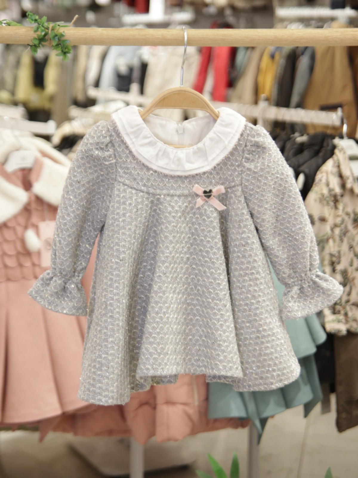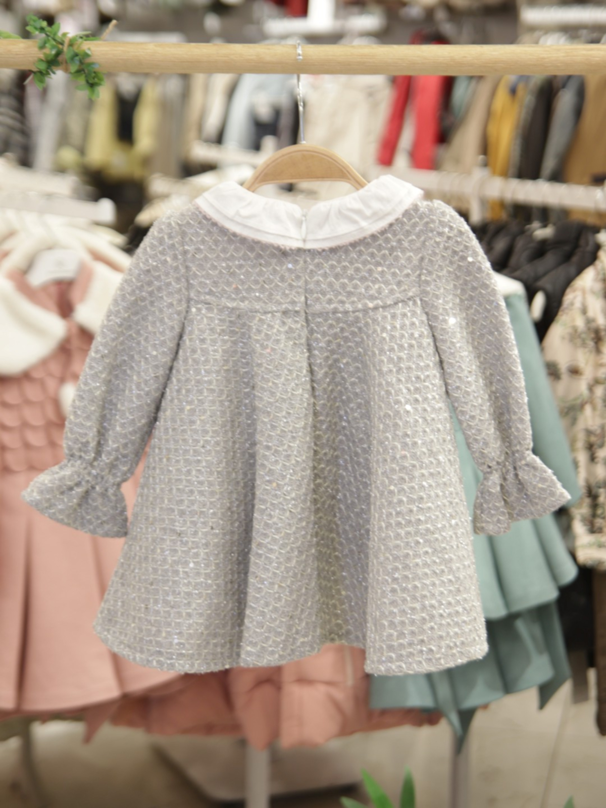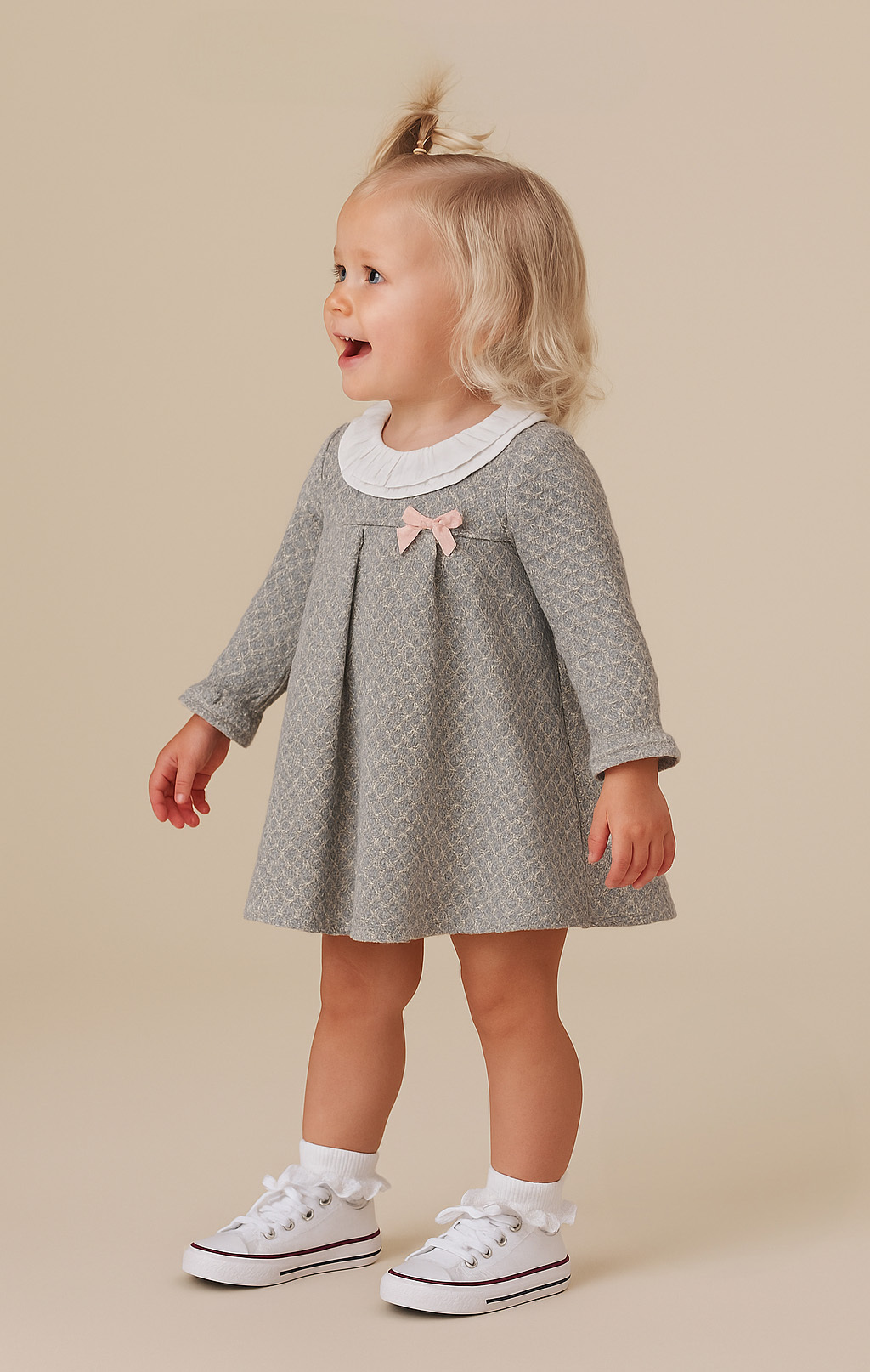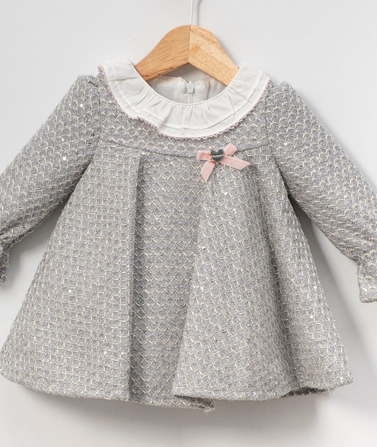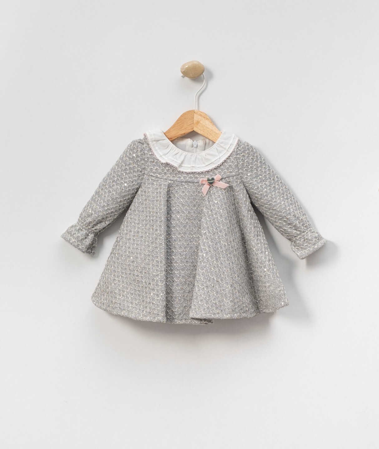Bu şık kız çocuk elbisesi, kış sezonu için özel olarak tasarlanmıştır. Gri renkte, simli dokusu ile dikkat çeken elbise, uzun kollu ve midi boydadır. Sıfır yaka olarak tasarlanmış beyaz fırfırlı yakası, elbiseye zarif bir dokunuş katarken, ön taraftaki küçük pembe fiyonk detayları ise sevimli bir hava yaratır. Fermuarı arkada yer almakta olup, rahat giyip çıkarma imkanı sunar. Günlük ve özel davetler için ideal, hem şık hem de rahat bir seçenektir.