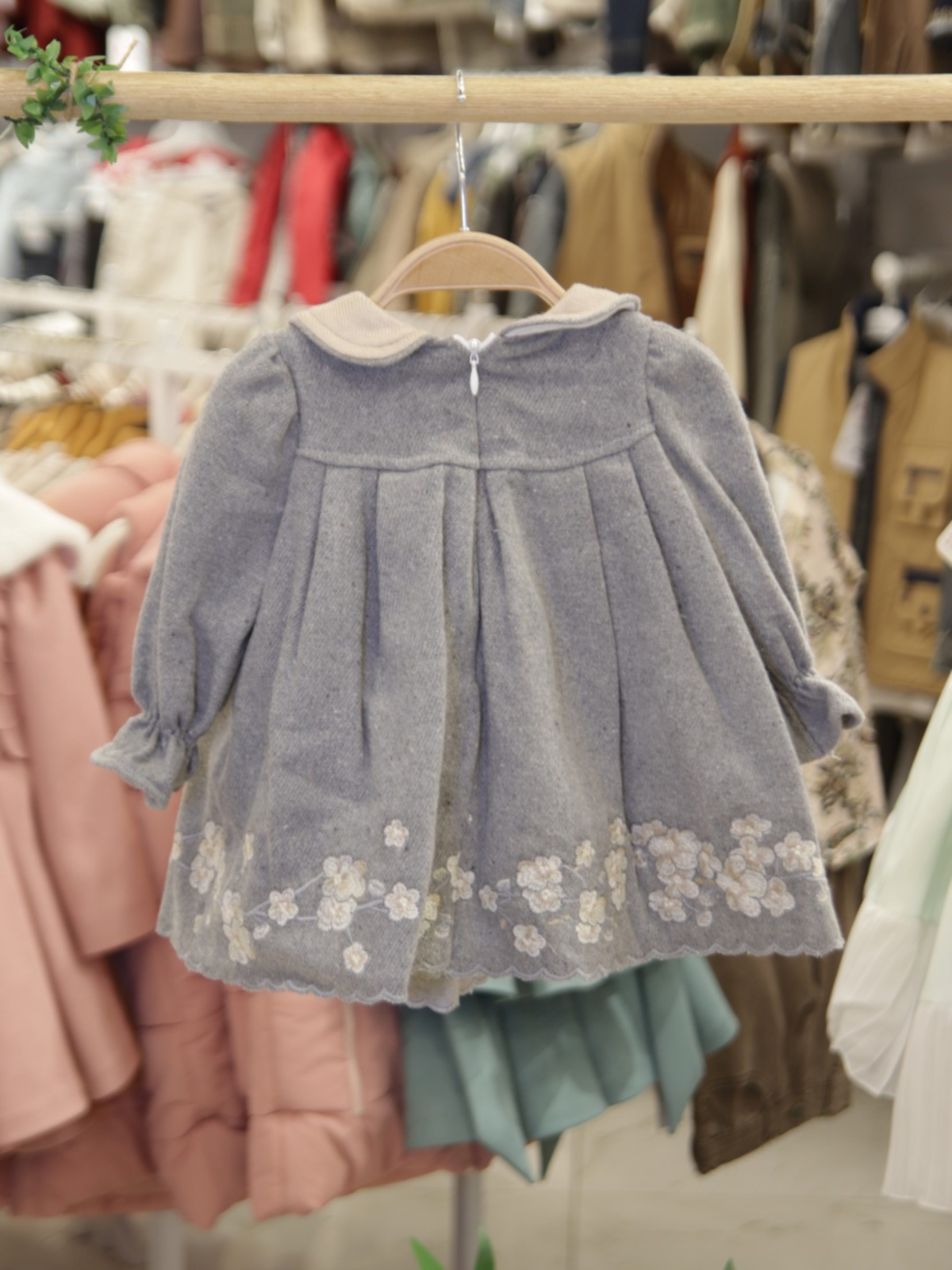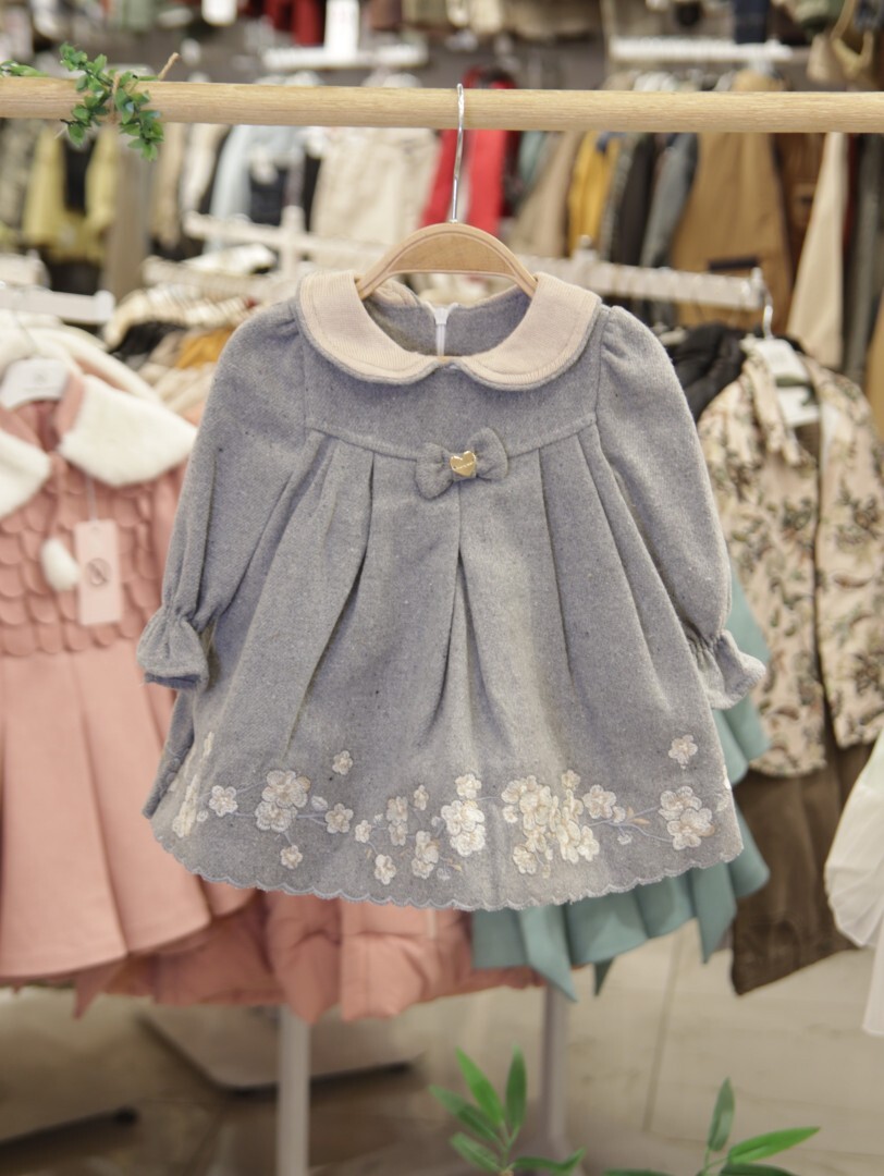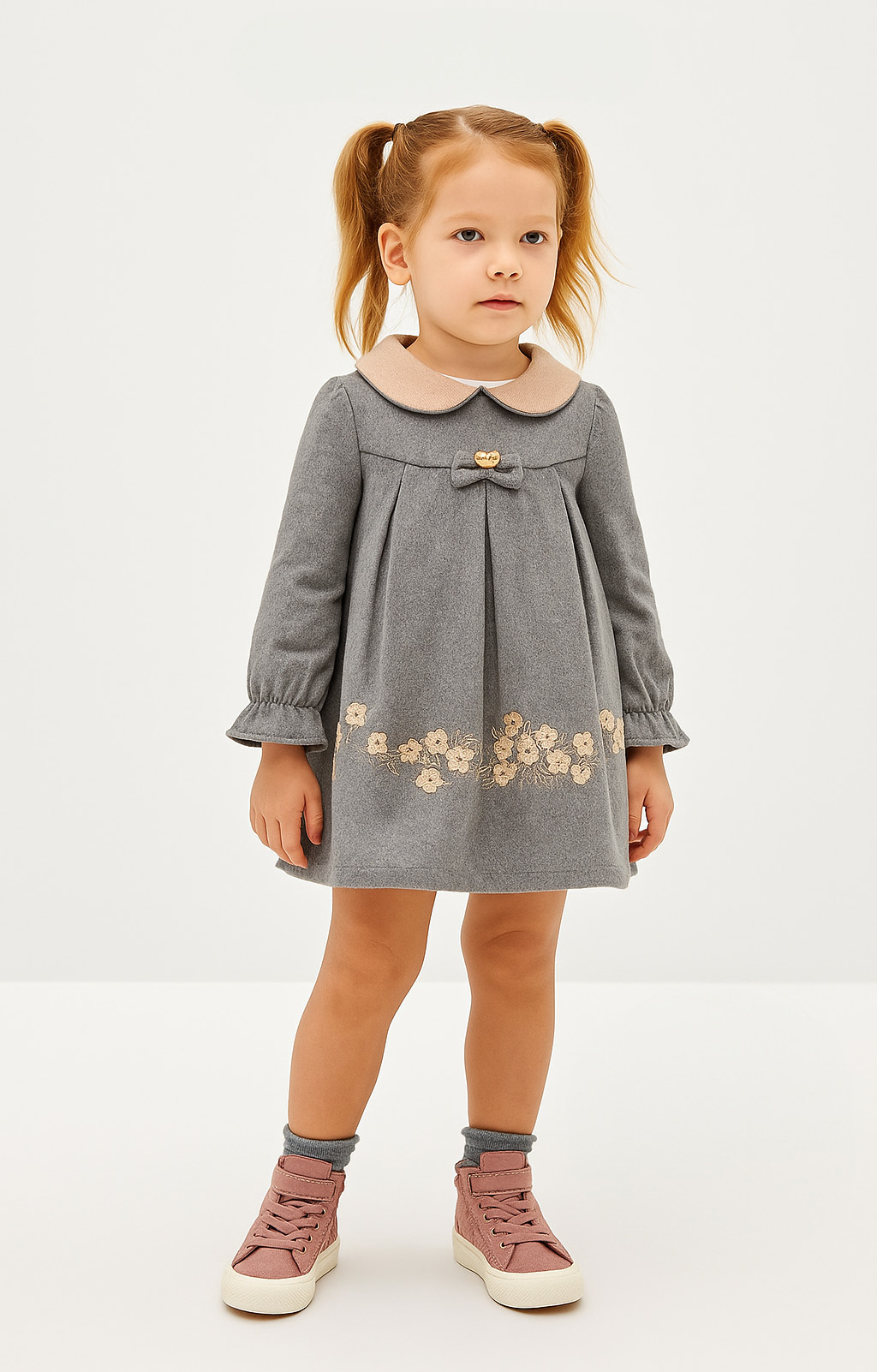 Bu şık kız çocuk elbisesi, kış ayları için özel olarak tasarlanmış zarif bir parçadır. Uzun kollu ve yumuşak dokusuyla küçük prenseslerin konforunu ön planda tutar. Krem rengi yuvarlak yaka, elbiseye tatlı bir kontrast yaratırken, ön kısmındaki küçük fiyonk ve kalp detayları sevimli bir dokunuş sunar. Etek kısmındaki bej tonlarında çiçek işlemeleri, elbiseye zarif ve göz alıcı bir görünüm kazandırır. Elbise, sırt kısmında gizli fermuarla kolayca giyilip çıkarılabilir.