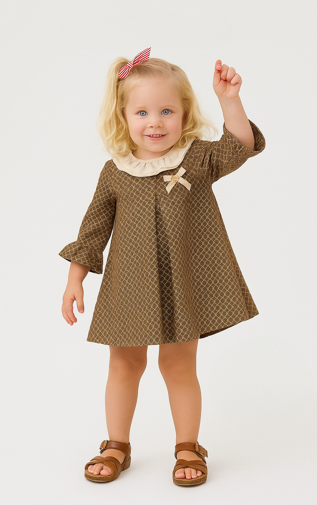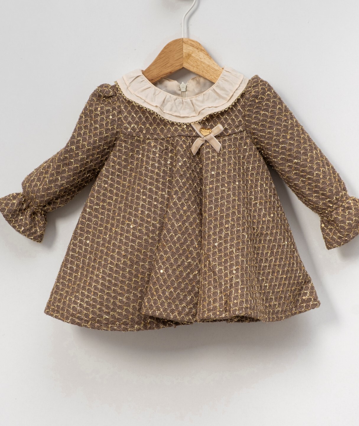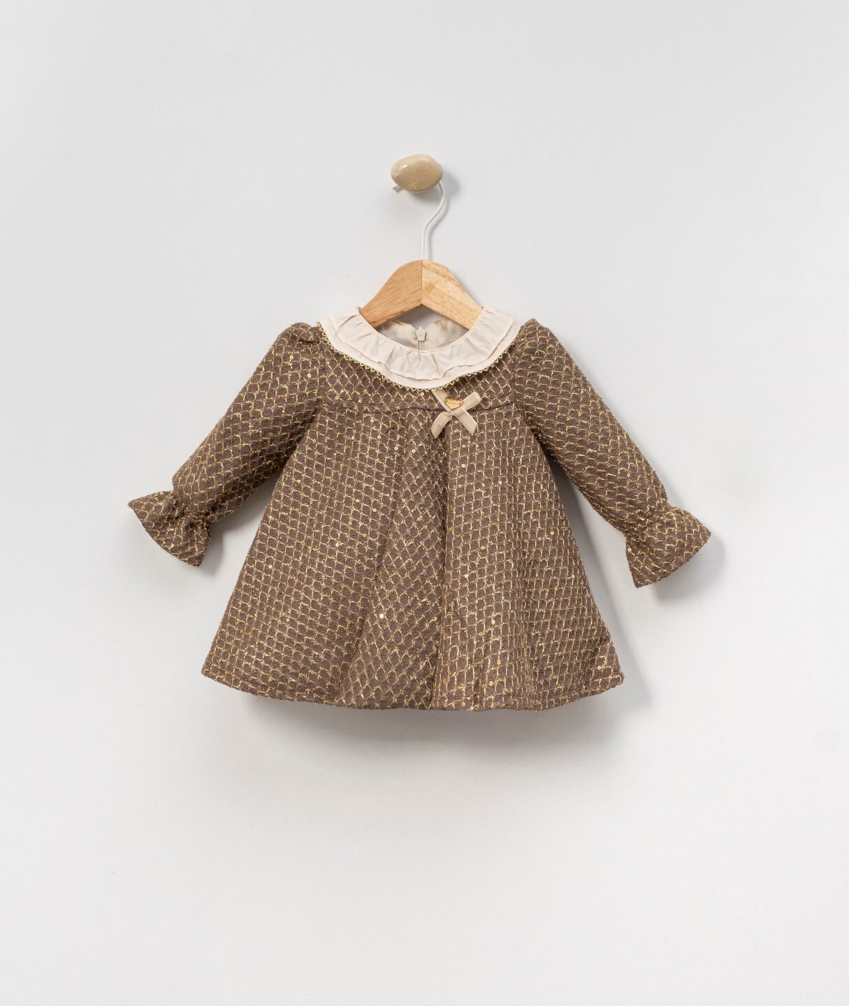 Bu kız çocuk elbisesi, şık ve zarif tasarımıyla özel günler için idealdir. Uzun kollu ve midi boyda olan elbise, kahverengi ve altın renklerinde ince desenlerle süslüdür. Sıfır yaka, krem rengi fırfırlı detaylarıyla zarif bir görünüm sunar. Göğüs kısmındaki küçük kadife fiyonk ve kalp aksesuarı, elbiseye sevimli bir dokunuş katar. Kolları bilekte hafifçe büzgülü olup rahat bir kullanım sağlar.