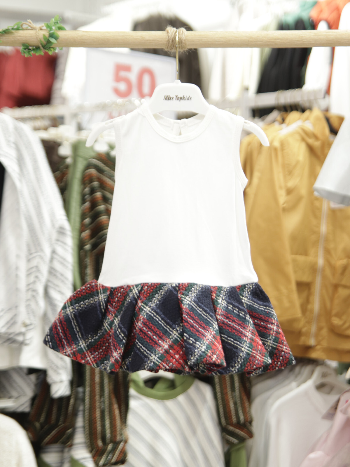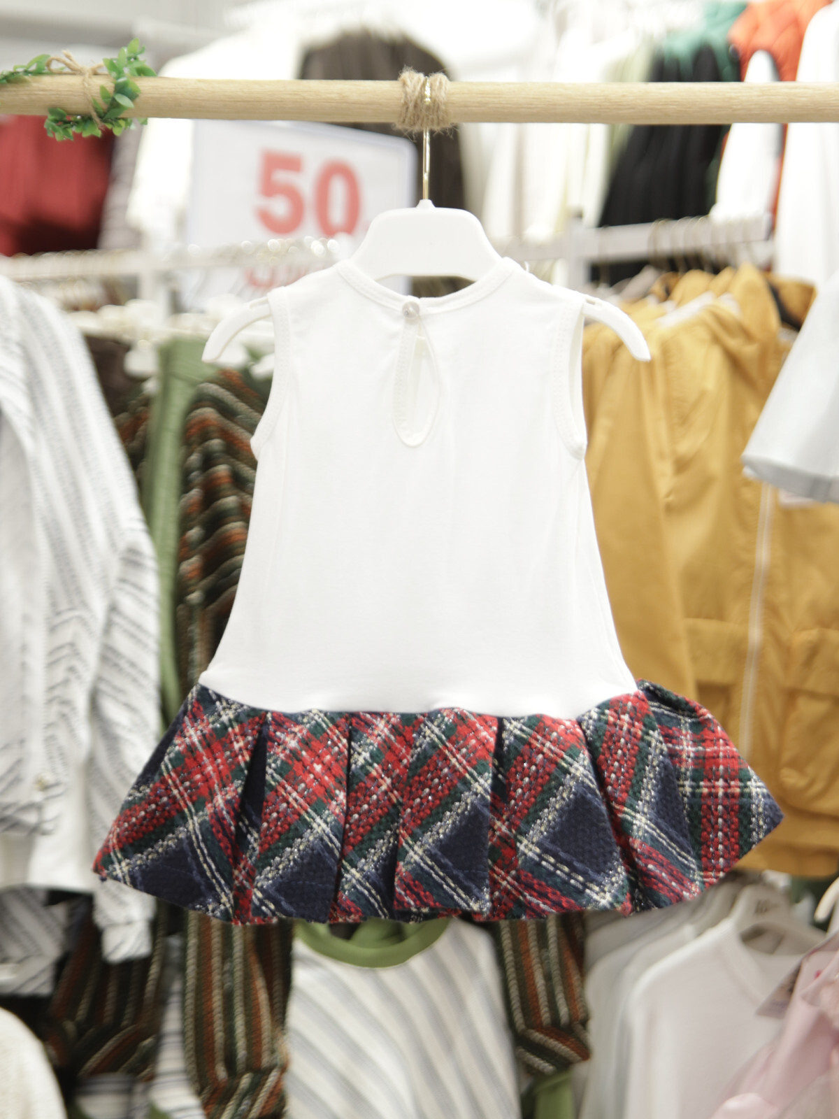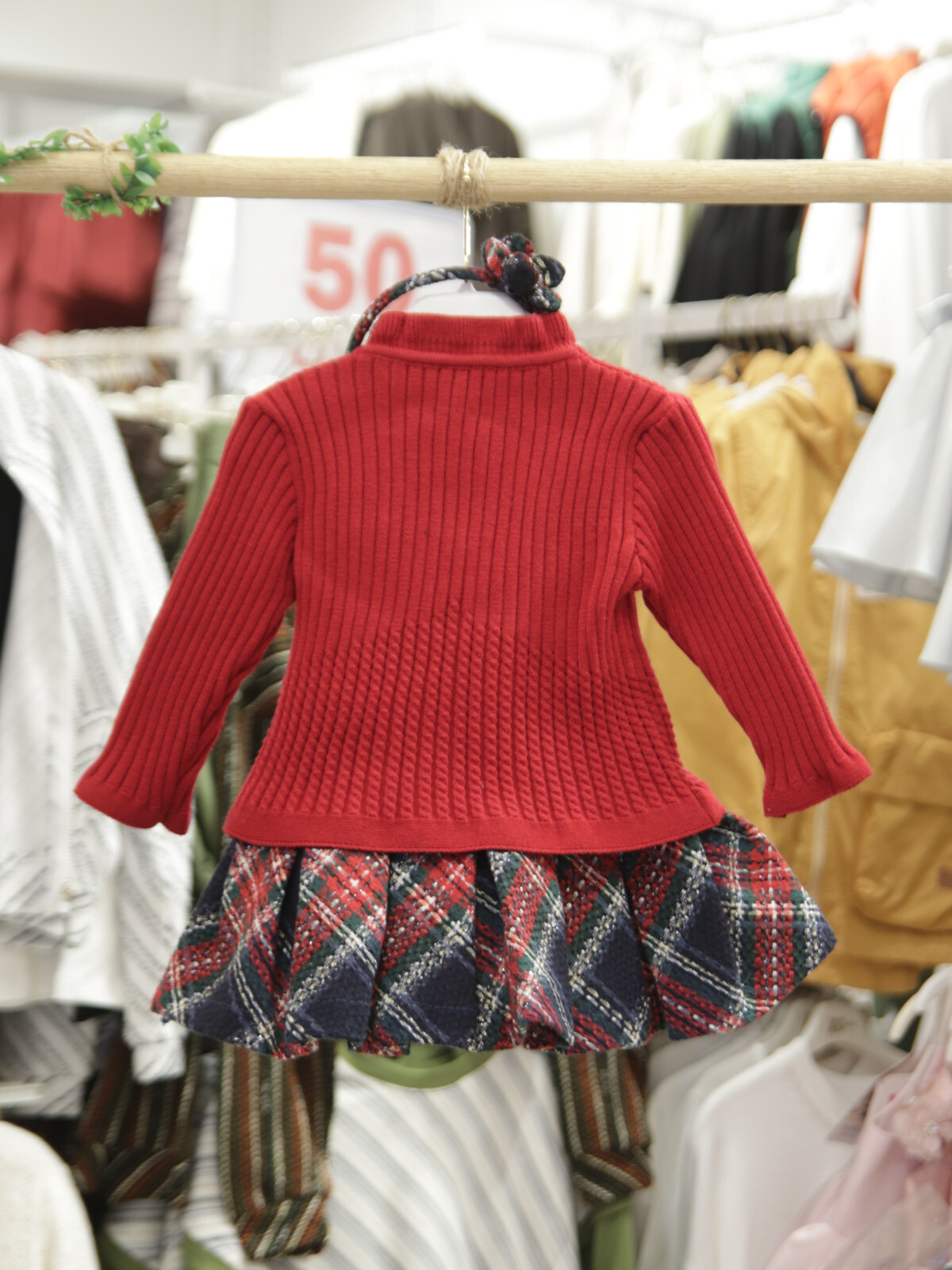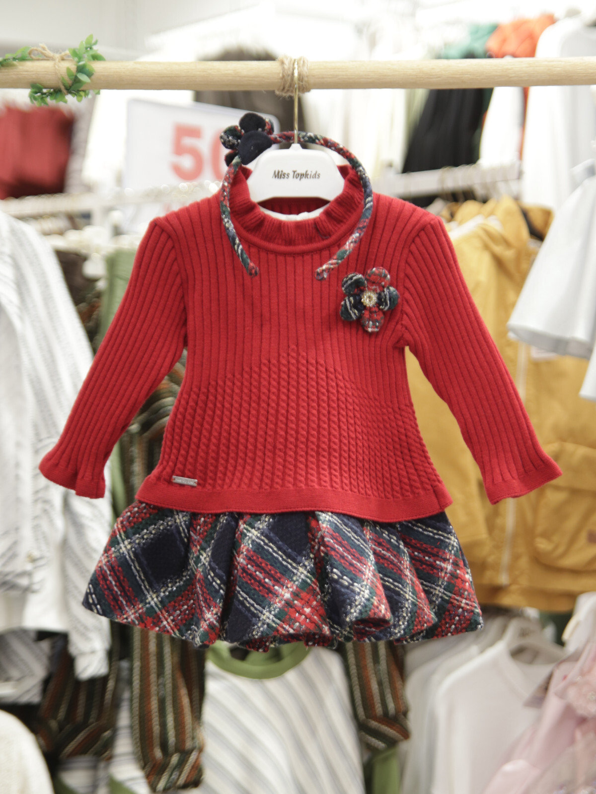 Bu kız çocuk elbisesi, kış ayları için ideal sıcaklıkta ve şıklıkta tasarlanmıştır. Üst kısmı kırmızı renkli, fitilli ve uzun kollu triko kumaştan üretilmiştir. Sıfır yaka formunda, yakasında zarif bir çiçek aksesuarı bulunmaktadır. Etek kısmı ise siyah ve kırmızı ekose desenli, hafif kabarık ve midi uzunluktadır. Kombin, siyah bağcıklı botlarla tamamlanarak hem şık hem de rahat bir görünüm sunar.