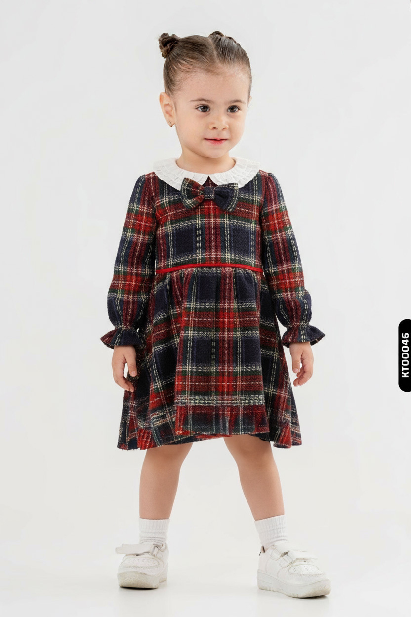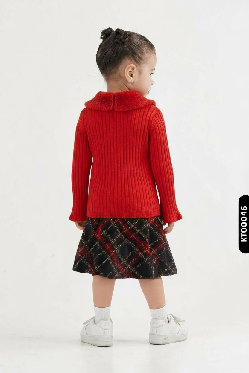 Gelince Haber VerBu kız çocuk kışlık elbise seti, sıcak ve şık bir kombin sunar. Elbise, uzun kollu ve klasik ekose desenlidir; bisiklet yaka üzerine beyaz fırfırlı detay ve göğüste büyük ekose fiyonk ile süslenmiştir. Üstüne giyilen kırmızı hırka, düğmeli ve yumuşak tüylü yakasıyla dikkat çeker. Hırkanın örgü dokusu ve uzun kolları, soğuk havalarda ekstra koruma sağlar. Diz üstü uzunluğundaki elbise, rahat kesimiyle hareket özgürlüğü sunar. Hem günlük kullanım hem de özel günler için idealdir.
