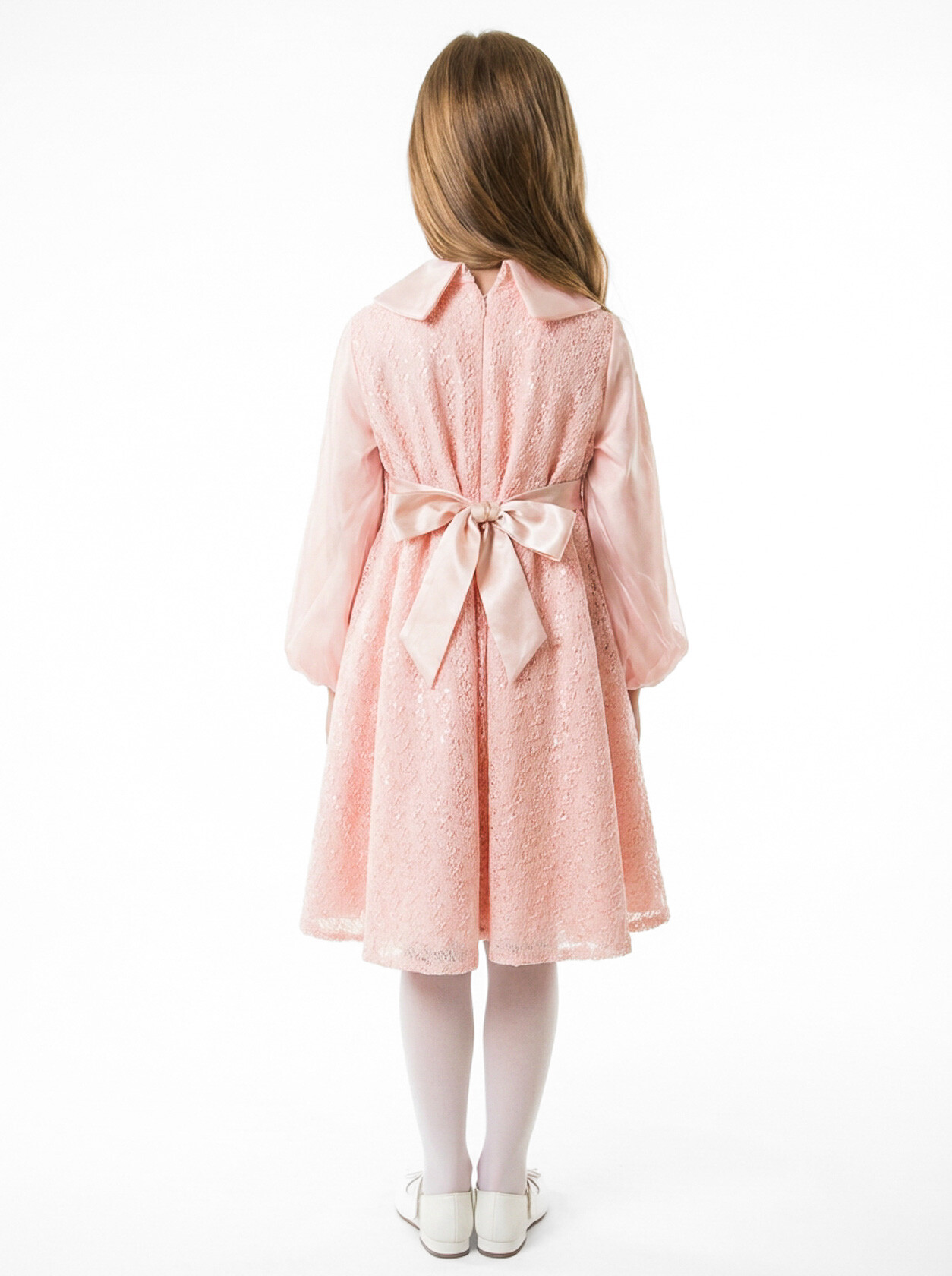 Bu zarif kız çocuk elbisesi, özel günler ve davetler için ideal bir seçimdir. Kabarık ve parlak payetli etek kısmı ile göz alıcı bir görünüm sunarken, saten uzun kollu üst kısmı elbiseye şıklık katıyor. Geniş yakası, üzerindeki küçük çiçek işlemeleriyle detaylandırılmış ve bel kısmındaki saten kurdeleyle vücuda oturan bir duruş sağlıyor. Elbise, midi boy uzunluğu ve rahat kesimiyle hem konforlu hem de stil sahibi bir parça olarak öne çıkıyor.
