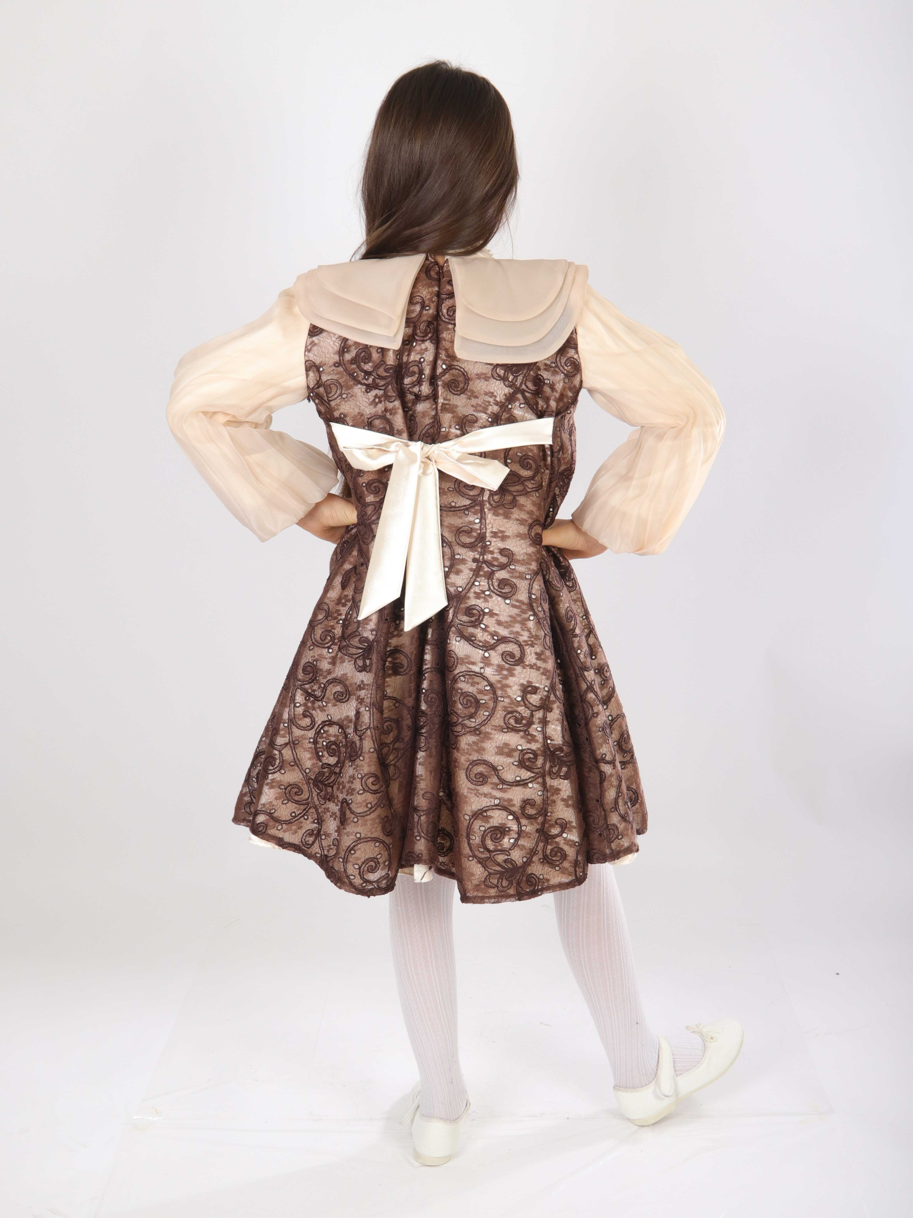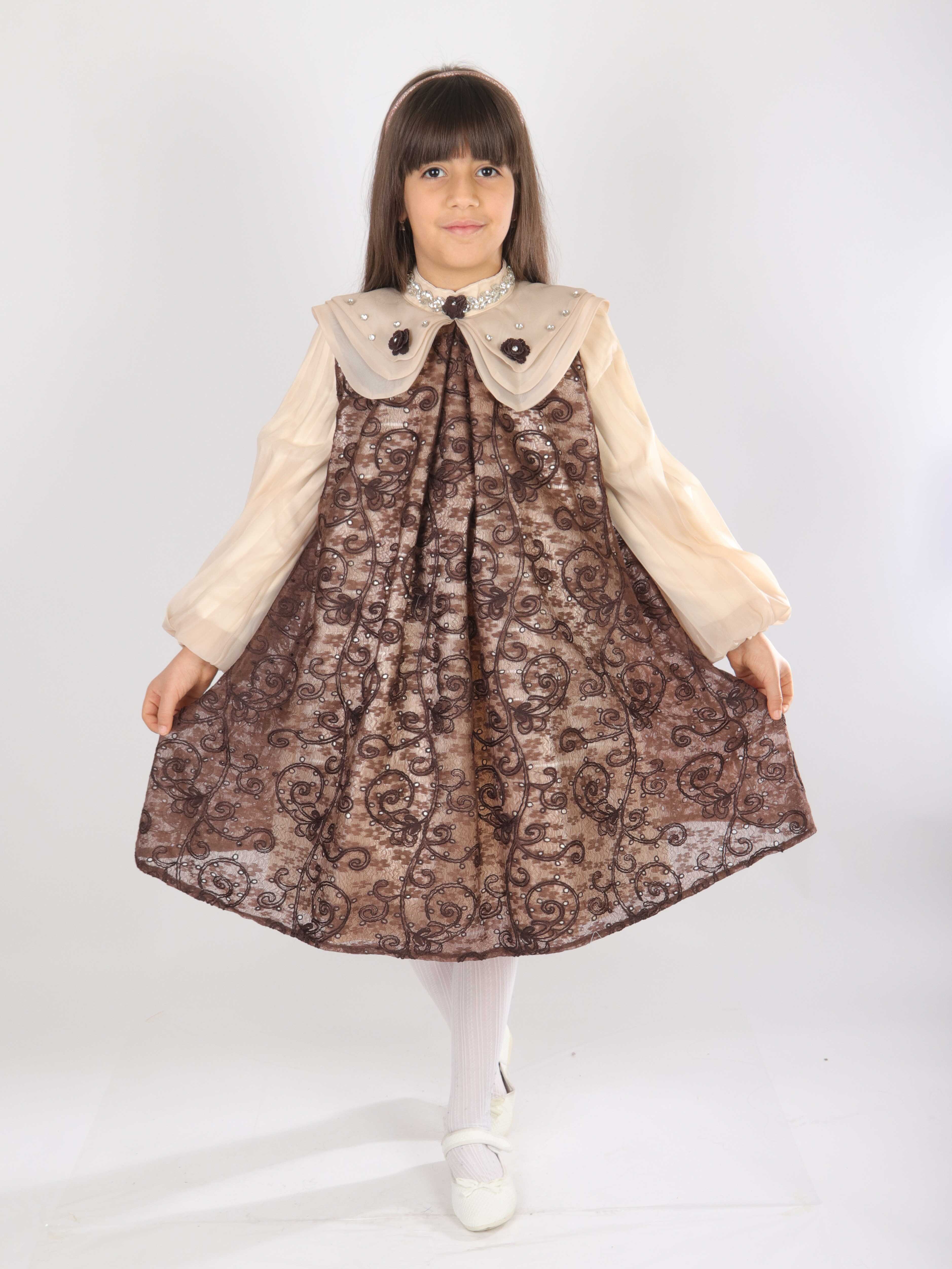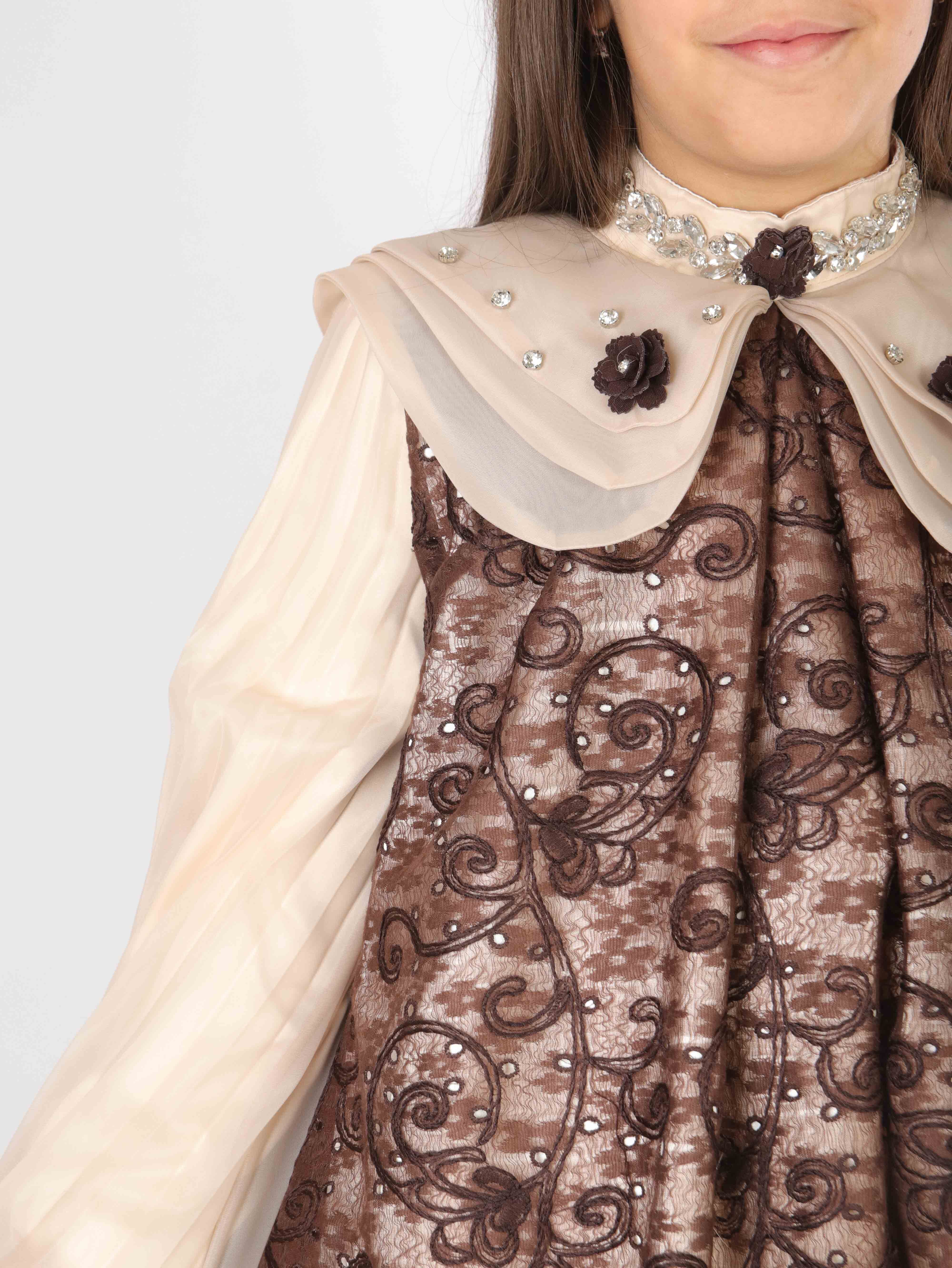 Bu şık kız çocuk elbisesi, bahar ayları için özel olarak tasarlanmış zarif bir modeldir. Uzun, pileli ve şeffaf krem renkli kollara sahip olan elbise, kahverengi işlemeli dantel dış katmanıyla dikkat çeker. Geniş, kat kat ve süslemeli yakası ile klasik ve büyüleyici bir görünüm sunar. Belde saten kurdeleyle bağlanarak hem estetik hem de rahat bir kullanım sağlar. Elbisenin midi boyu, çocukların özgürce hareket etmesine olanak tanır. Özel günler ve davetler için ideal, zarif ve şık bir seçimdir.