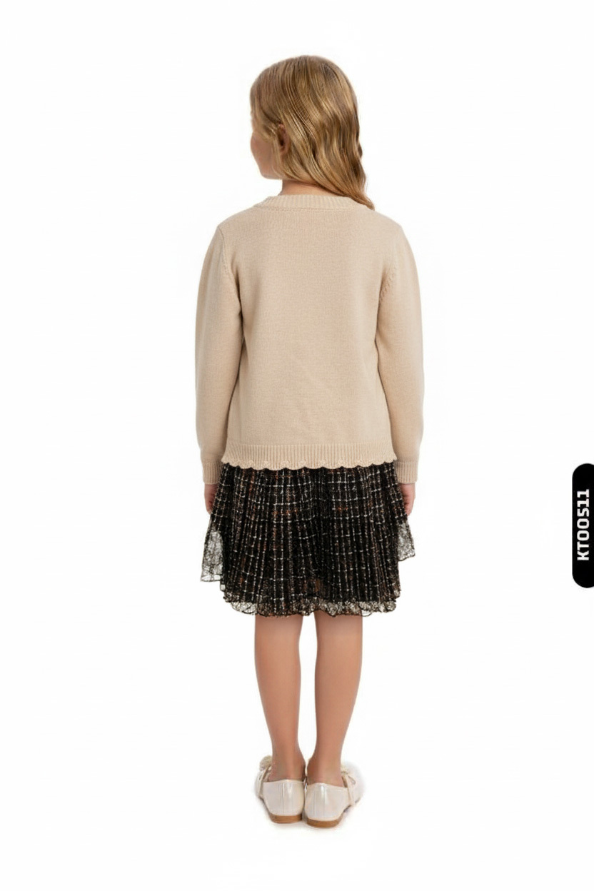 Bu kız çocuk elbisesi, kış ayları için tasarlanmış sıcak ve şık bir kombin sunar. Üst kısmı bej renkte, uzun kollu ve örgü desenli bir kazaktan oluşurken, alt kısmı siyah ve turuncu renklerin yer aldığı kareli desenli, diz hizasında, pileli bir etekten oluşmaktadır. Kazak sıfır yakalıdır ve alt uç kısmında zarif bir dalgalı kenar detayı bulunmaktadır. Elbise kapüşonsuz ve fermuarsızdır, sade ve rahat bir modeldir. Günlük ve özel anlar için ideal, hem sıcak tutan hem de şık görünüm sağlayan bir tasarımdır.