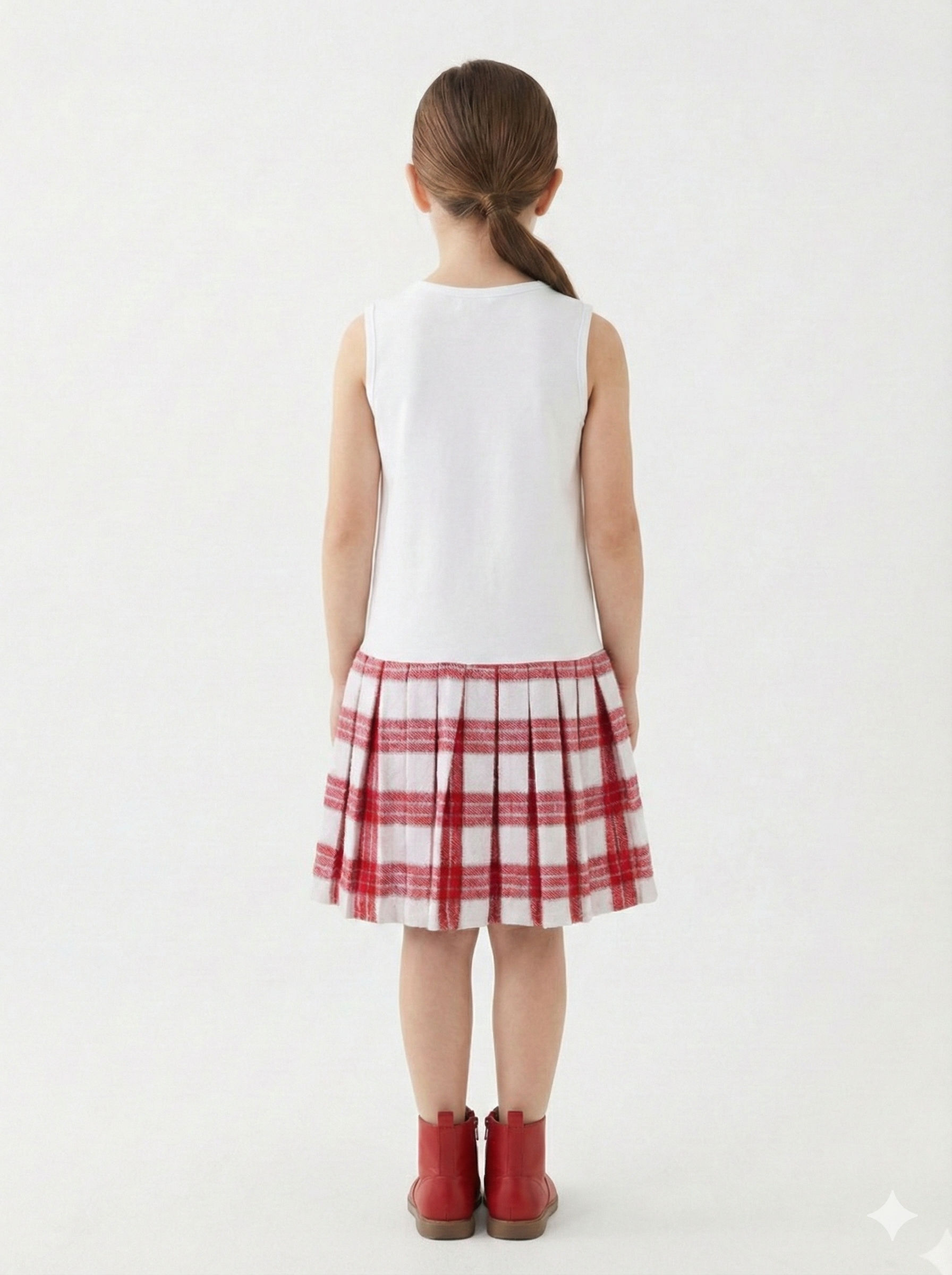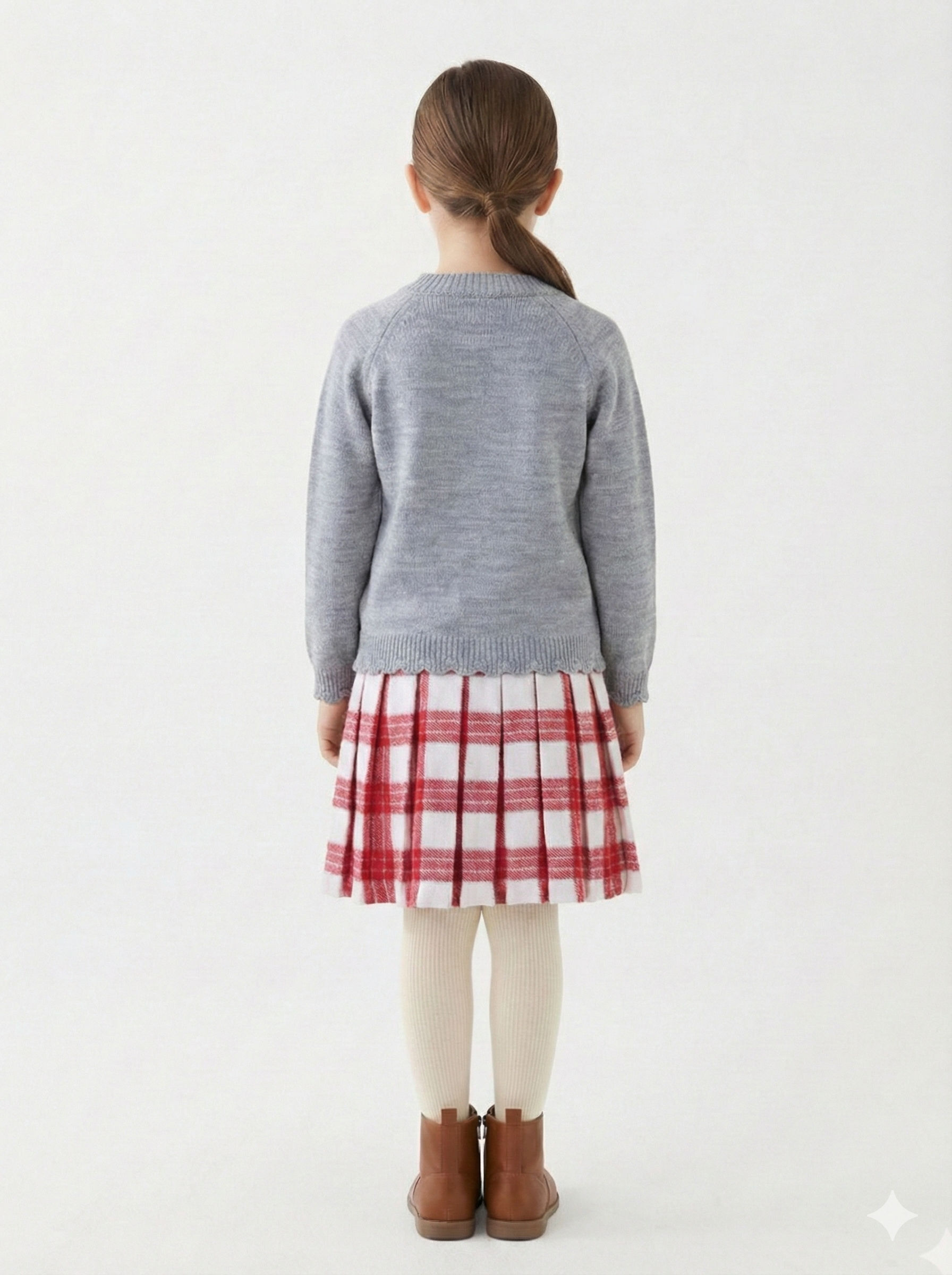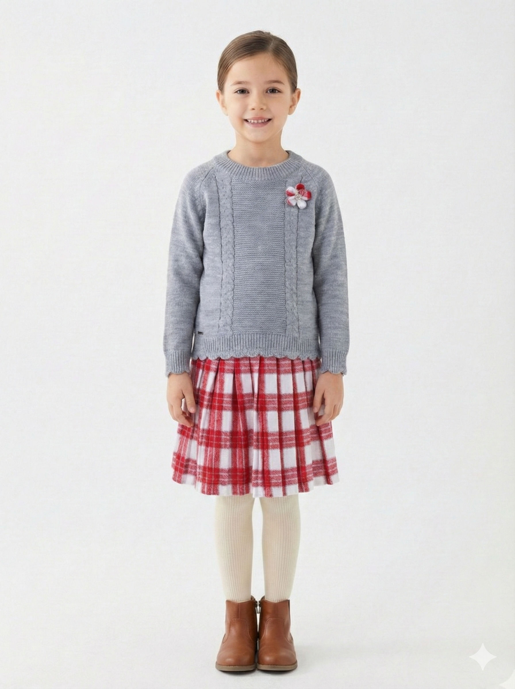 Bu kız çocuk elbisesi, kış sezonu için sıcak ve şık bir seçimdir. Gri renkte, uzun kollu ve sıfır yaka olan üst kısmı, örgü detayları ve çiçek aksesuarıyla sade ama zarif bir görünüm sunar. Elbisenin etek kısmı ise kırmızı ve beyaz renkte kareli, pileli ve midi uzunluktadır. Kombin, krem rengi kalın çoraplar ve kahverengi botlarla tamamlanmıştır. Günlük ve özel günler için ideal, rahat ve şık bir modeldir.