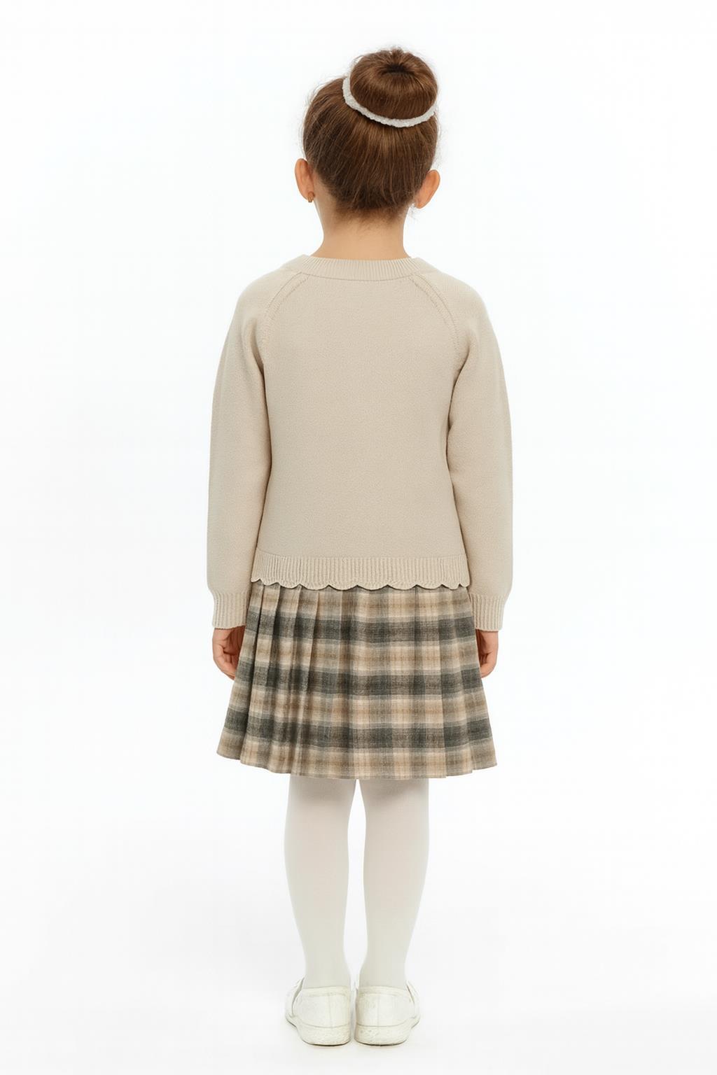 Bu kız çocuk elbisesi, kış sezonu için ideal sıcaklık ve konfor sunar. Bej renkli, uzun kollu ve sıfır yakalı üst kısmı, yumuşak dokusuyla rahat bir kullanım sağlar. Etek kısmında ise bej, gri ve kahverengi tonlarında kareli, pileli bir tasarım bulunur. Elbisenin alt ucu ve kol manşetlerinde dalgalı bir örgü detayı dikkat çeker. Göğüs kısmında şık bir siyah çiçek aksesuarı bulunmaktadır. Midi boy uzunluğu ve klasik tarzıyla günlük ve özel günler için uygun, zarif bir seçenektir.