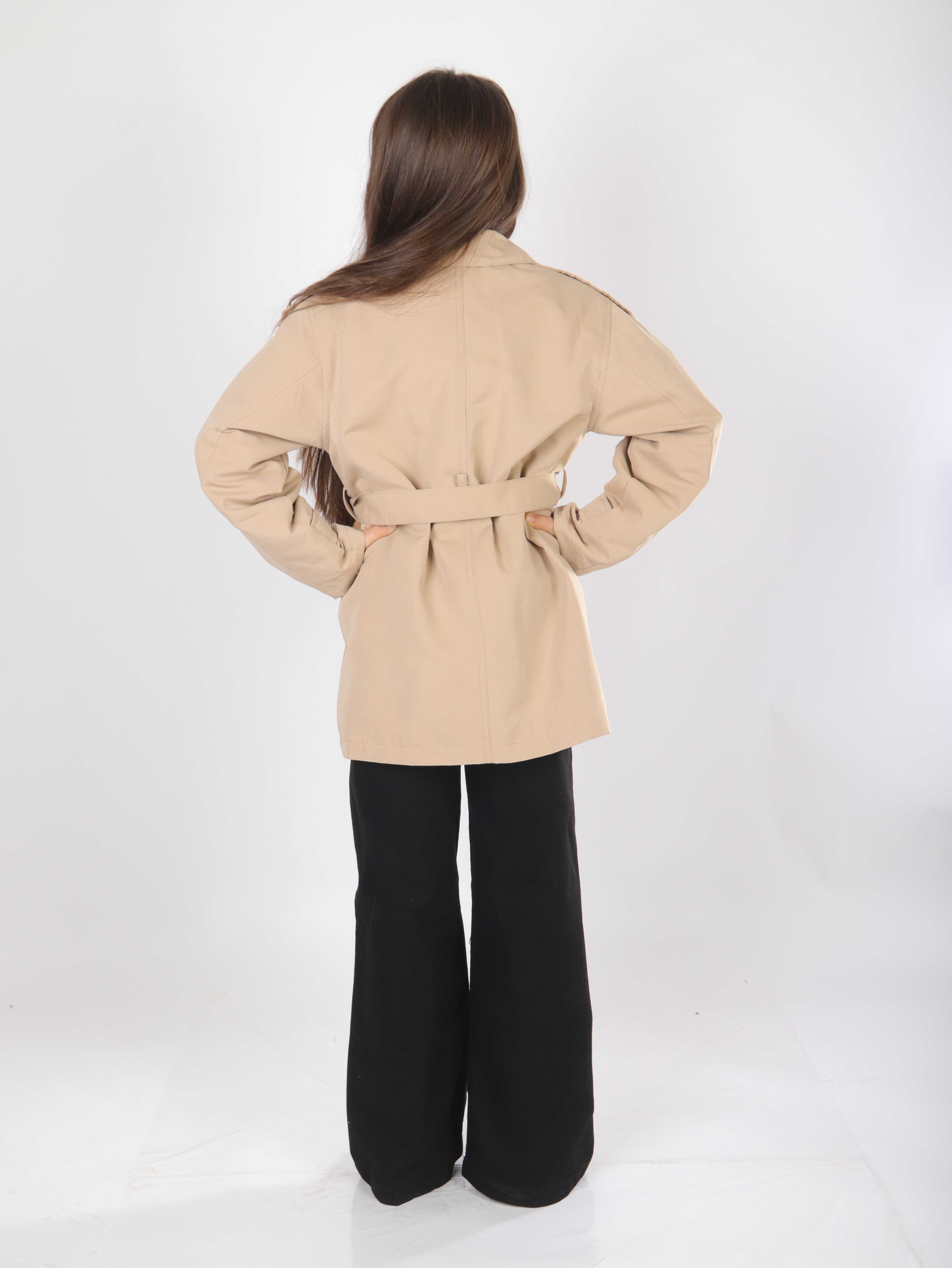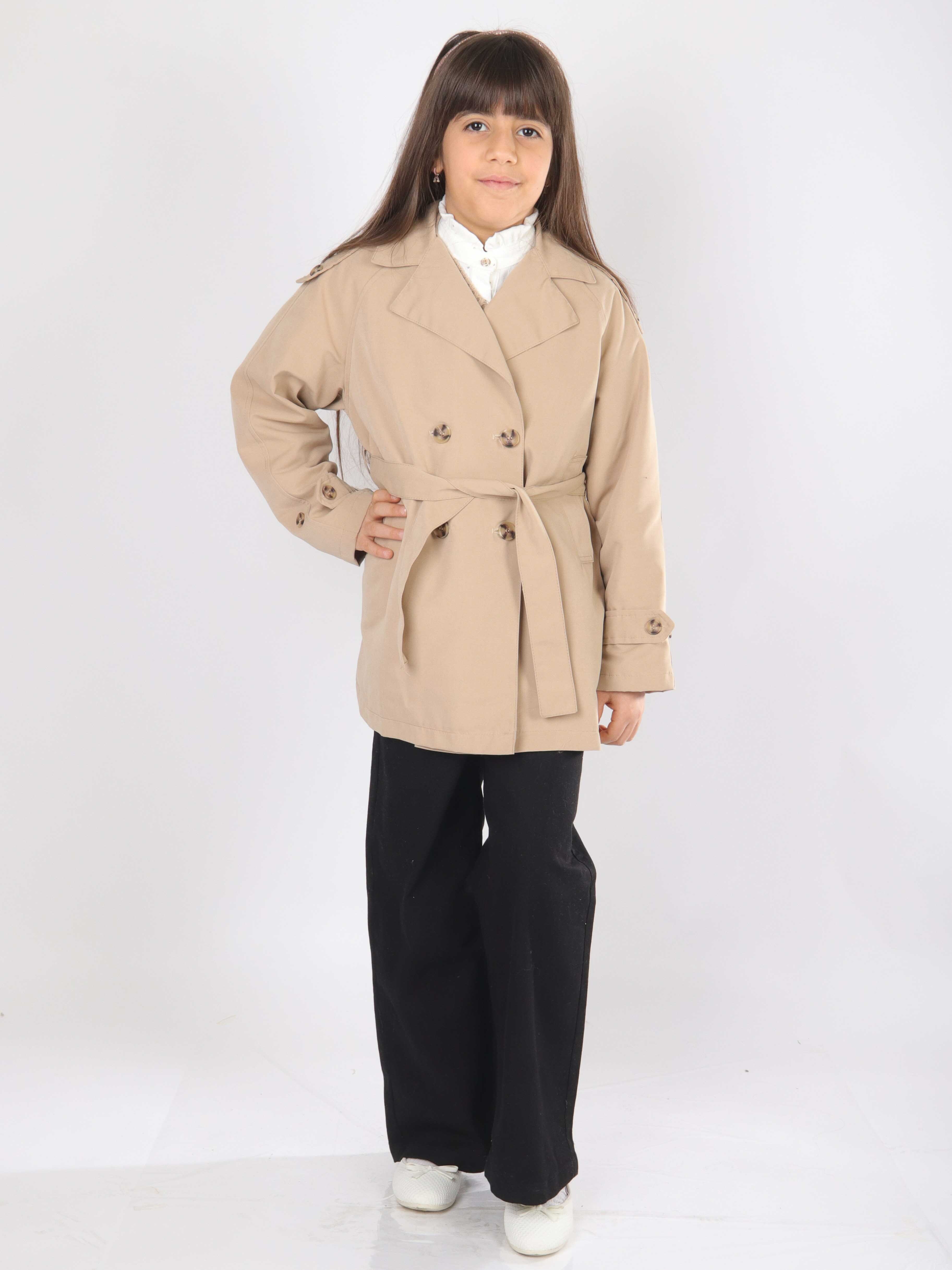 Bu bej renkli kız çocuk trençkot, bahar ayları için şık ve kullanışlı bir dış giyim seçeneği sunuyor. Kapüşonsuz ve çift düğmeli tasarıma sahip olan bu trençkot, bel kısmındaki kuşak detayıyla zarif bir görünüm sağlıyor. Uzun kollu ve klasik yaka yapısıyla, hem günlük hem de özel kullanımlar için ideal. Yan cepler ve kol manşetlerindeki düğmeler detaylara şıklık katarken, midi uzunluğu çocukların hareket özgürlüğünü koruyor.