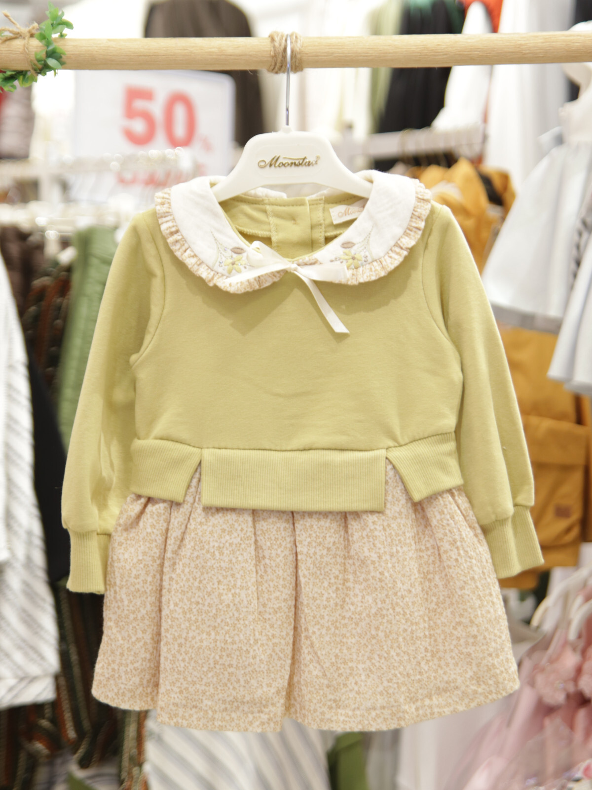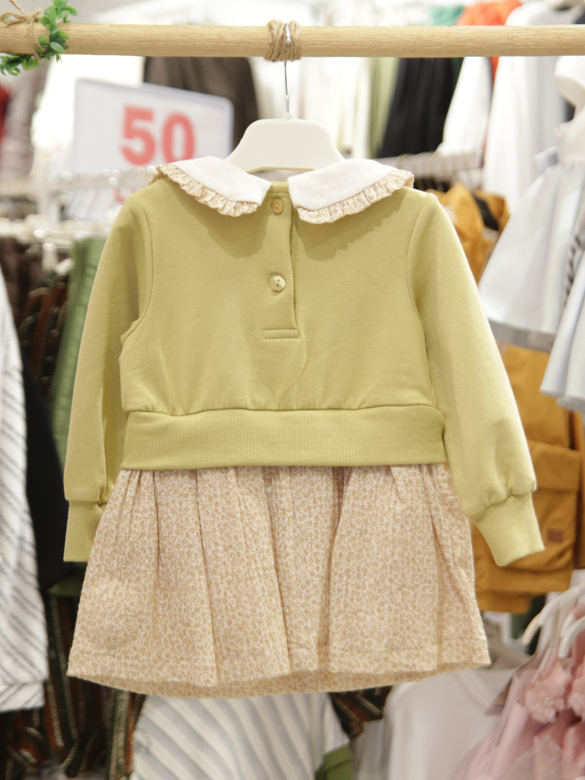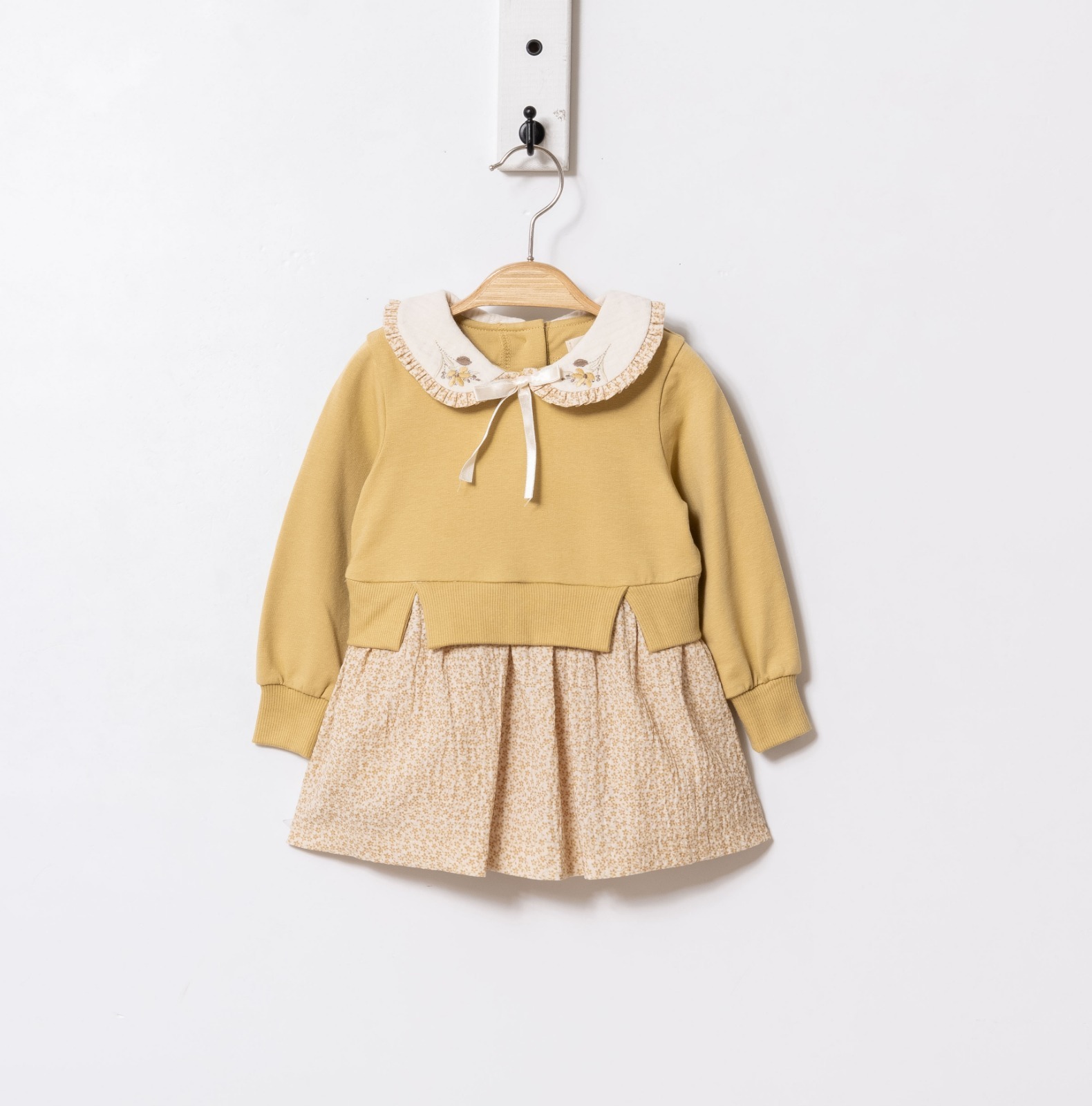 Bu kız çocuk elbisesi, konforlu ve şık bir tasarımla kış aylarına özel olarak hazırlandı. Hardal tonlarında üst kısmı, uzun kollu ve rahat kesimiyle çocukların hareket özgürlüğünü destekler. Alt kısmında ince çiçek desenli kumaş, elbiseye narin ve sevimli bir hava katar. Fırfırlı, işlemeli beyaz yakası ve küçük kurdelesi detaylara zarafet katarken, beli oturan model hareket halinde bile elbisenin yerinde kalmasını sağlar.