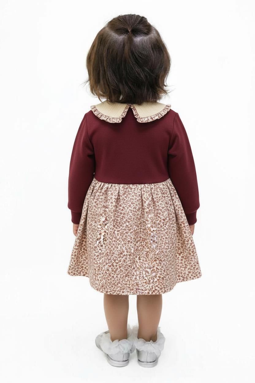 Bu kız çocuk elbisesi, konforlu ve şık bir tasarımla kış aylarına özel olarak hazırlandı. Hardal tonlarında üst kısmı, uzun kollu ve rahat kesimiyle çocukların hareket özgürlüğünü destekler. Alt kısmında ince çiçek desenli kumaş, elbiseye narin ve sevimli bir hava katar. Fırfırlı, işlemeli beyaz yakası ve küçük kurdelesi detaylara zarafet katarken, beli oturan model hareket halinde bile elbisenin yerinde kalmasını sağlar.