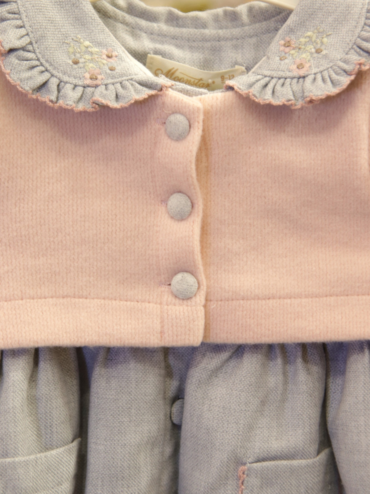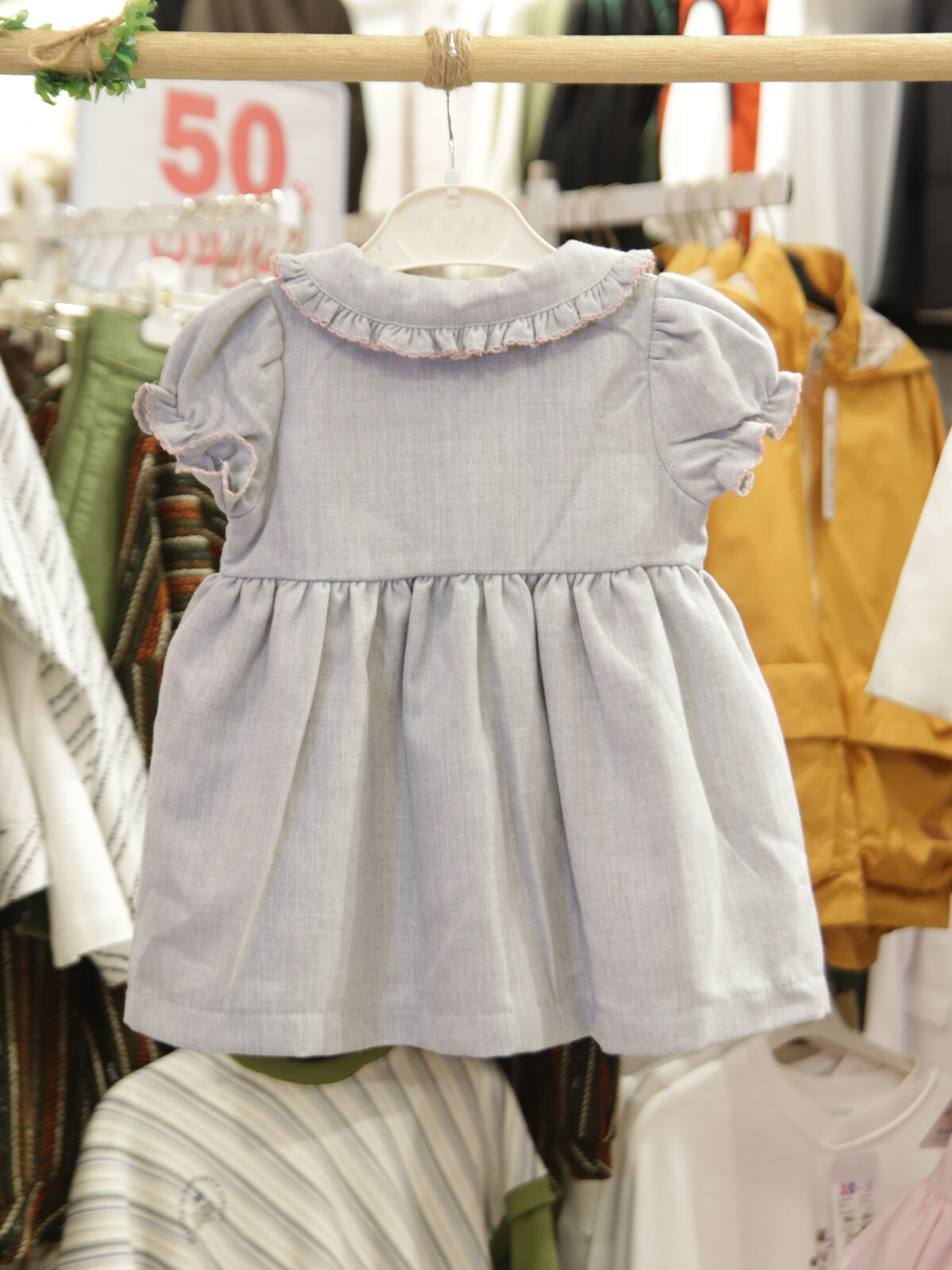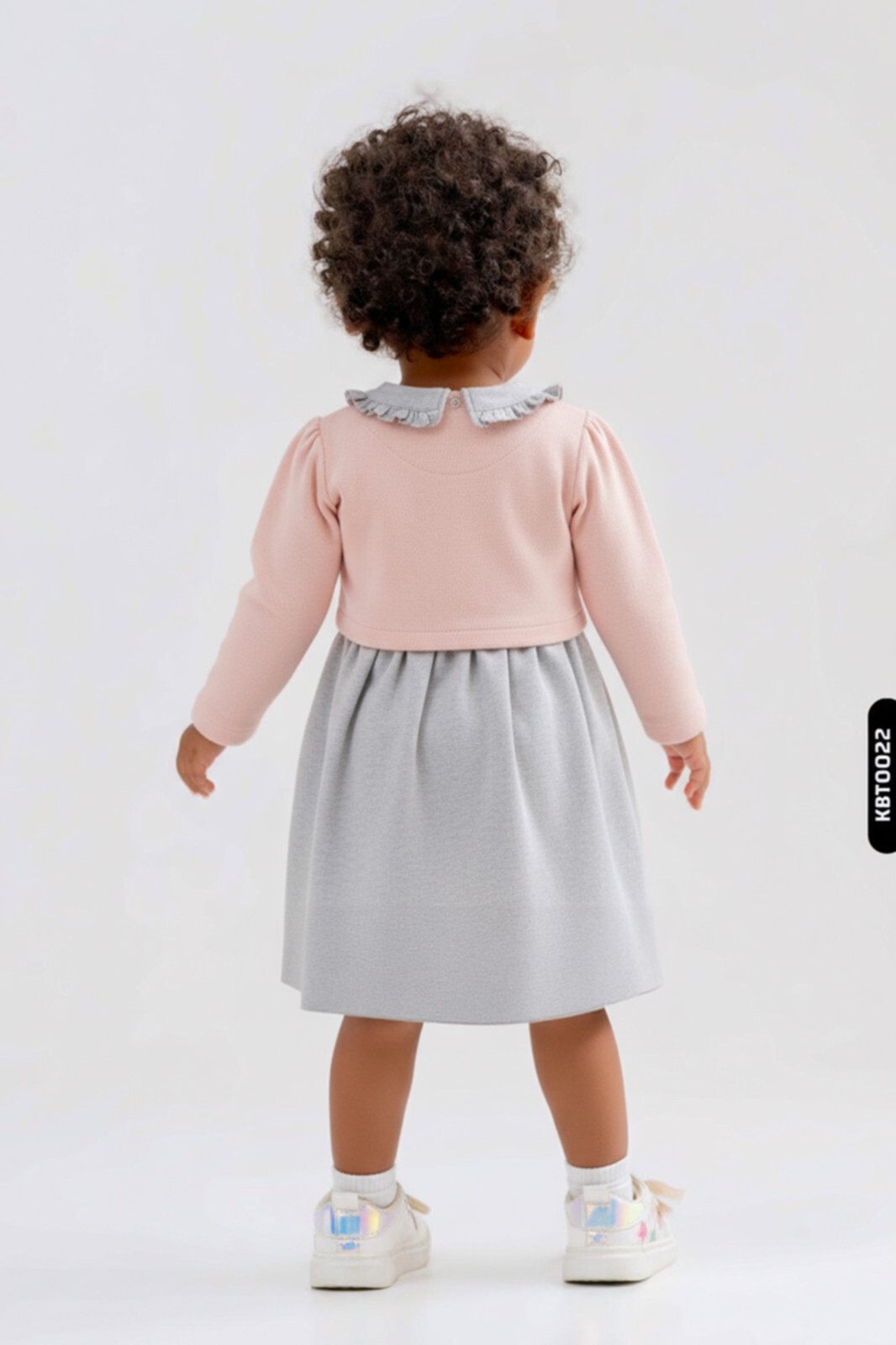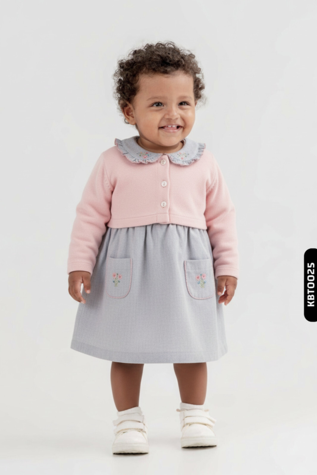 Bu şık kız çocuk elbisesi, kış sezonu için özel olarak tasarlanmıştır. Üst kısmı yumuşak pembe kumaştan olup, uzun kollu ve düğmeli bir yapıya sahiptir. Elbisenin gri alt kısmı midi boyda ve cepli, ön cep detaylarında ise küçük çiçek nakışları bulunur. Gri fırfırlı ve nakışlı yaka, elbiseye zarif ve sevimli bir görünüm katmaktadır. Rahat kesimi ve kaliteli kumaşı sayesinde çocukların hareket özgürlüğünü kısıtlamadan şıklık sunar.