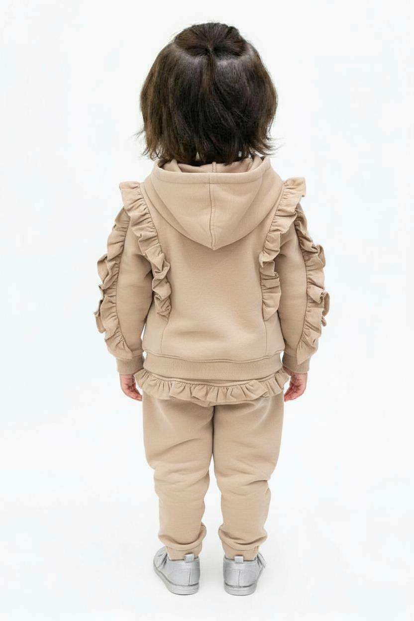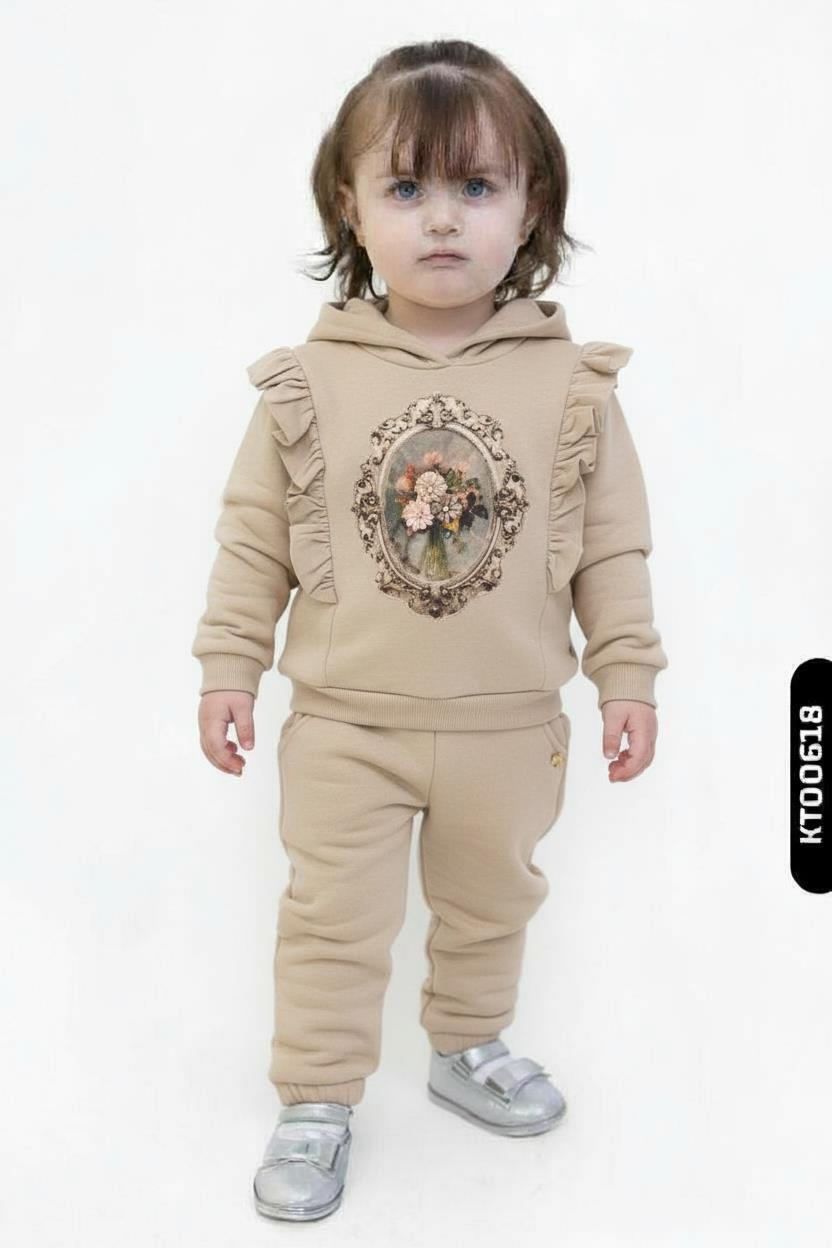 Bu kız çocuk eşofman takımı, kış ayları için ideal sıcaklıkta ve rahatlıkta tasarlanmıştır. Kapüşonlu üst, ön yüzünde zarif çiçek desenli bir çerçeve baskısına sahiptir ve omuzlardan kollara doğru uzanan fırfır detaylarıyla süslenmiştir. Takım, fermuarsız, cepsiz ve kordon kullanmayan sade bir yapıya sahiptir. Uzun kollu ve bileklerde lastikli, rahat bir kesime sahip olan üst, bisiklet yaka tasarımındadır. Alt pantolon ise paçalarda lastikli ve rahat hareket etmeye uygun şekilde tasarlanmıştır. Bej tonundaki rengiyle hem şık hem de günlük kullanıma uygundur.