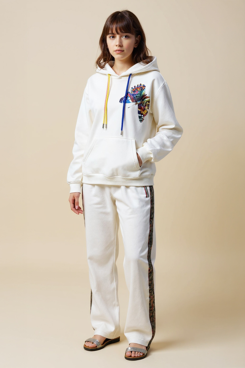Bu kız çocuk eşofman takımı, rahatlığı ve şıklığı bir araya getiriyor. Kapüşonlu sweatshirt modelinde, farklı renklerde bağcıklar ve canlı renkli kelebek baskısı dikkat çekiyor. Sweatshirt, kanguru cebine sahip ve uzun kollu olarak tasarlanmıştır. Alt kısmında ise paça manşetli, yanlarda desenli şerit detayları bulunan bol kesim eşofman altı bulunuyor. Takım, kış sezonu için ideal kalınlıkta ve sıcak tutan kumaştan üretilmiştir.