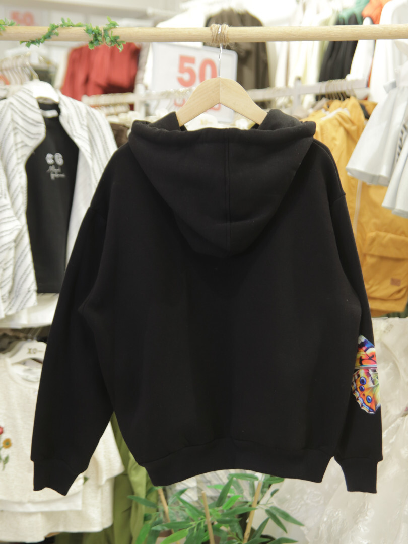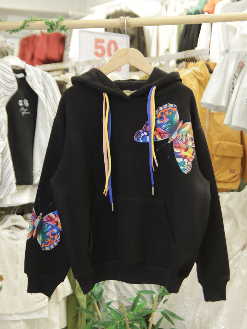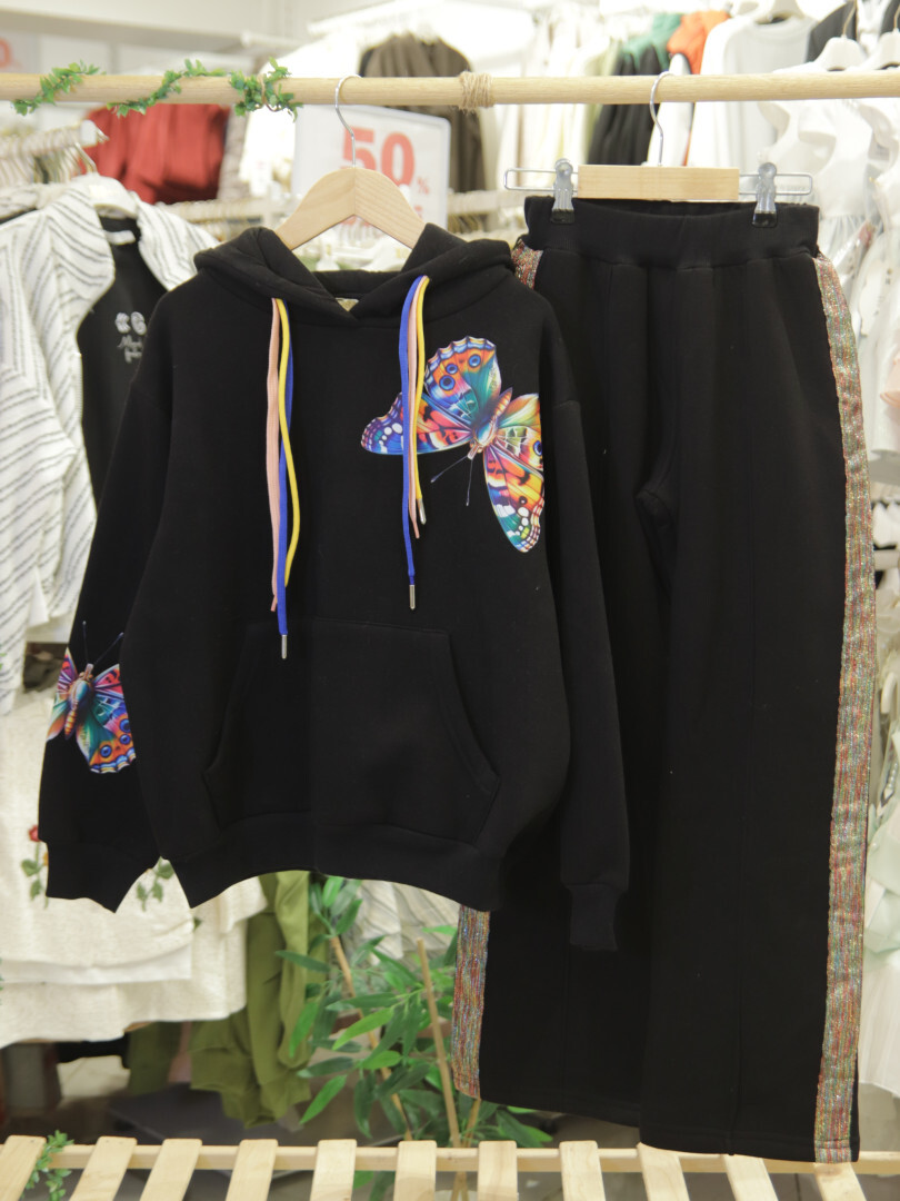 Bu kız çocuk eşofman takımı, rahatlığı ve şıklığı bir araya getiriyor. Kapüşonlu sweatshirt modelinde, farklı renklerde bağcıklar ve canlı renkli kelebek baskısı dikkat çekiyor. Sweatshirt, kanguru cebine sahip ve uzun kollu olarak tasarlanmıştır. Alt kısmında ise paça manşetli, yanlarda desenli şerit detayları bulunan bol kesim eşofman altı bulunuyor. Takım, kış sezonu için ideal kalınlıkta ve sıcak tutan kumaştan üretilmiştir.