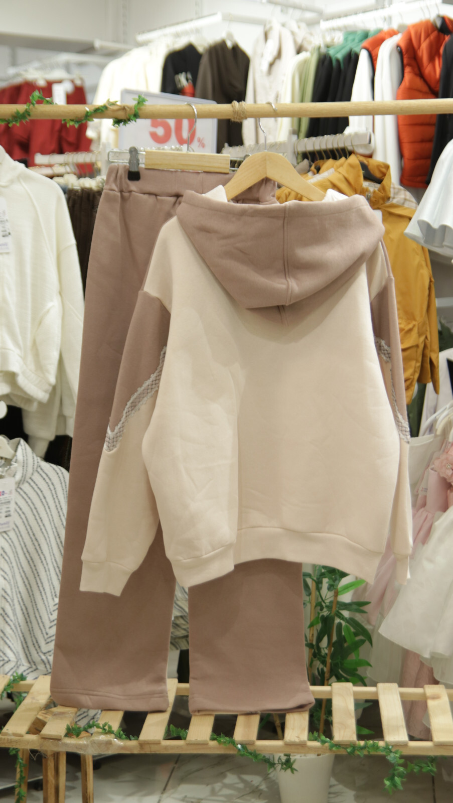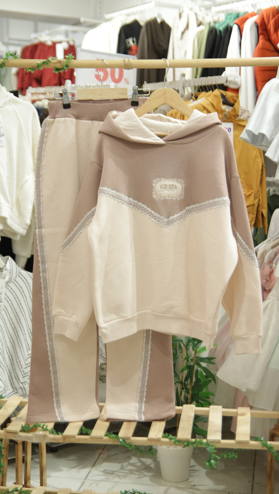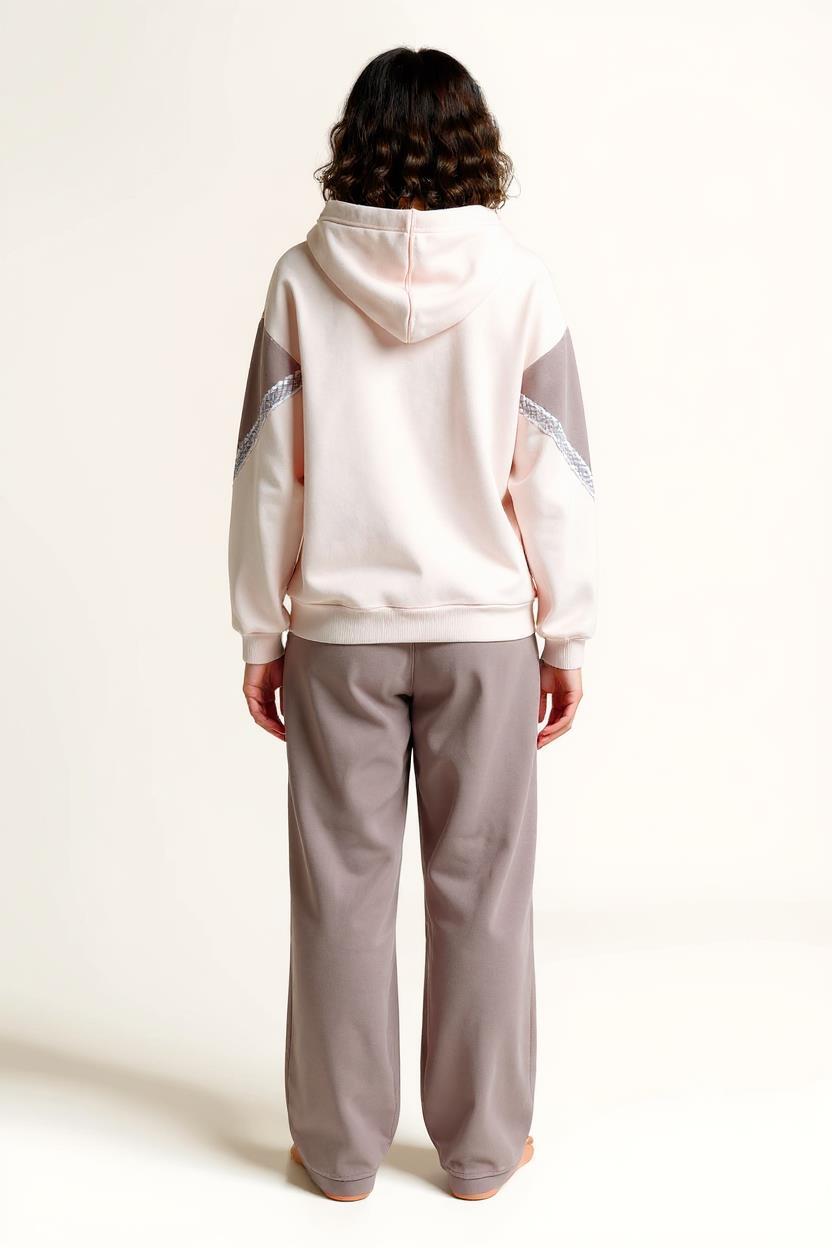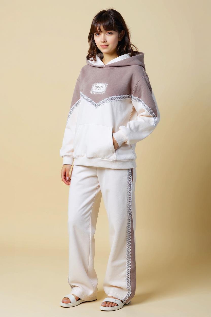 Bu kız çocuk eşofman takımı, hem şık hem rahat tasarımıyla kış aylarının favorisi olacak. Kapüşonlu üst kısmı ve uzun kollu yapısıyla soğuk havalarda ekstra koruma sağlar. Fermuar yerine kapüşonuyla uyumlu sade bir modeldir. Ön kısımda cepli kanguru tarzı cepler bulunur. Takımın üstünde ve pantolonun yanlarında zarif dantel detayları mevcuttur, bu da kıyafete feminen bir dokunuş katıyor. Pantolonlar bol kesim ve uzun paça şeklindedir. Renk olarak bej ve kahverenginin yumuşak tonları kullanılmıştır. Rahat ve sade tarzıyla günlük kullanım için idealdir.