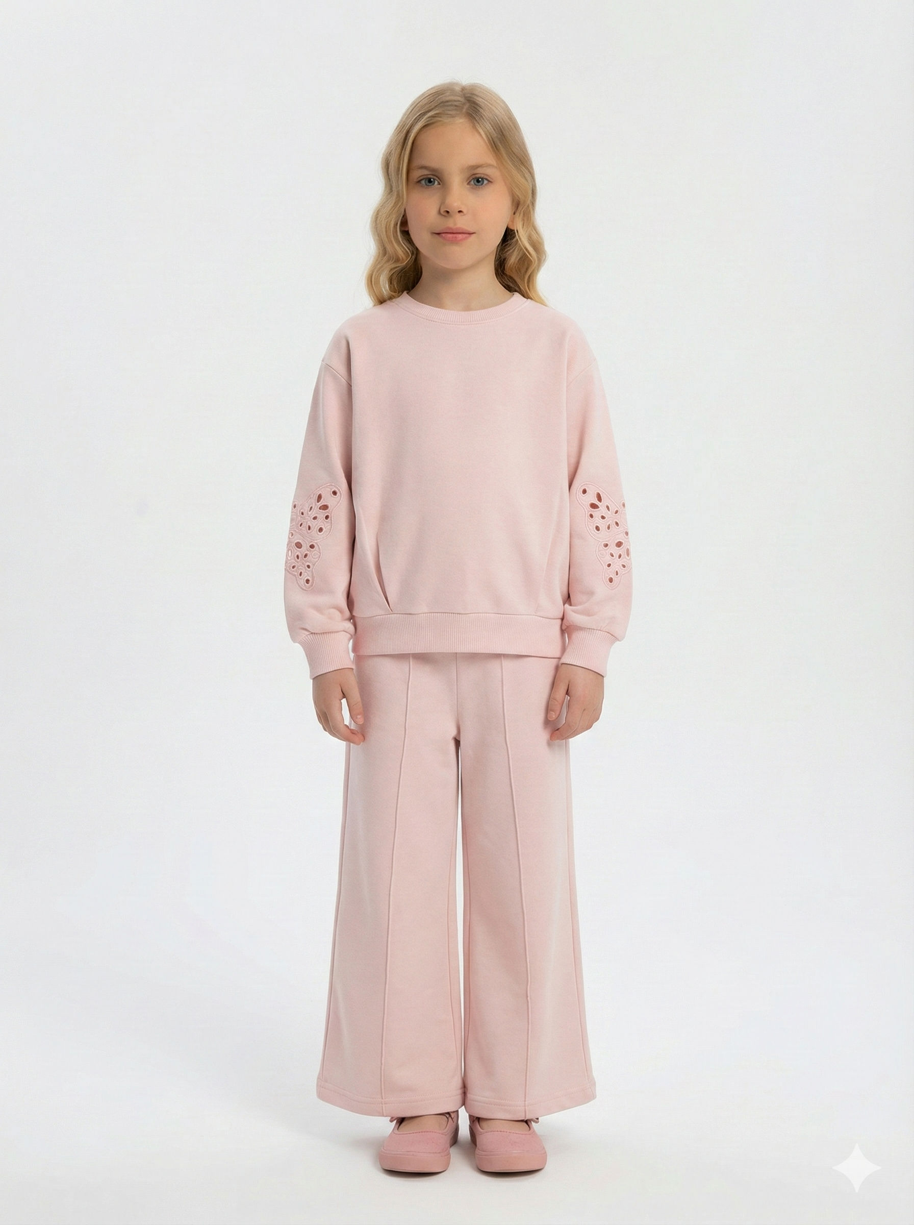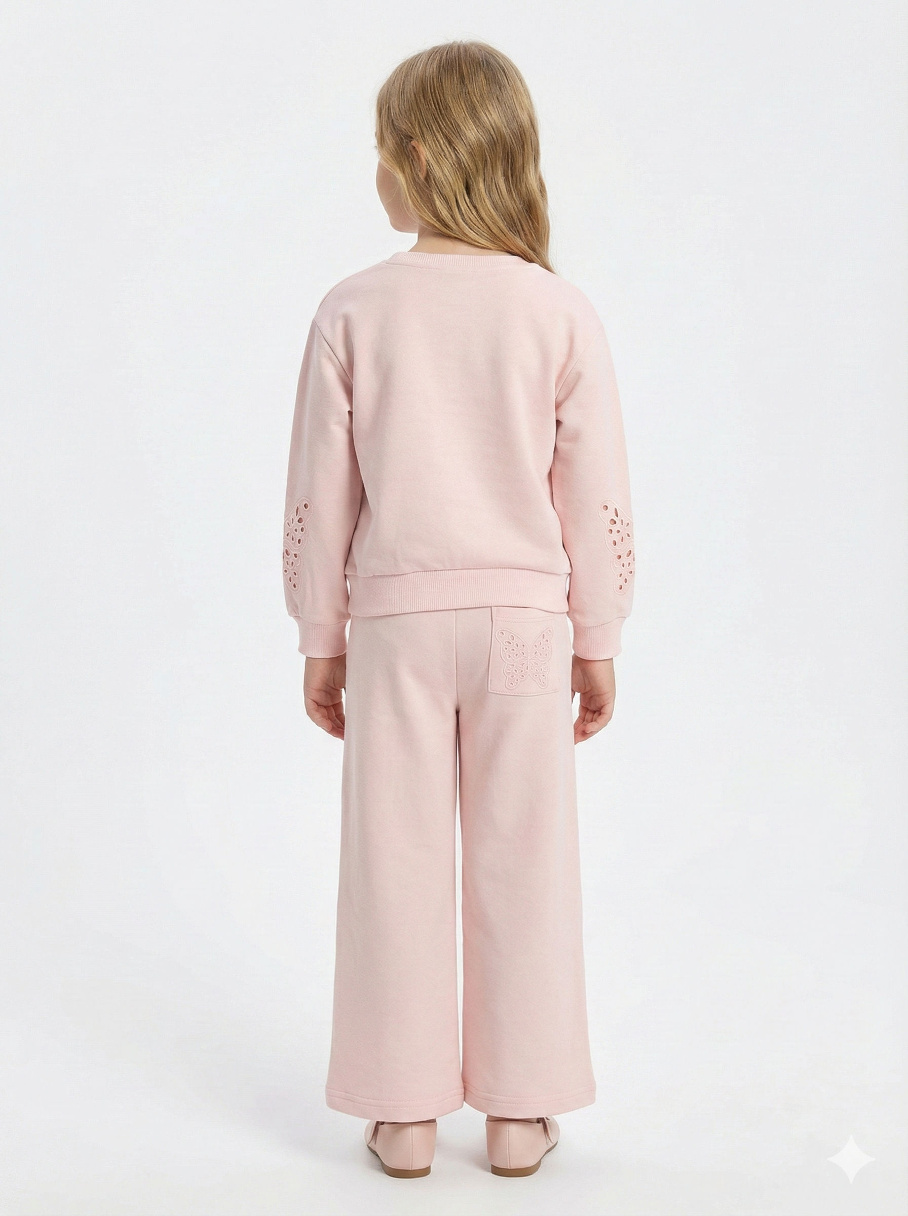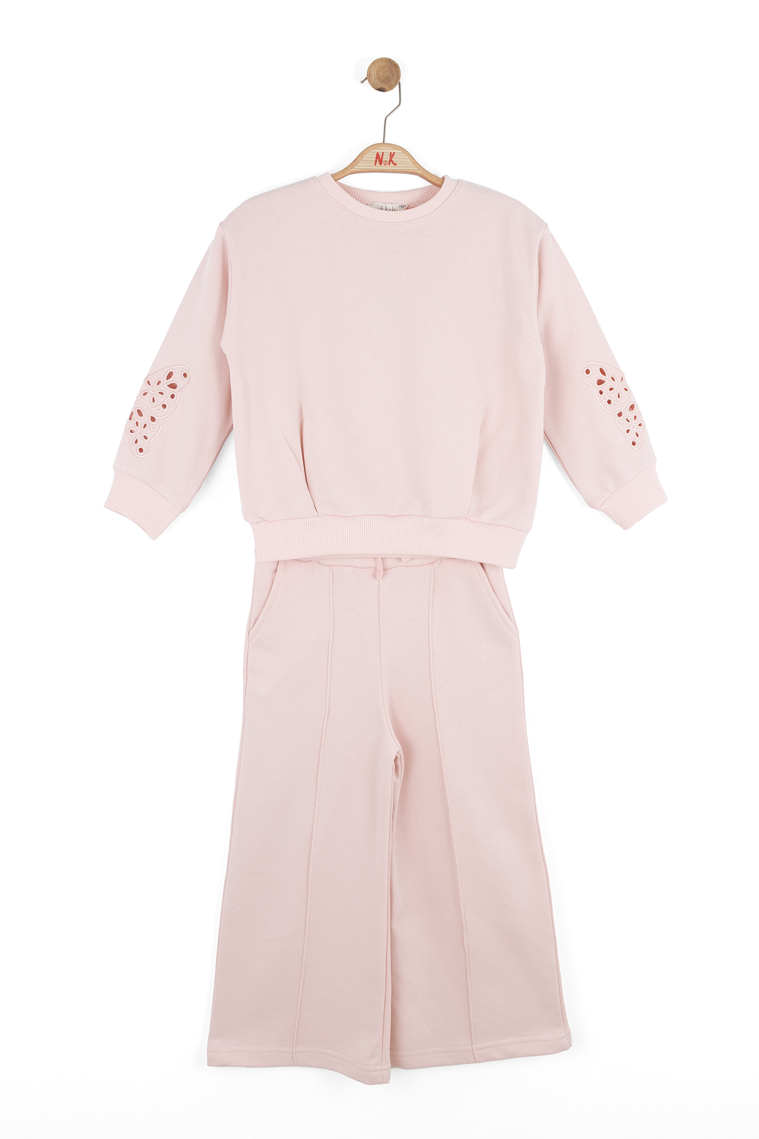 Bu pembe kız çocuk eşofman takımı, rahatlığı ve şıklığı bir arada sunar. Kapüşonsuz olan üst, sıfır yaka tasarımıyla sade ve kullanışlıdır. Uzun kollu olan üstte, kol bölümlerinde kelebek şeklinde delikli süslemeler bulunur. Alt kısmı ise bol kesim ve midi boydadır, bel kısmında kordon detayına sahiptir. Eşofmanın arka tarafında küçük bir cep üzerinde de kelebek motifi işlenmiştir. Günlük kullanım için ideal, hem spor hem casual tarzda kombinlenebilir.