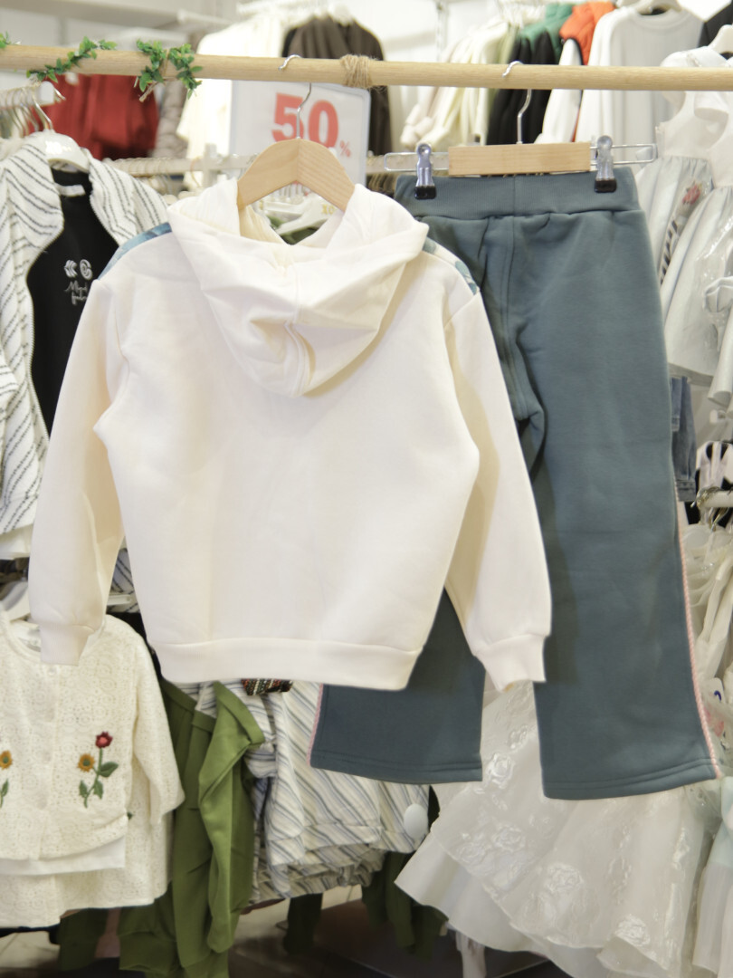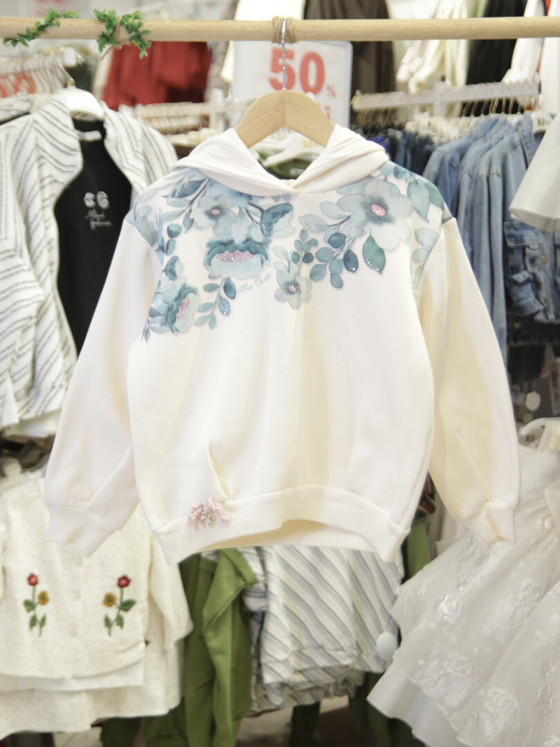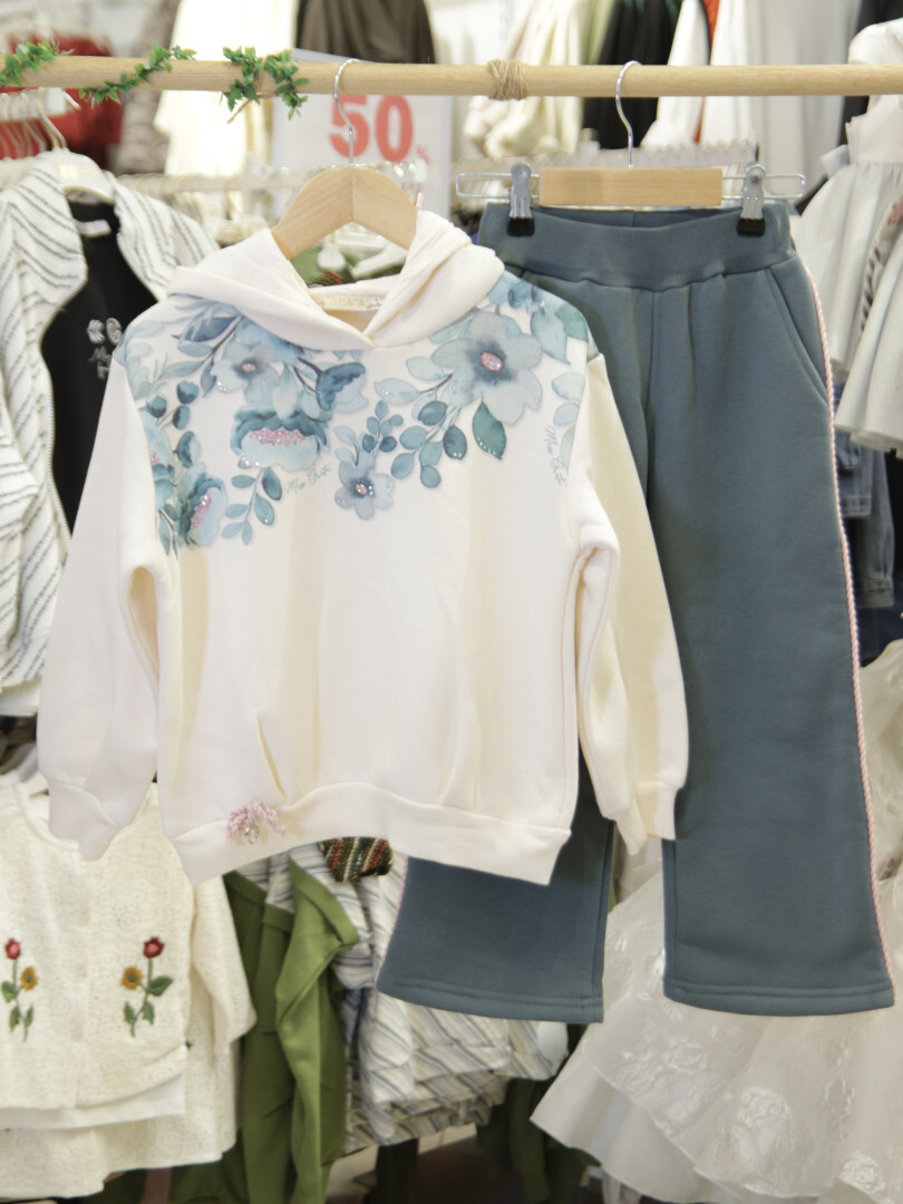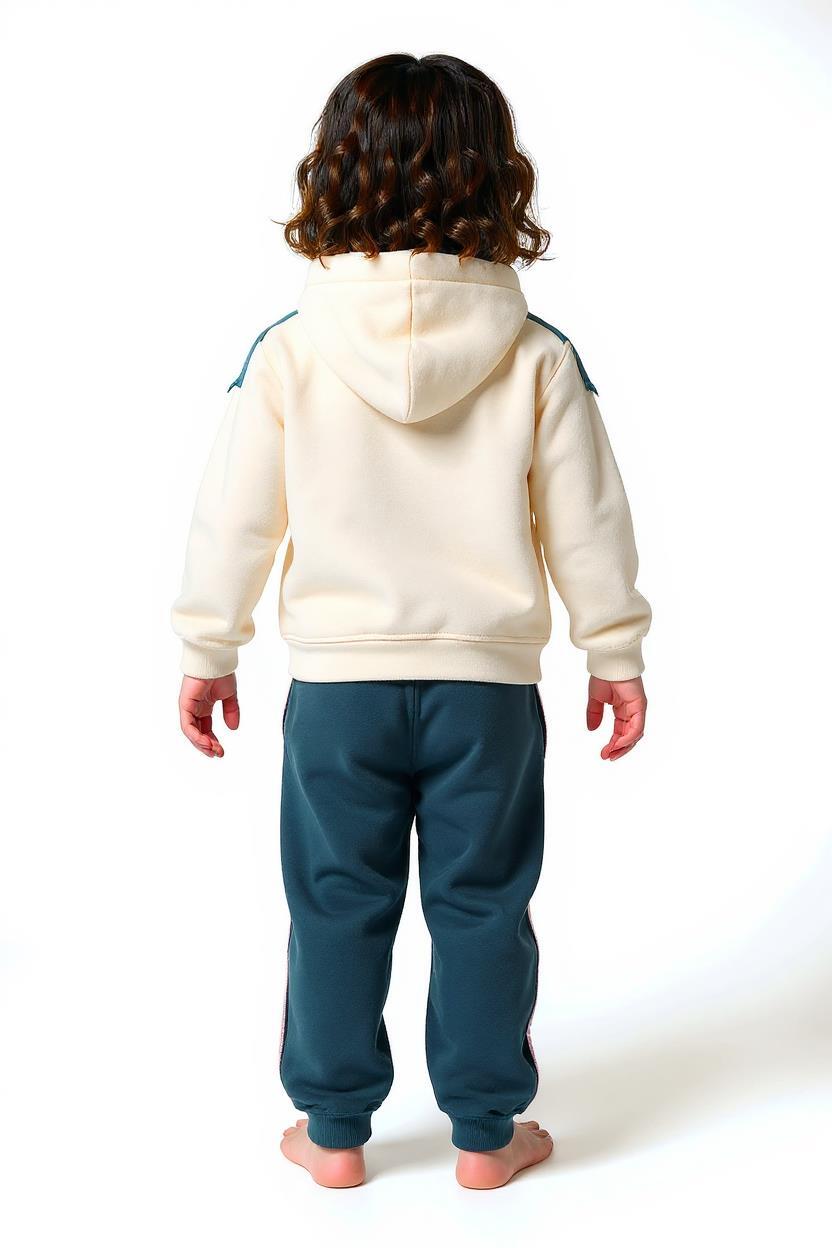 Bu kız çocuk eşofman takımı, kış ayları için ideal, rahat ve şık bir seçimdir. Üst parça kapüşonlu olup, fermuarsız ve önü cepli tasarlanmıştır. Uzun kollu, ekru renginde üst kısmında mavi tonlarında çiçek desenleri bulunmaktadır. Alt parça ise lacivert renkte, lastikli paçalı ve rahat kesimdir. Takım, kordon detayı olmadan sade ama şık bir görünüm sunar. Günlük kullanıma uygun, modern ve spor tarzda tasarlanmıştır.