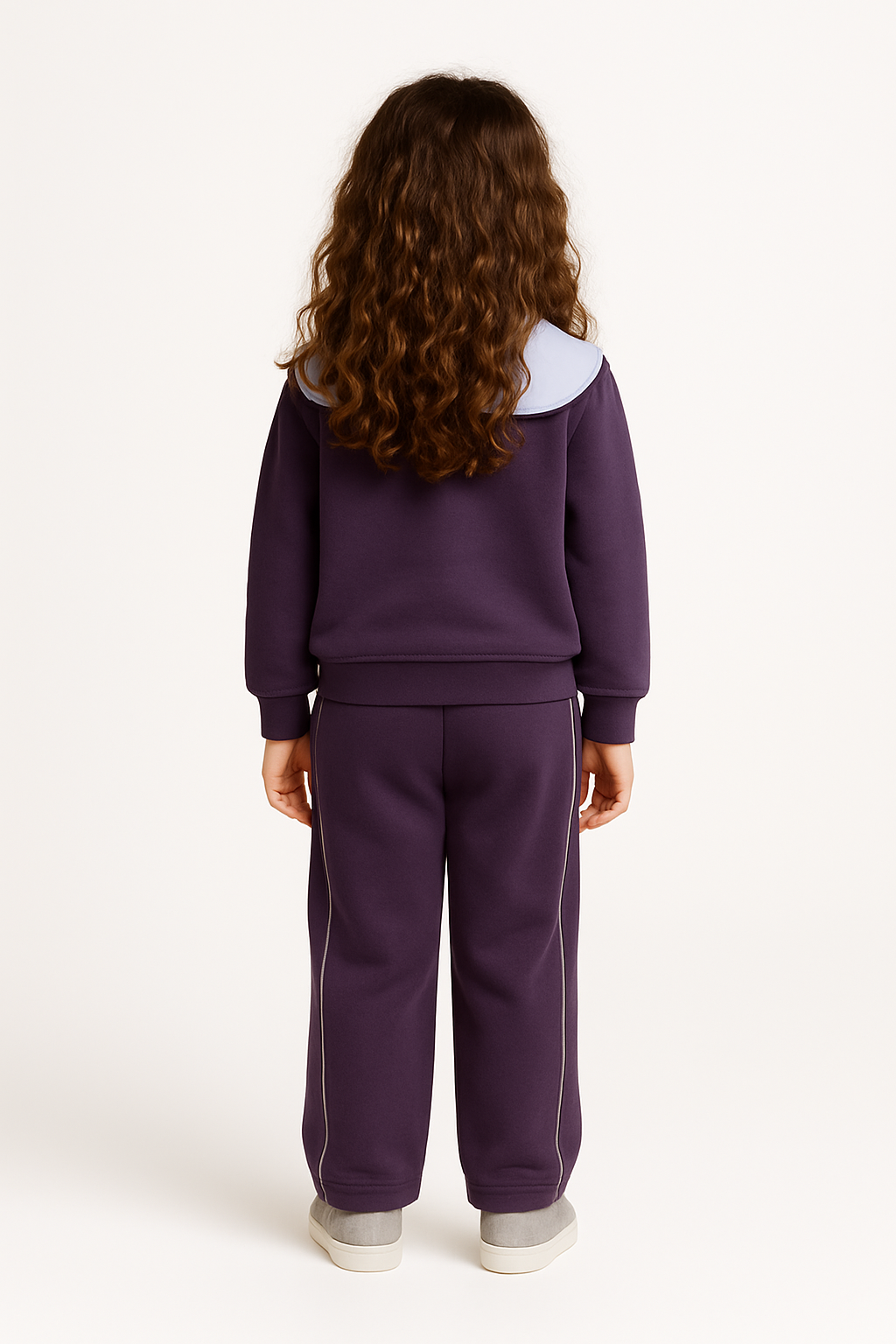 Bu kız çocuk eşofman takımı, şık ve rahat tasarımıyla kış aylarında vazgeçilmez bir tercih olacak. Takım, fermuarlı üst kısmı ve kendine has büyük yaka detayı ile dikkat çekiyor. Uzun kollu üst, ön kısmında üç boyutlu çiçek süslemeleriyle süslenmiş. Bol kesim eşofman altı, yanlarda ince beyaz çizgiler ve kordonlu bel detayıyla sportif ve konforlu bir kullanım sunuyor. Takımın bordo rengi, kış koleksiyonuna sıcaklık katarken, yumuşak kumaşı çocukların rahat hareket etmesini sağlıyor.