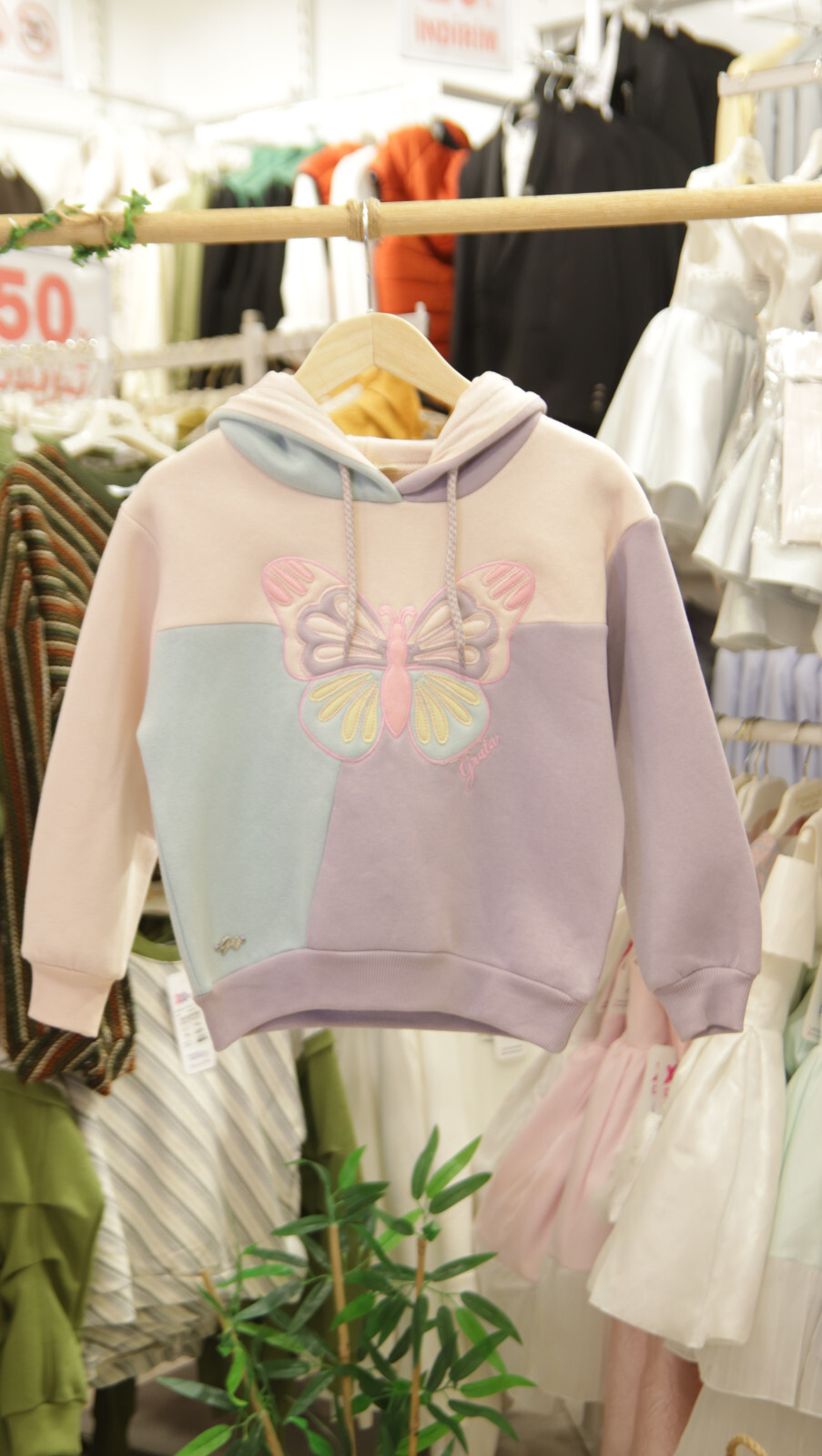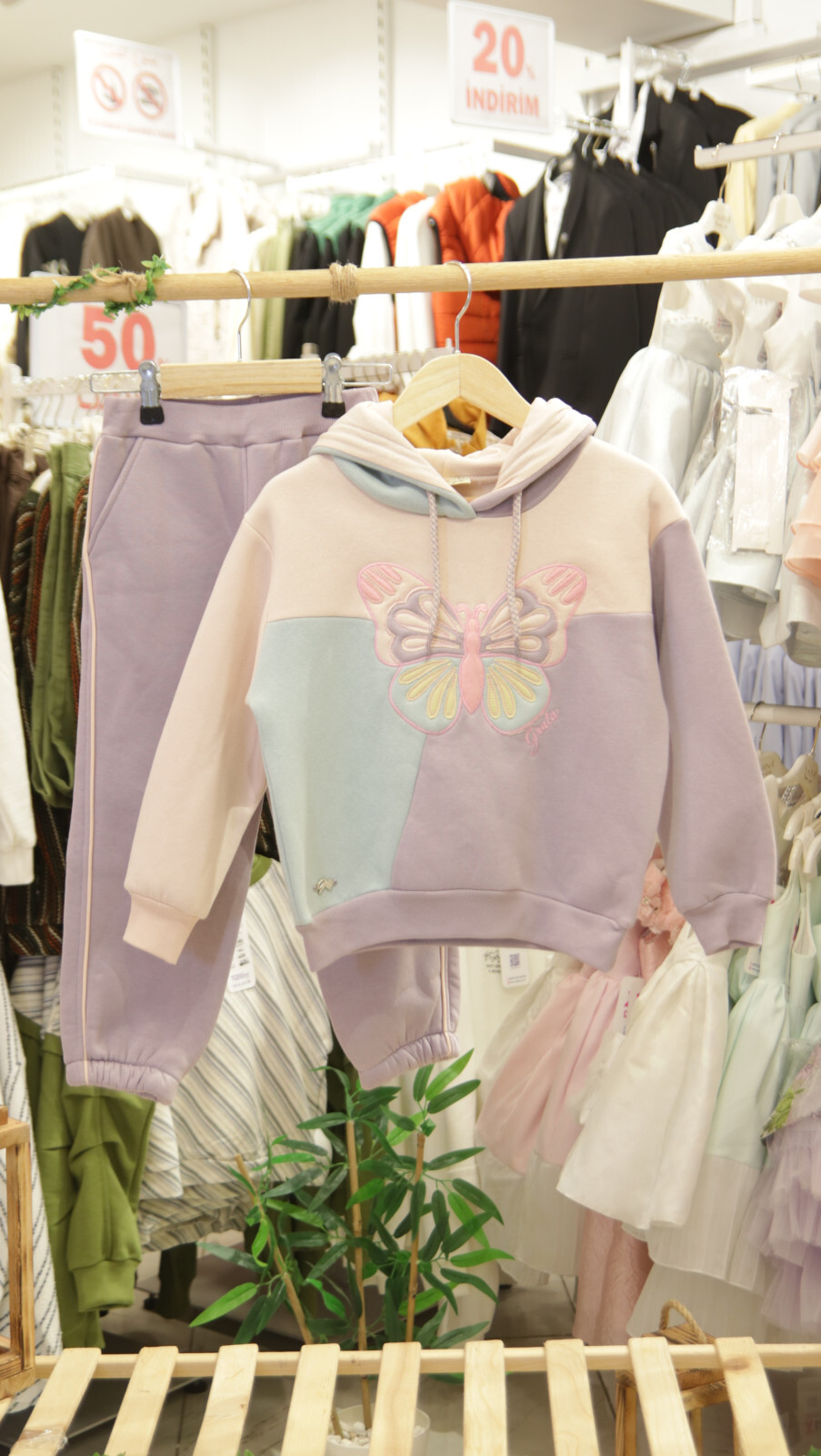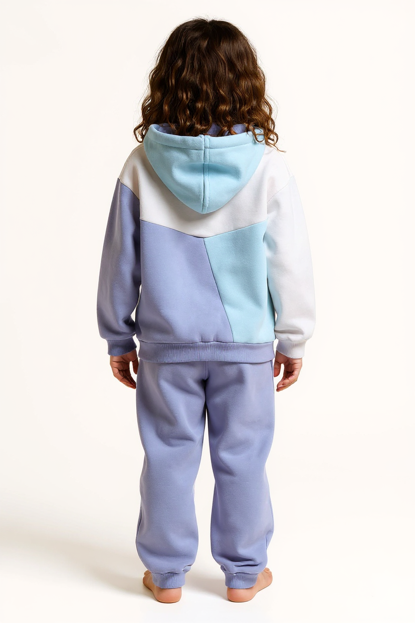 Kız çocukları için mükemmel bir eşofman takımı! Bu rahat ve şık tasarım, kış sezonunda sıcak kalmalarını sağlarken, aynı zamanda şıklık katıyor. Kapüşonlu üst kısmı, farklı tonlarda mavi ve beyaz renk kombinasyonu ile dikkat çekiyor. Ön kısımda yumuşak bir kelebek deseni bulunmaktadır. Alt kısım ise lastikli bel bandıyla rahat bir oturuş sağlıyor.