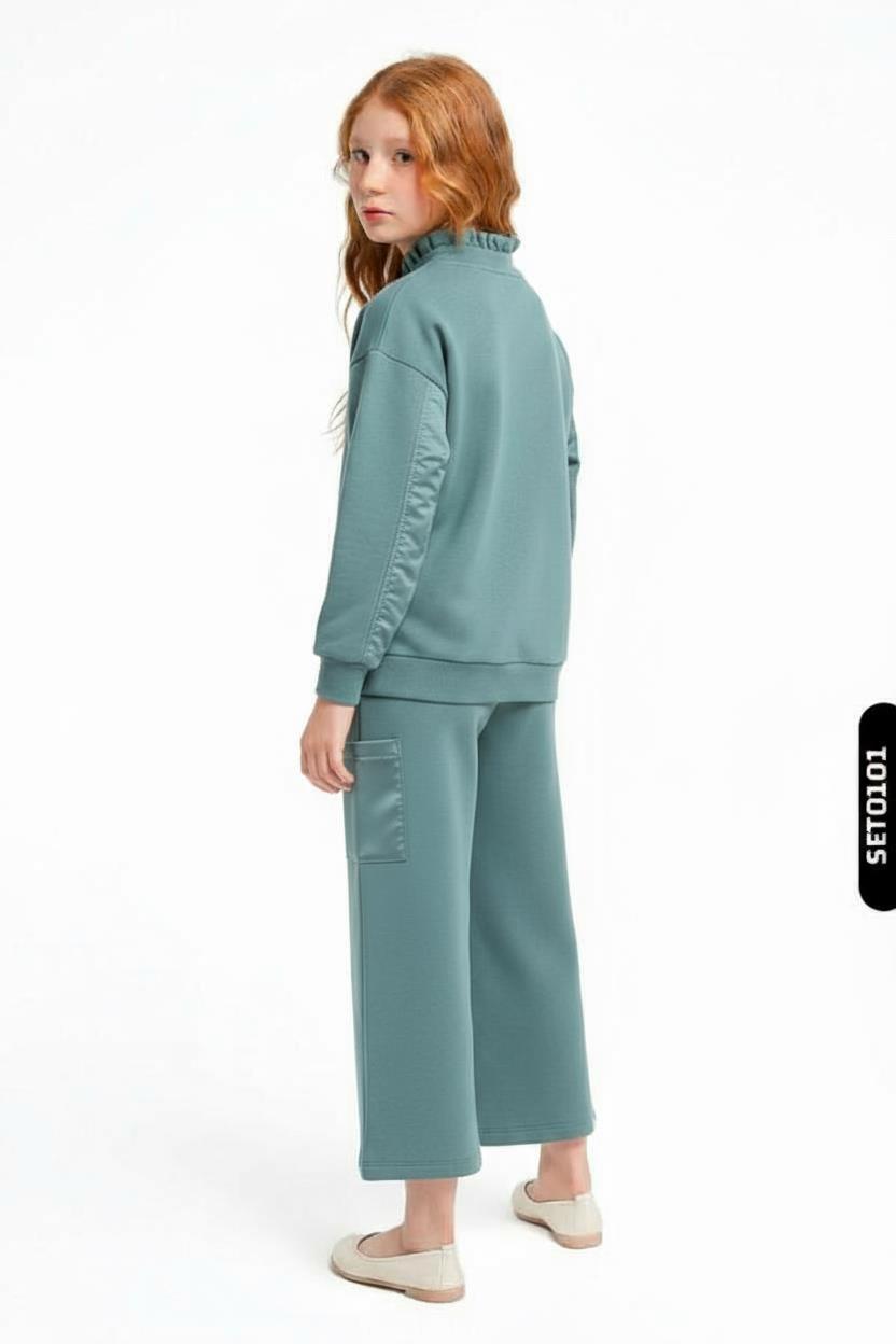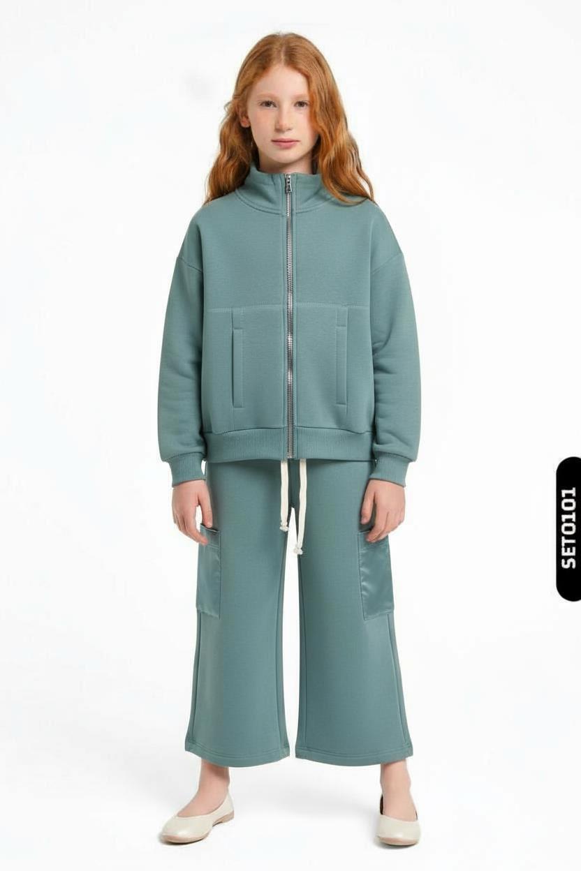 Bu kız çocuk eşofman takımı, kış ayları için ideal sıcaklık ve rahatlık sunar. Mint renginde tasarlanan takımın üstü fermuarlı ve yüksek yakalıdır, kapüşonsuzdur. Uzun kollu ve kol kısımlarında parlak kumaş detayları vardır. Alt kısmı bol paça, midi boyda ve yanlarda kullanışlı ceplerle donatılmıştır. Bel kısmında ayarlanabilir beyaz kordon bulunur. Minimalist ve modern tasarımıyla günlük kullanıma uygundur.
